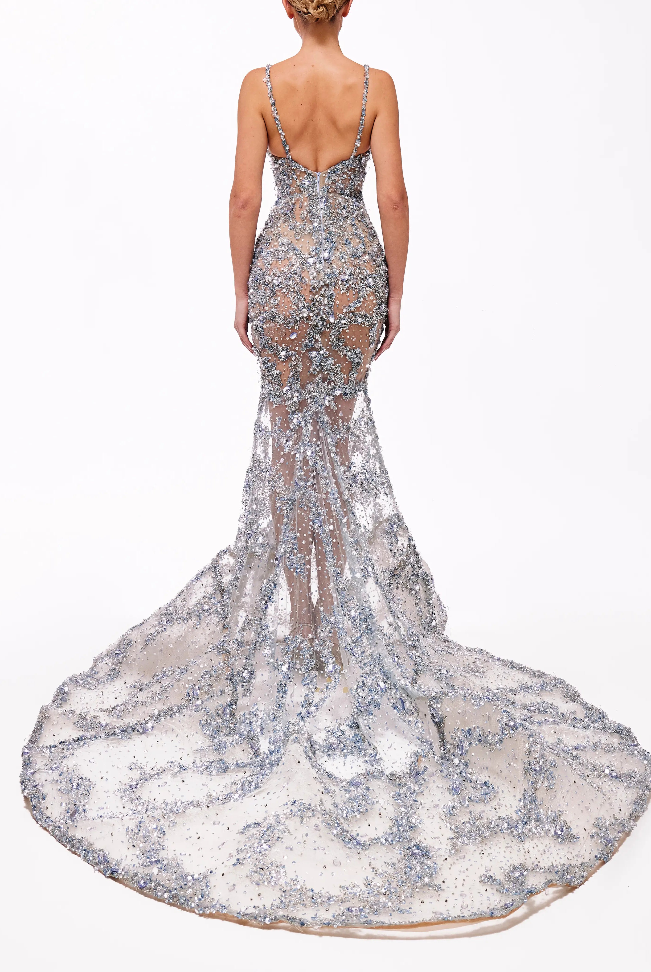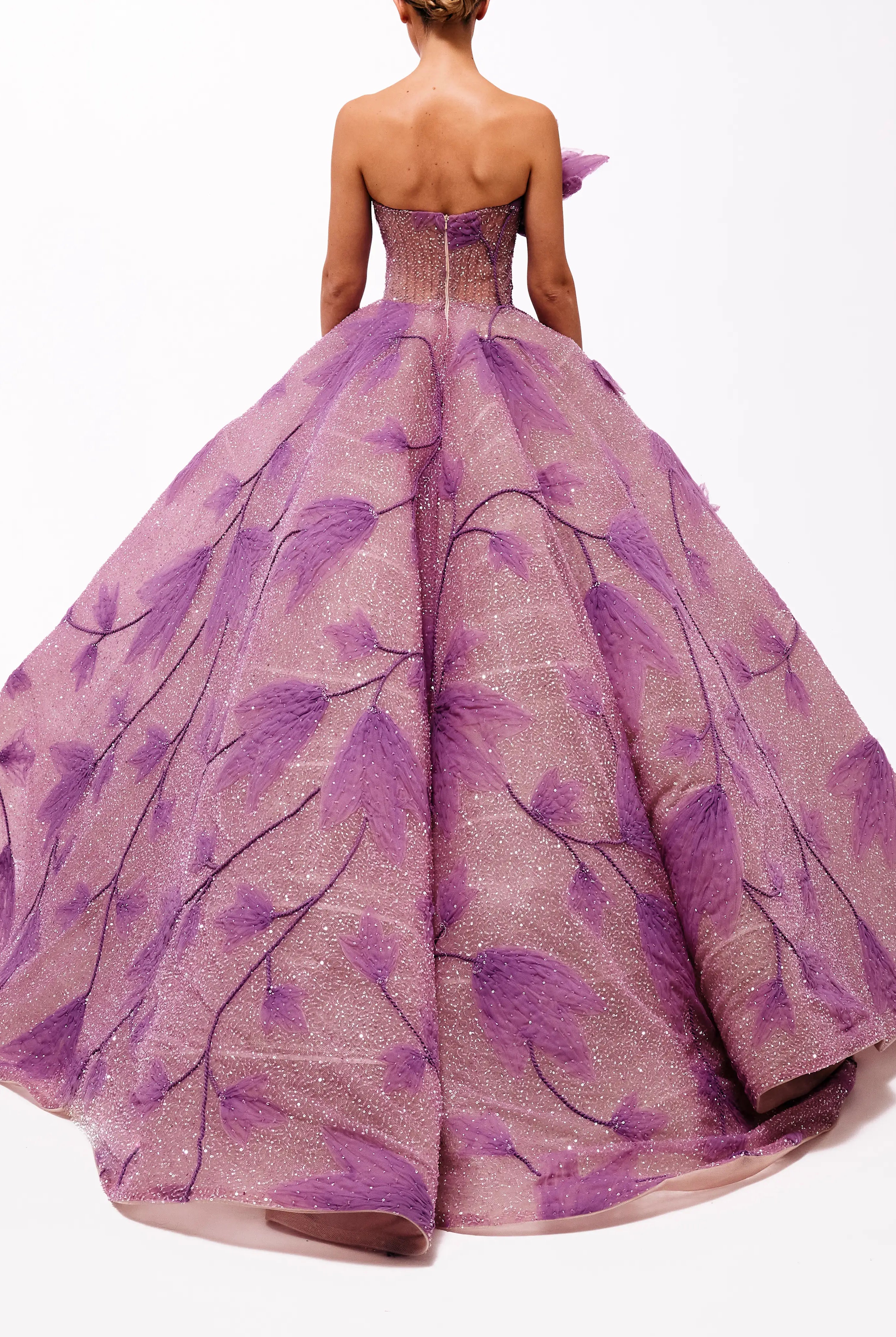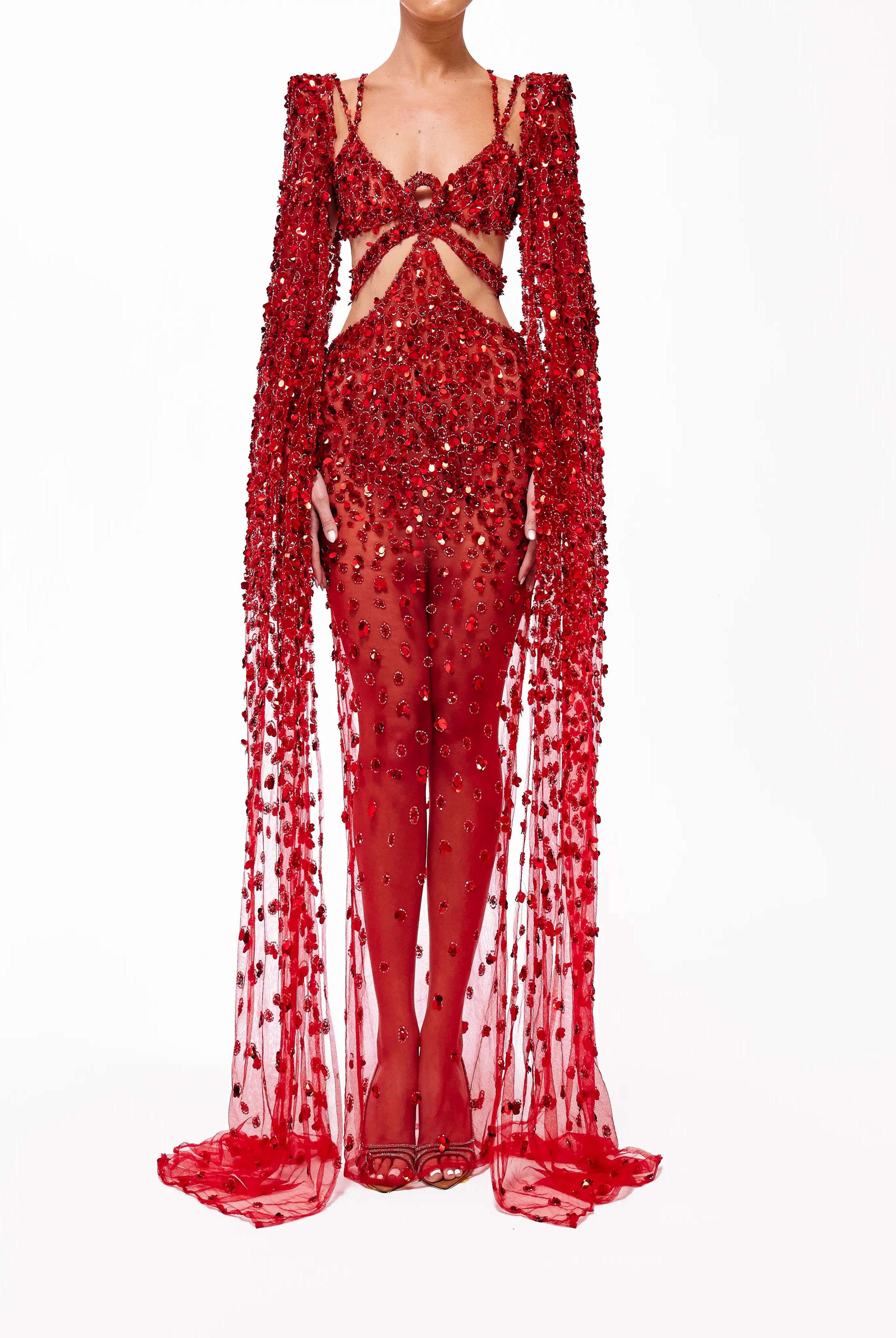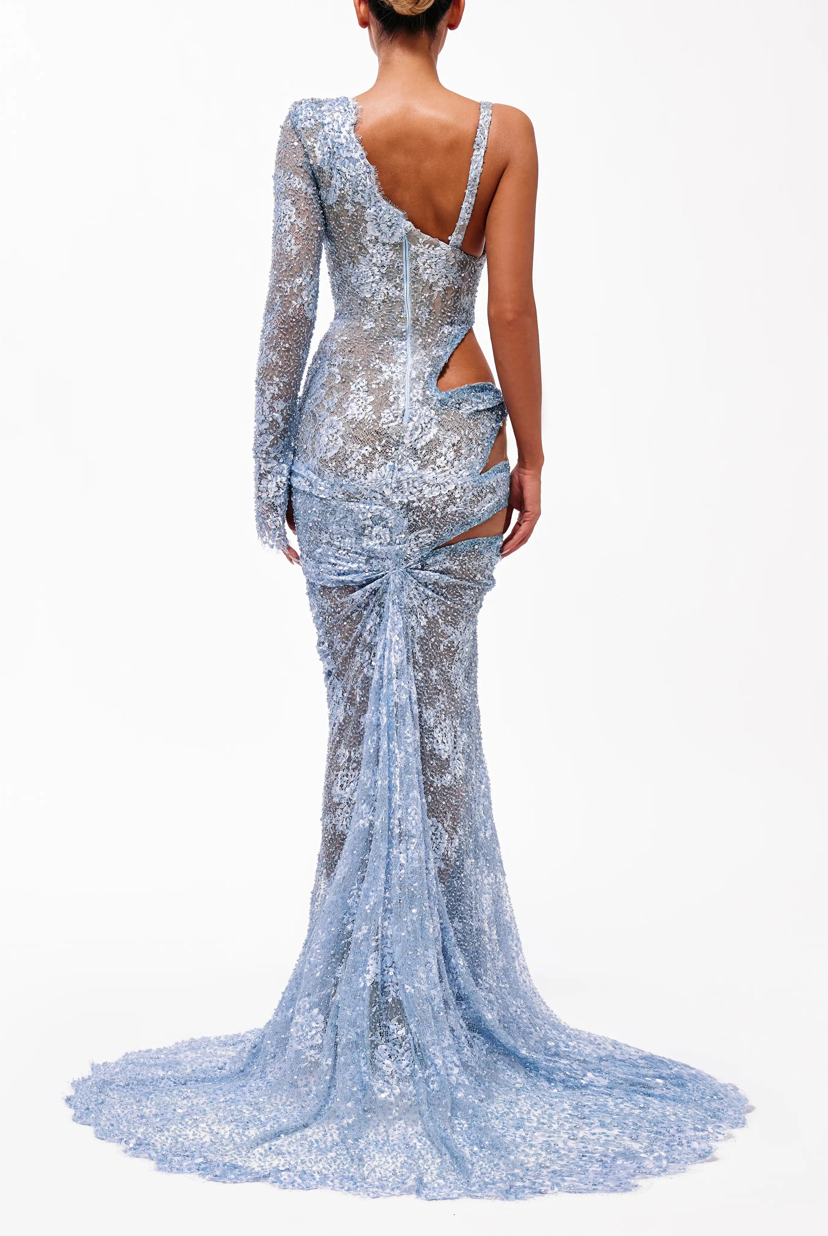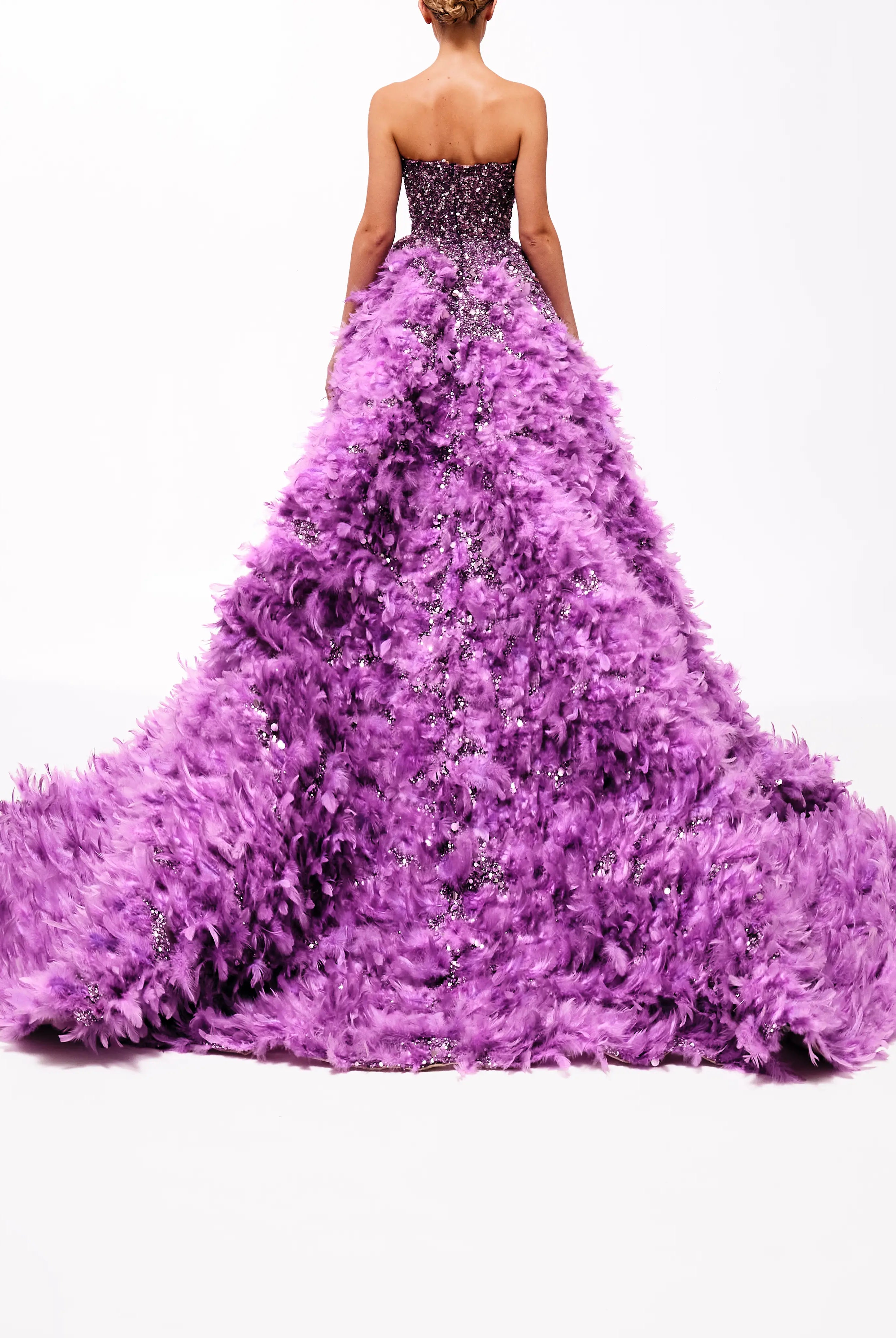 A collection full of life, Haute Allure brings your imagination to reality. With a vast selection in hues, these gowns provide ample options for extravagant events. This collection is elegantly maximalistic, with the floral lace material, cape aspect, and other unique features. Enter a world of colorful drama through Valdrin Sahiti.