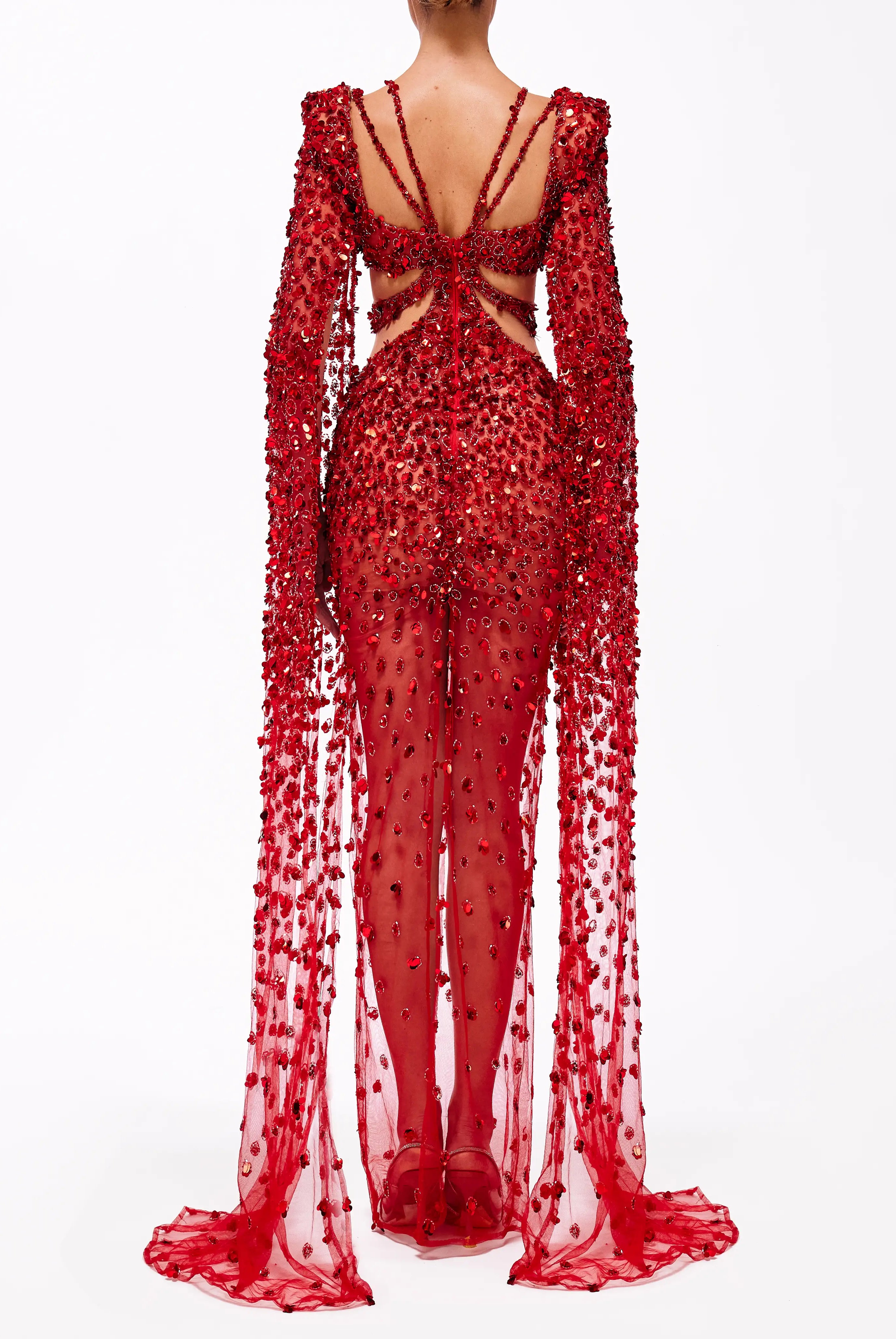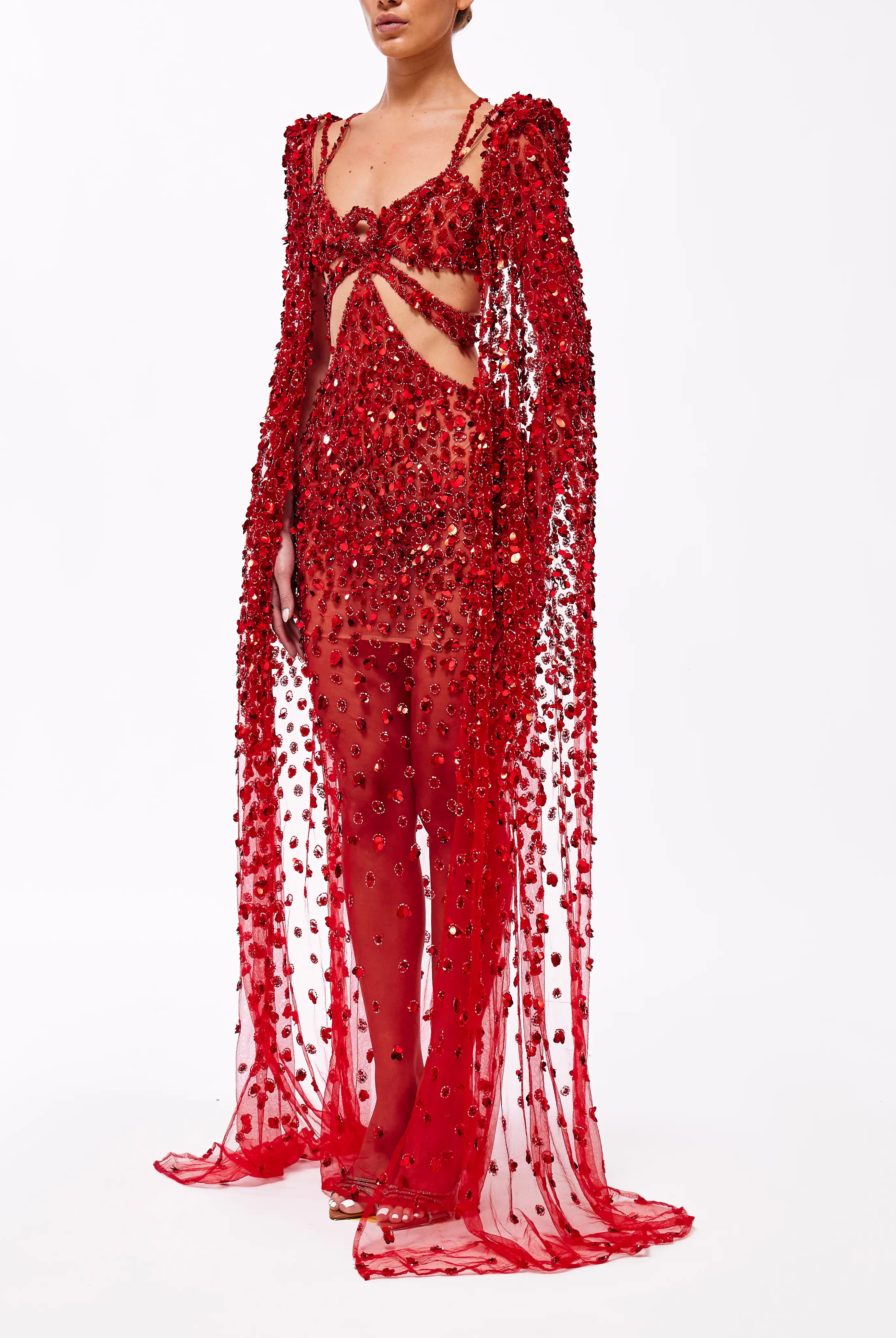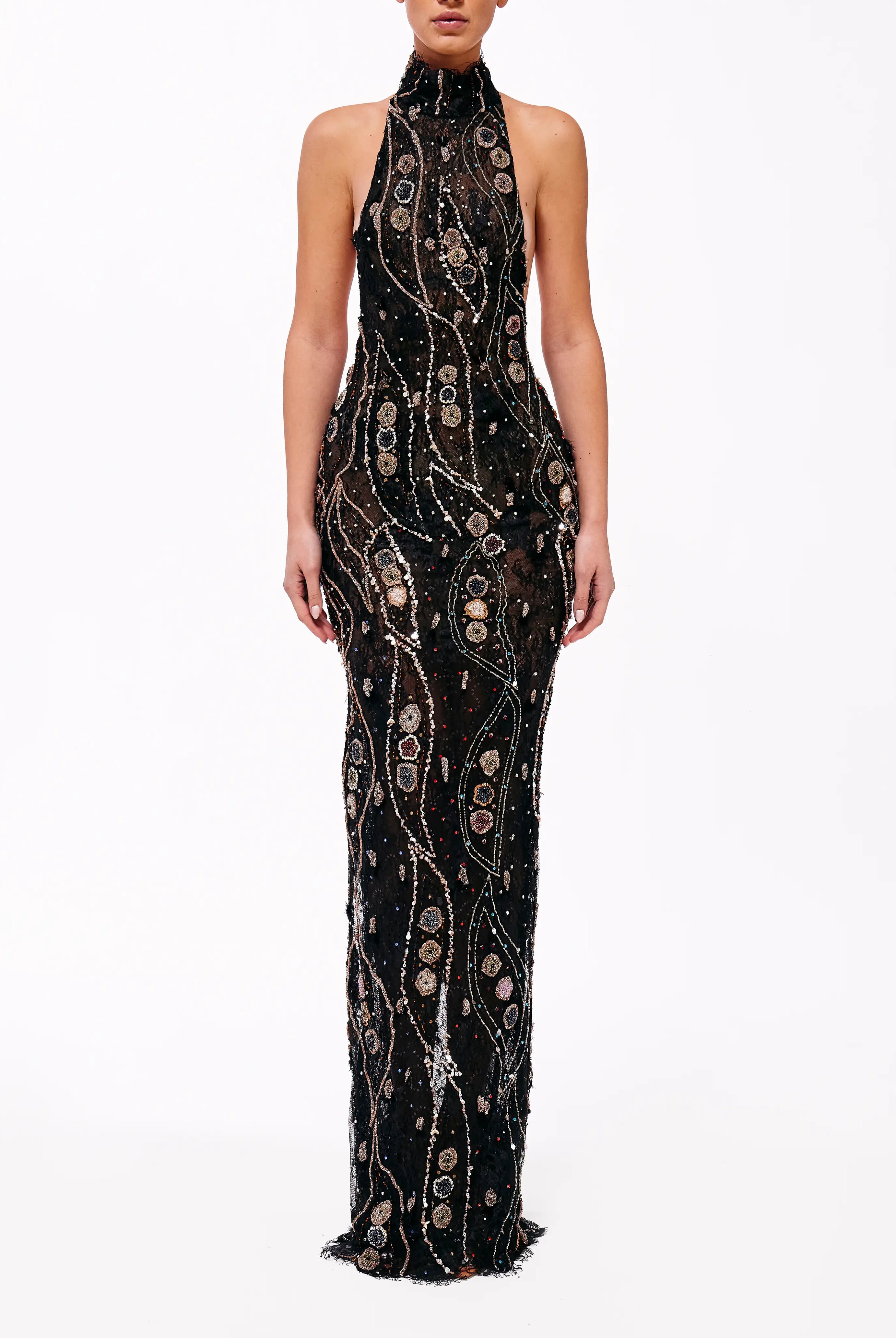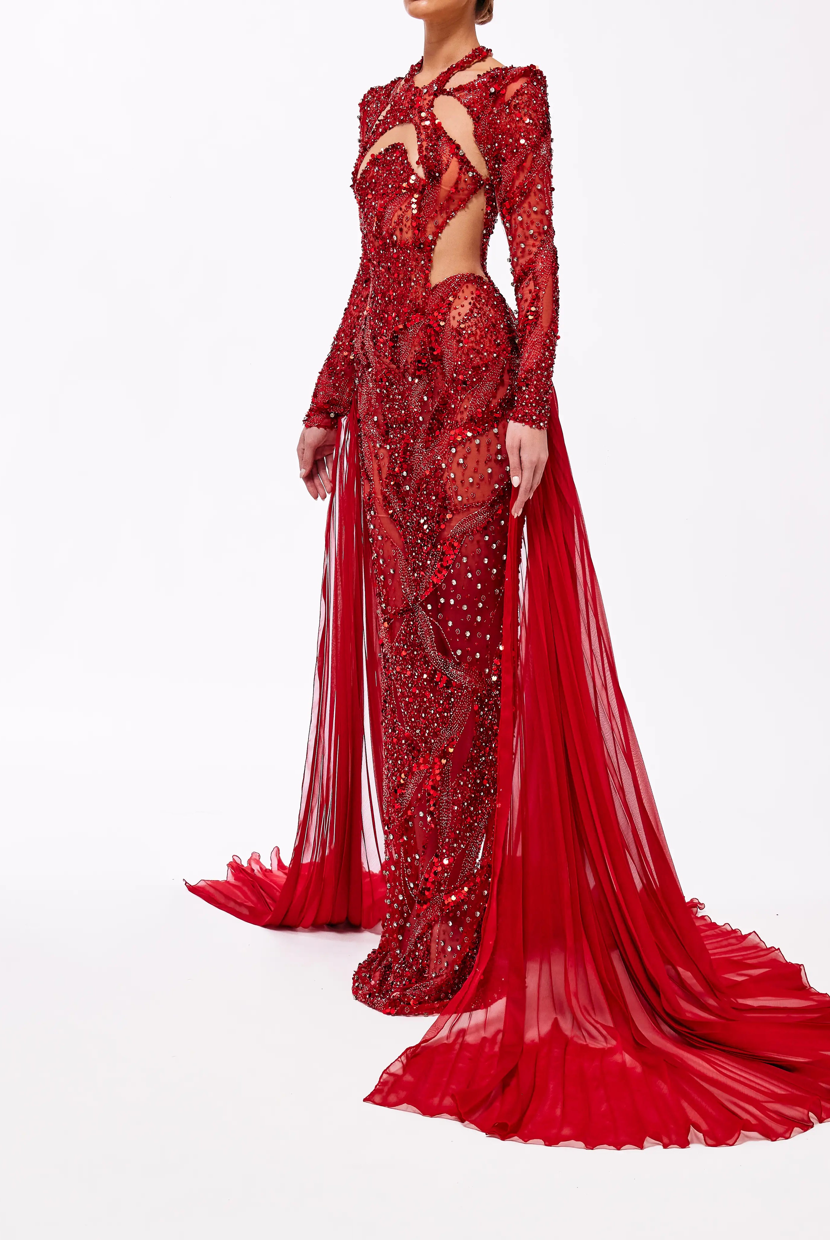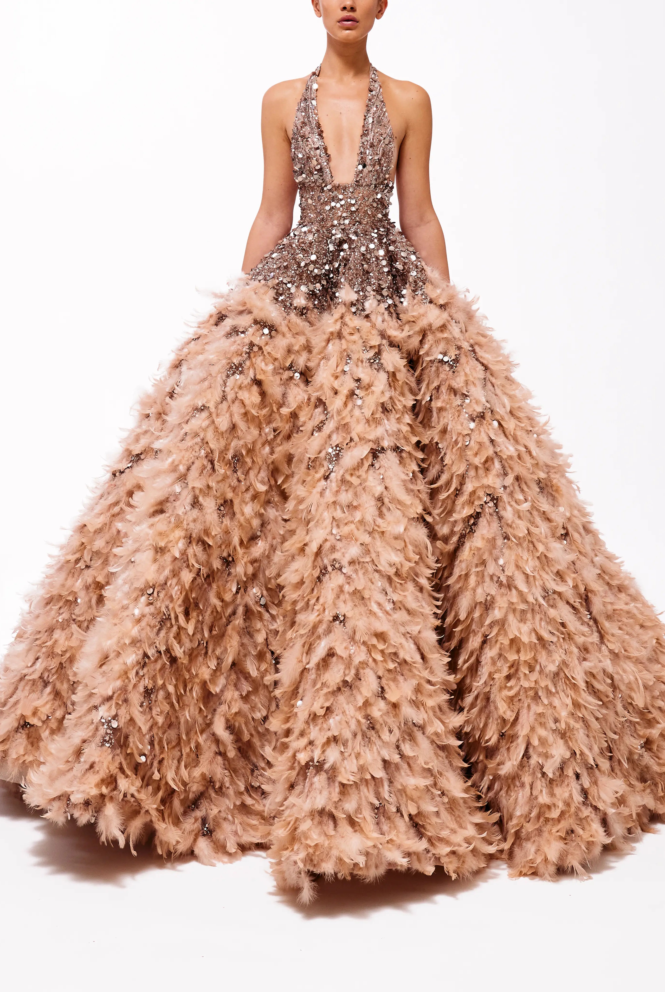 A collection full of life, Haute Allure brings your imagination to reality. With a vast selection in hues, these gowns provide ample options for extravagant events. This collection is elegantly maximalistic, with the floral lace material, cape aspect, and other unique features. Enter a world of colorful drama through Valdrin Sahiti.
