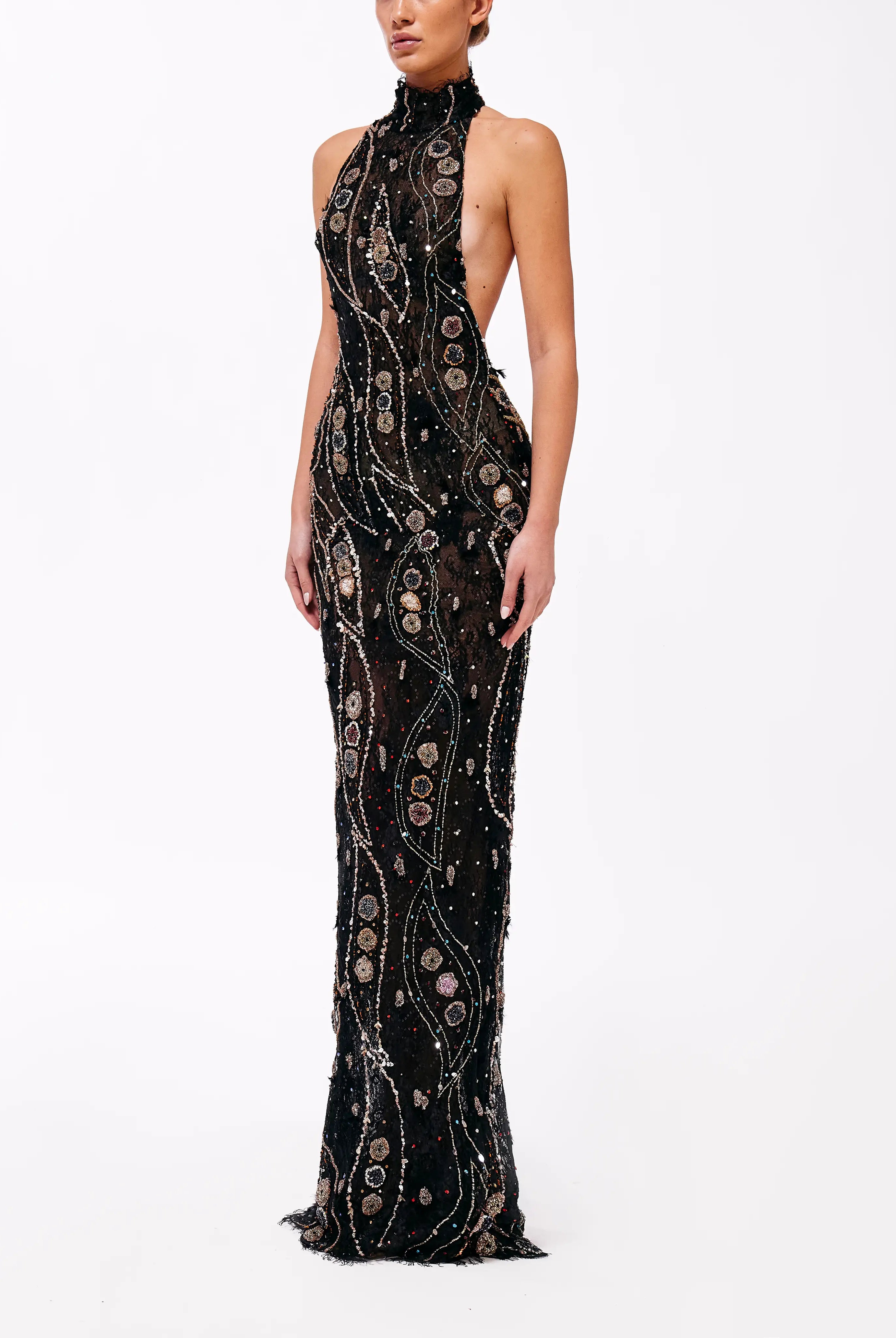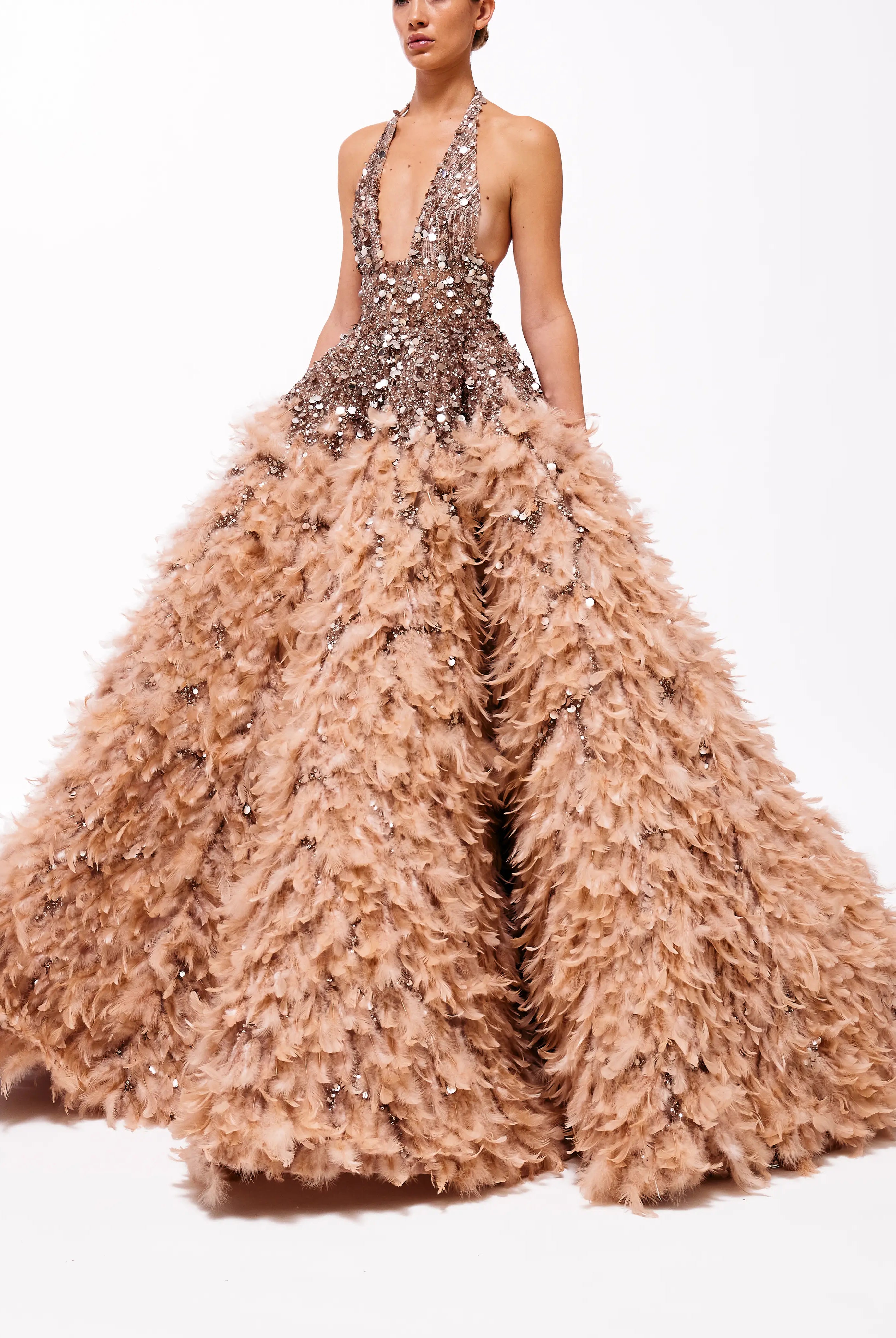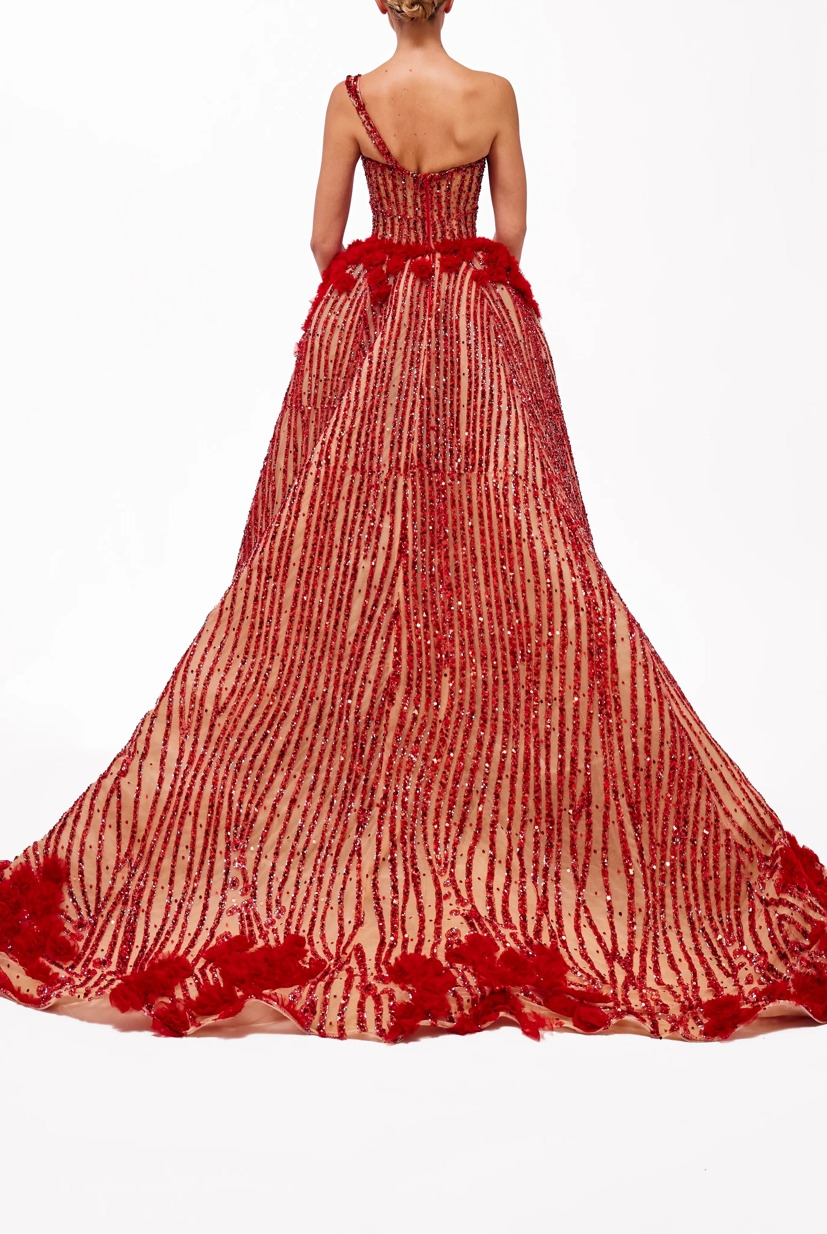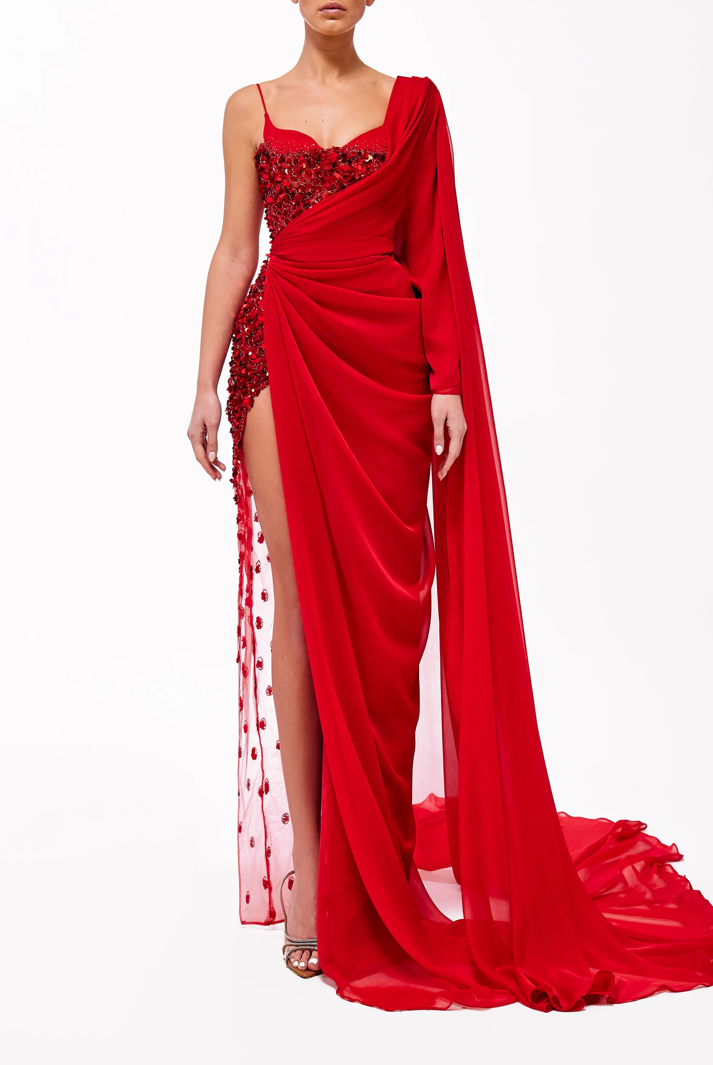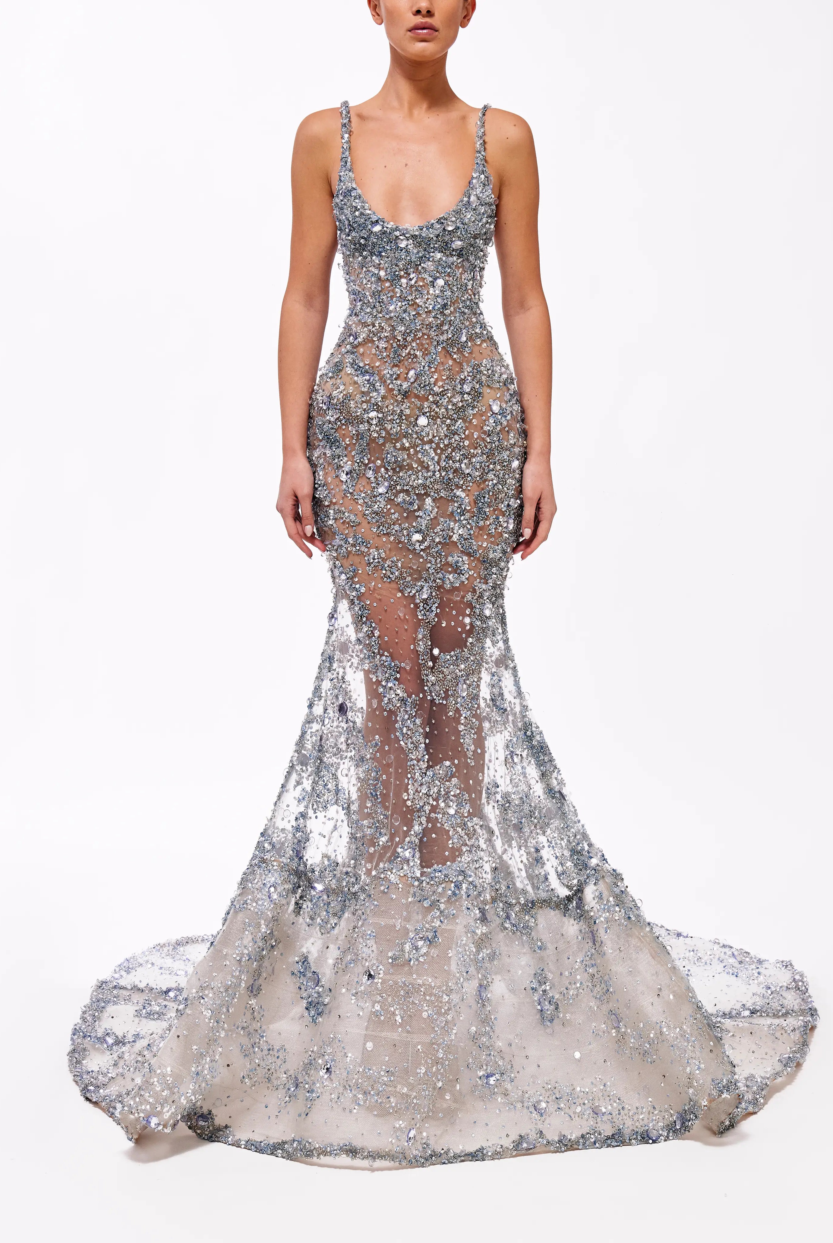 A collection full of life, Haute Allure brings your imagination to reality. With a vast selection in hues, these gowns provide ample options for extravagant events. This collection is elegantly maximalistic, with the floral lace material, cape aspect, and other unique features. Enter a world of colorful drama through Valdrin Sahiti.