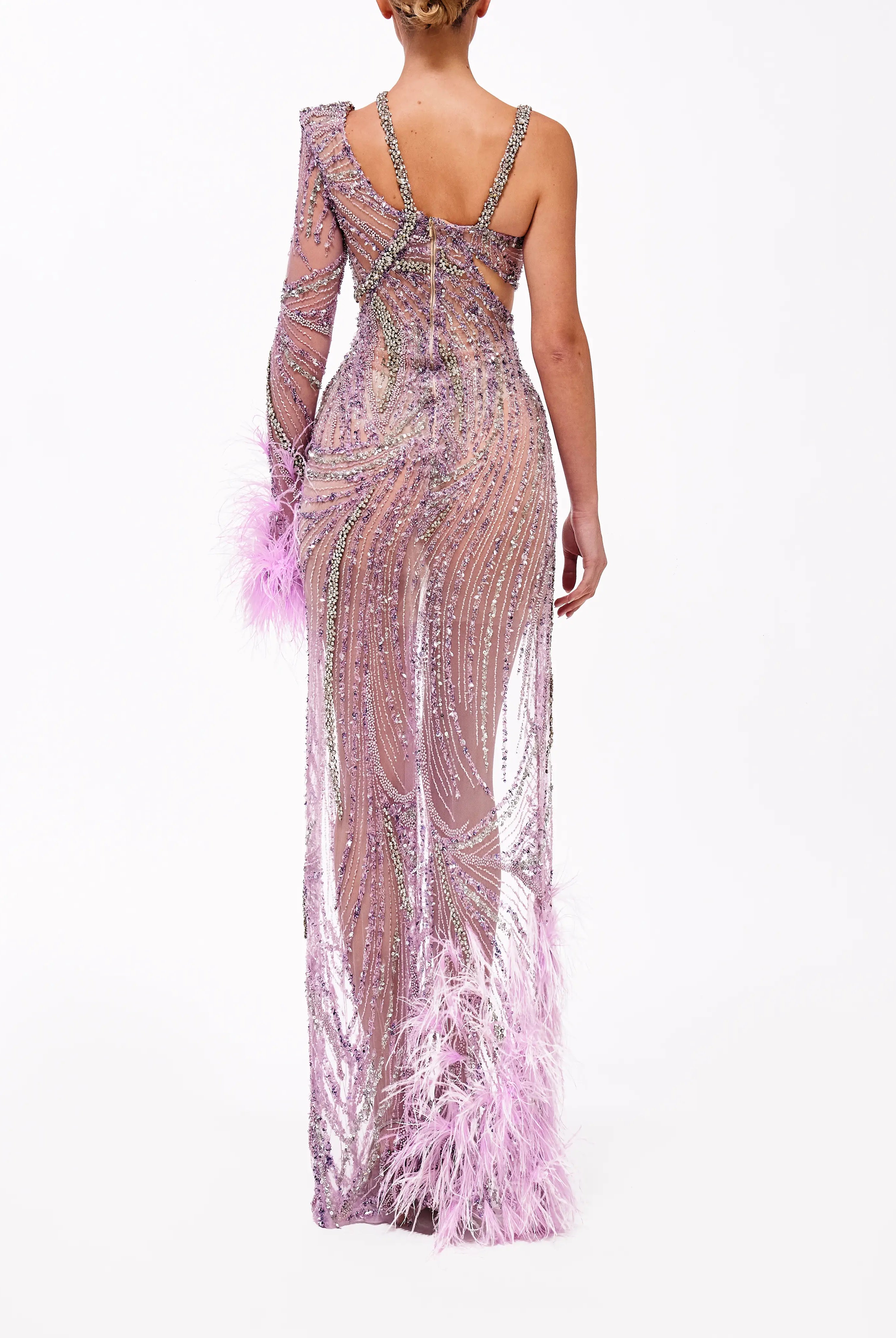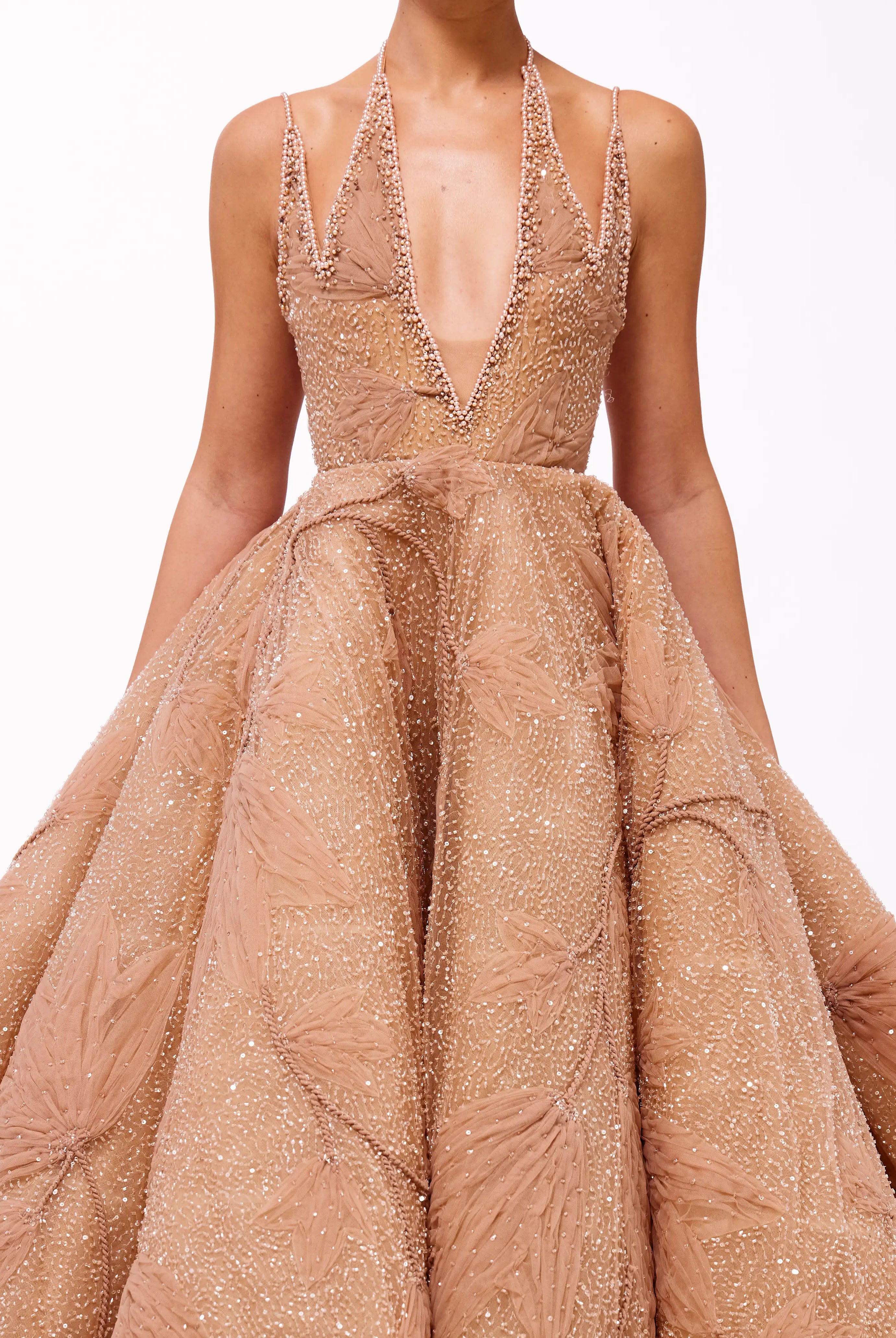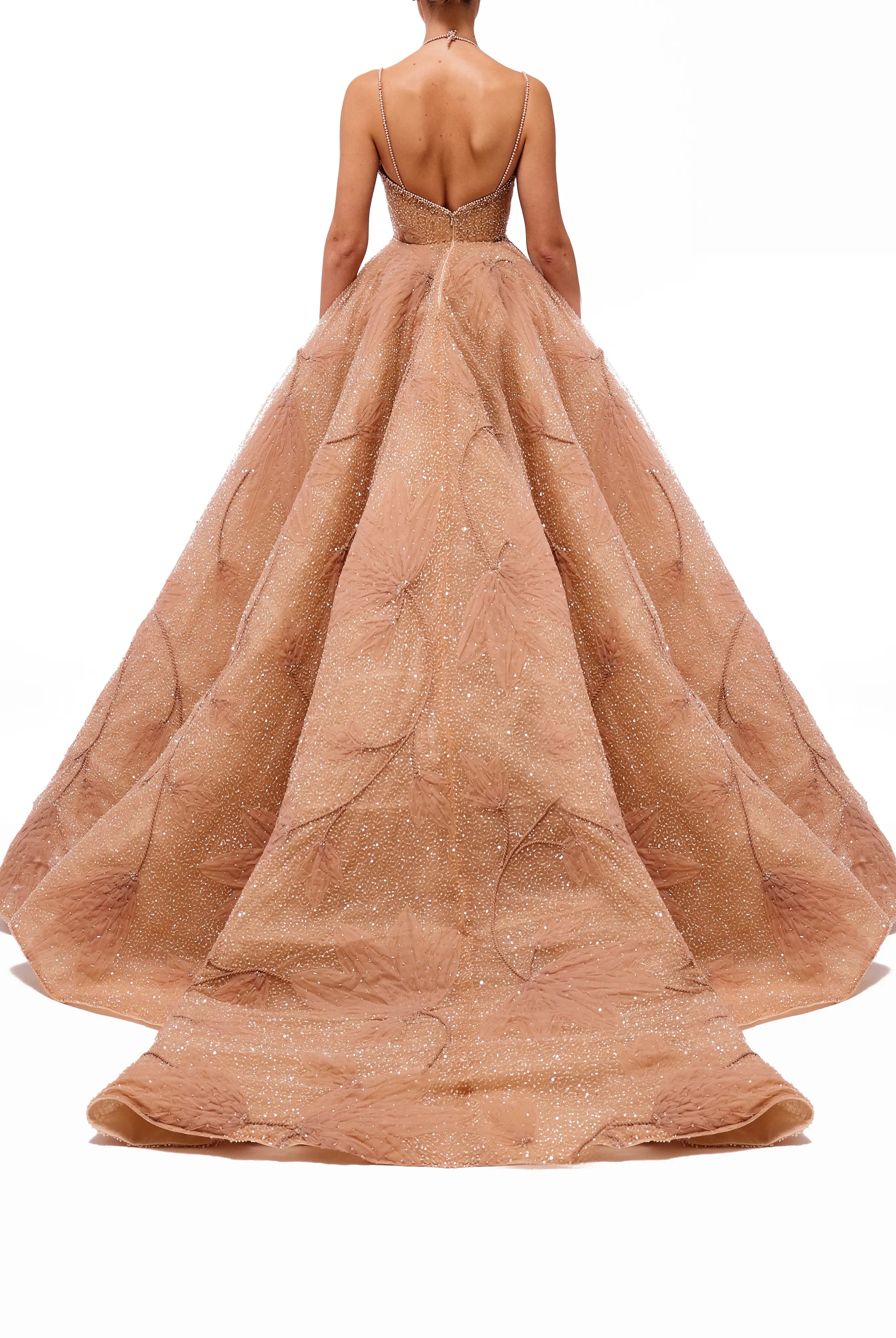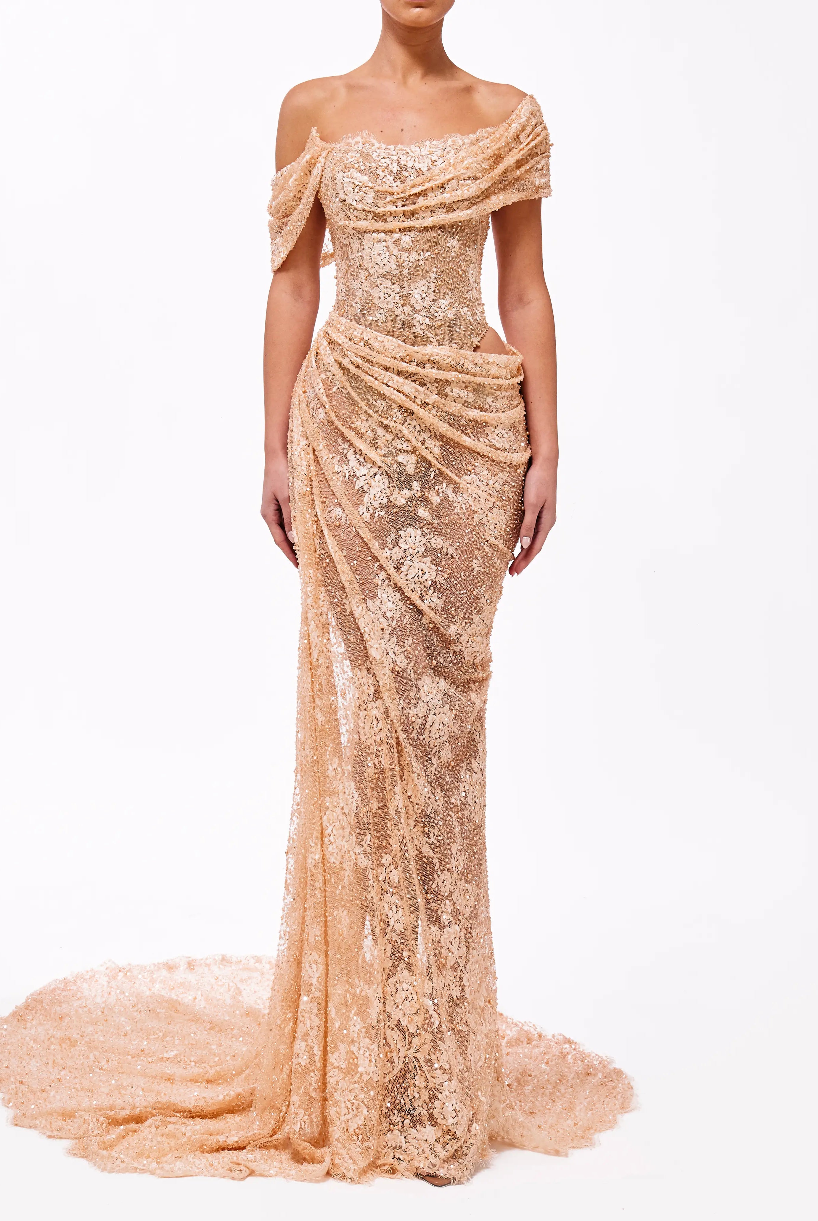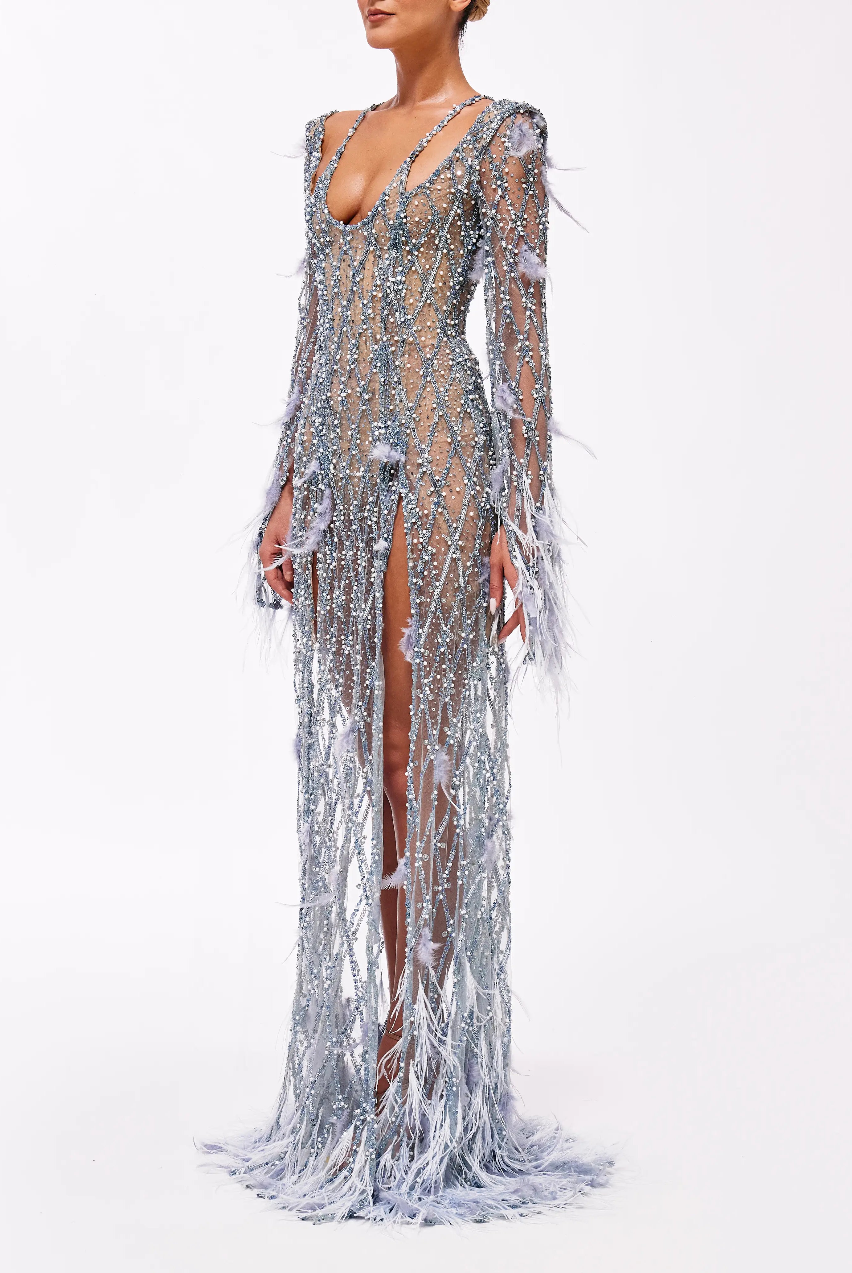 A collection full of life, Haute Allure brings your imagination to reality. With a vast selection in hues, these gowns provide ample options for extravagant events. This collection is elegantly maximalistic, with the floral lace material, cape aspect, and other unique features. Enter a world of colorful drama through Valdrin Sahiti.