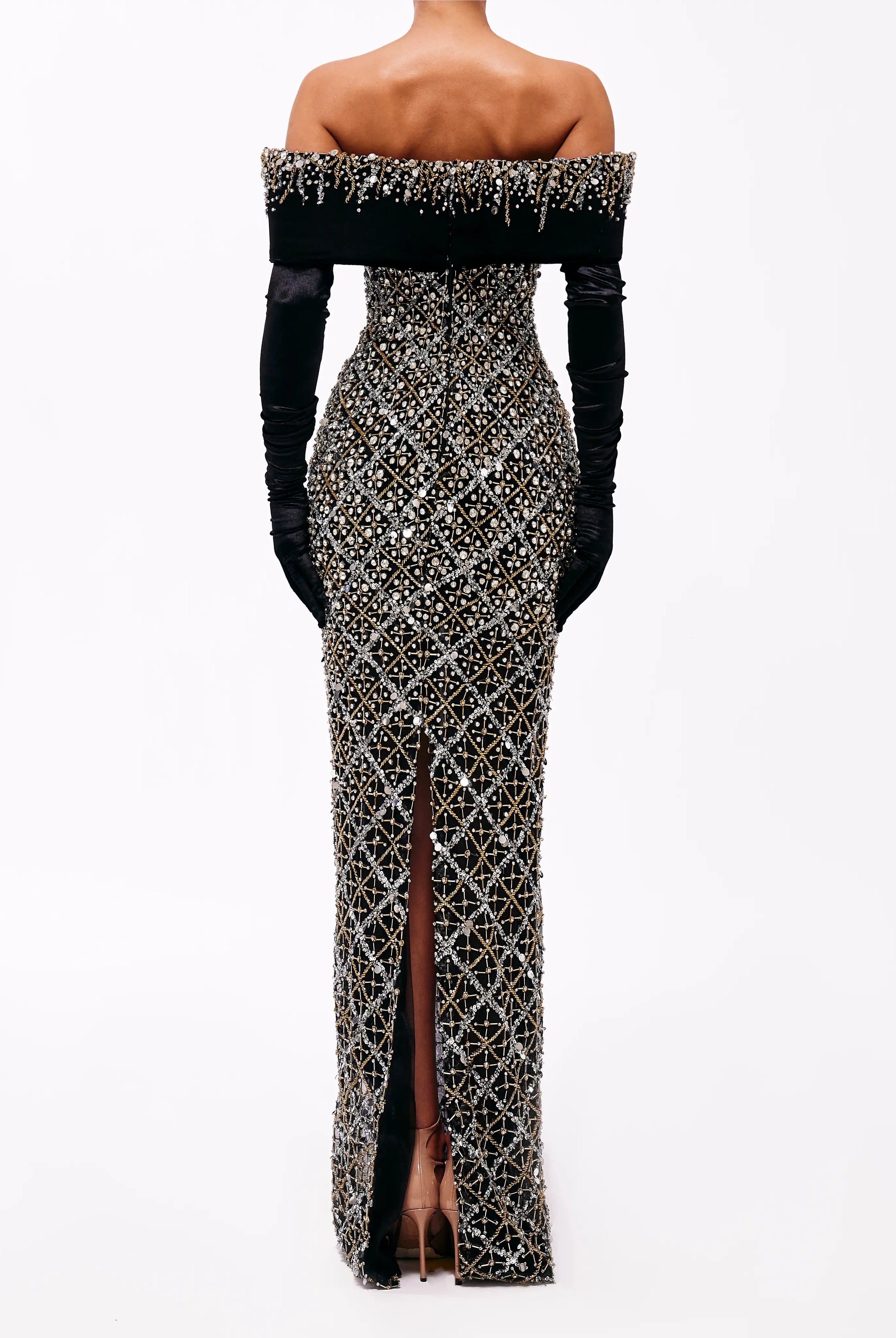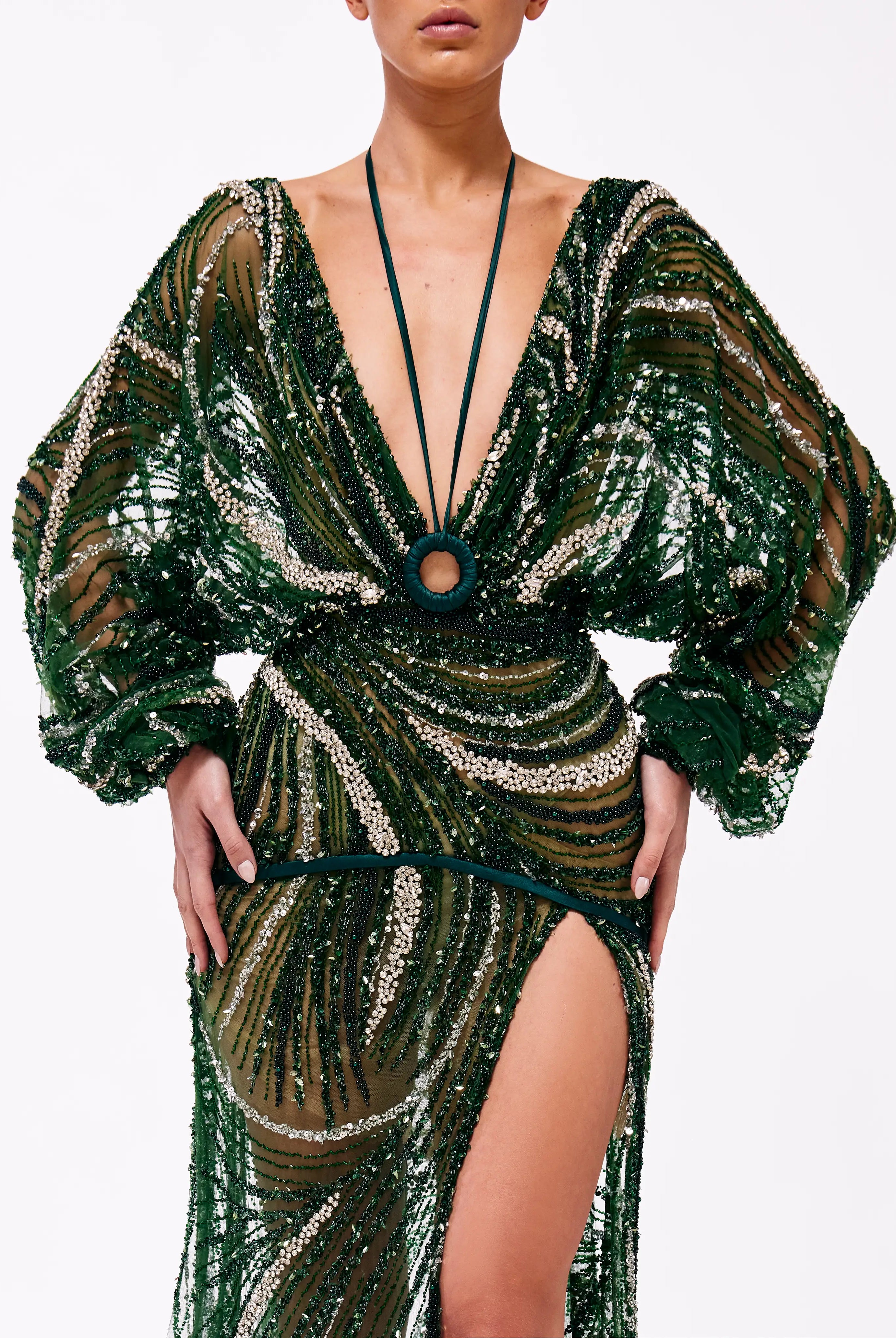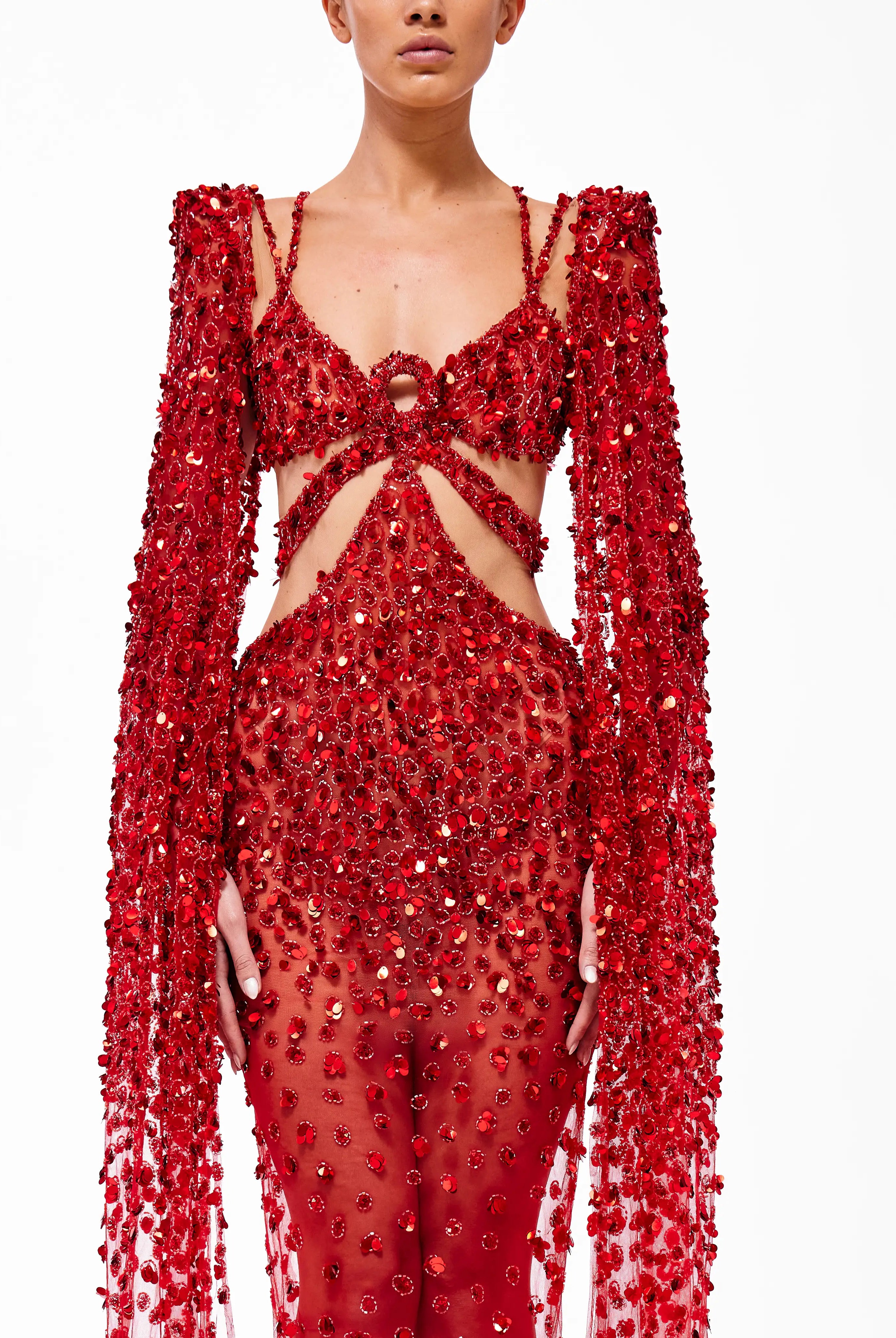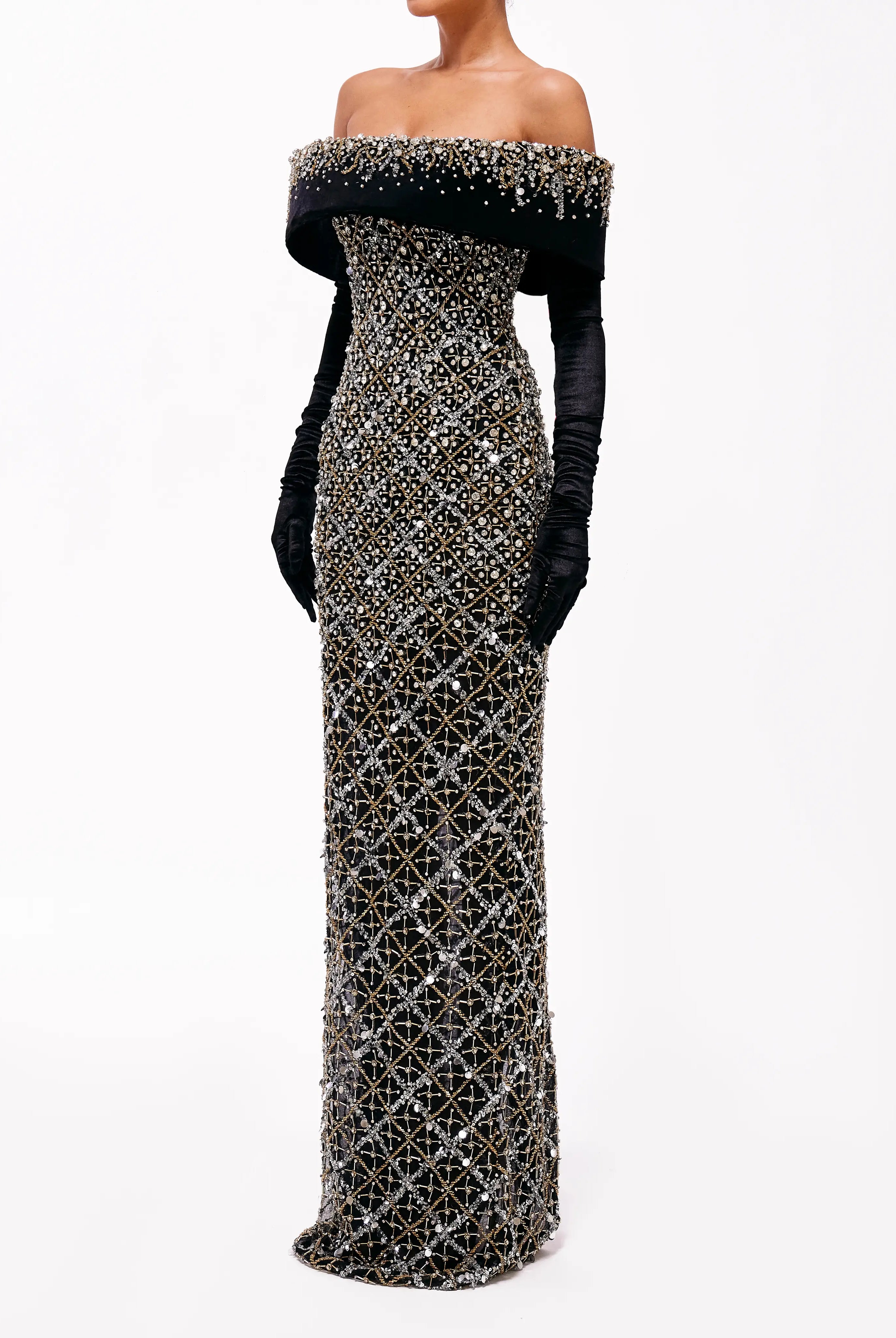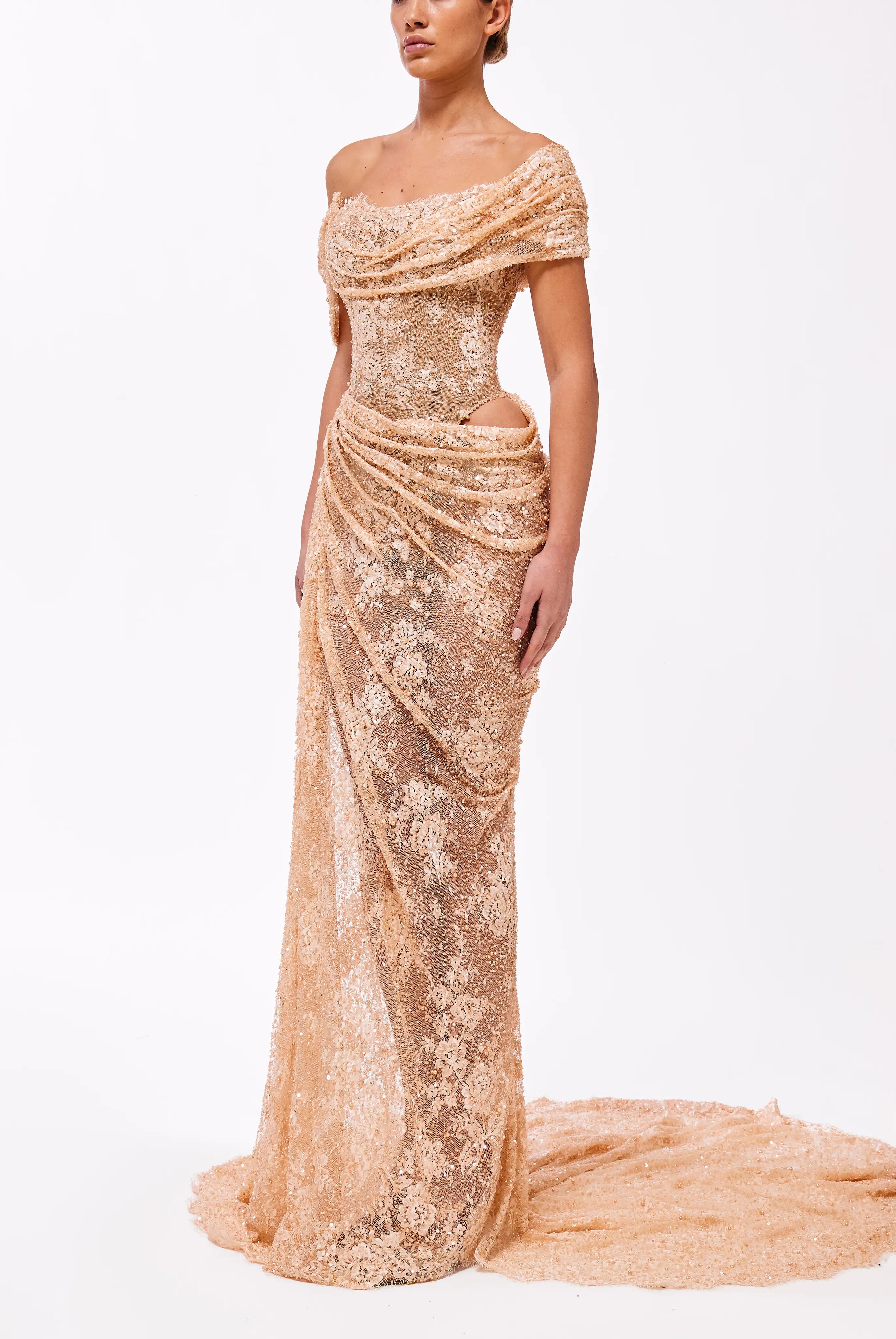 A collection full of life, Haute Allure brings your imagination to reality. With a vast selection in hues, these gowns provide ample options for extravagant events. This collection is elegantly maximalistic, with the floral lace material, cape aspect, and other unique features. Enter a world of colorful drama through Valdrin Sahiti.