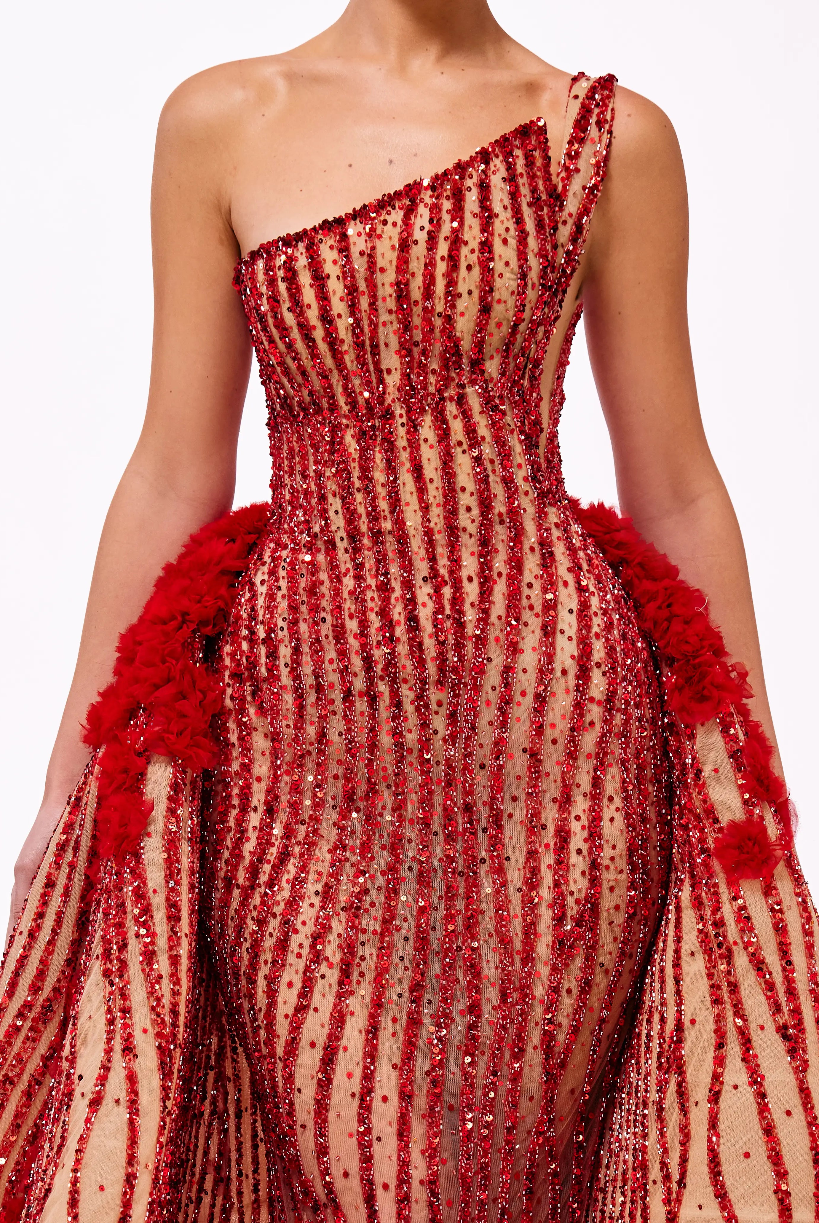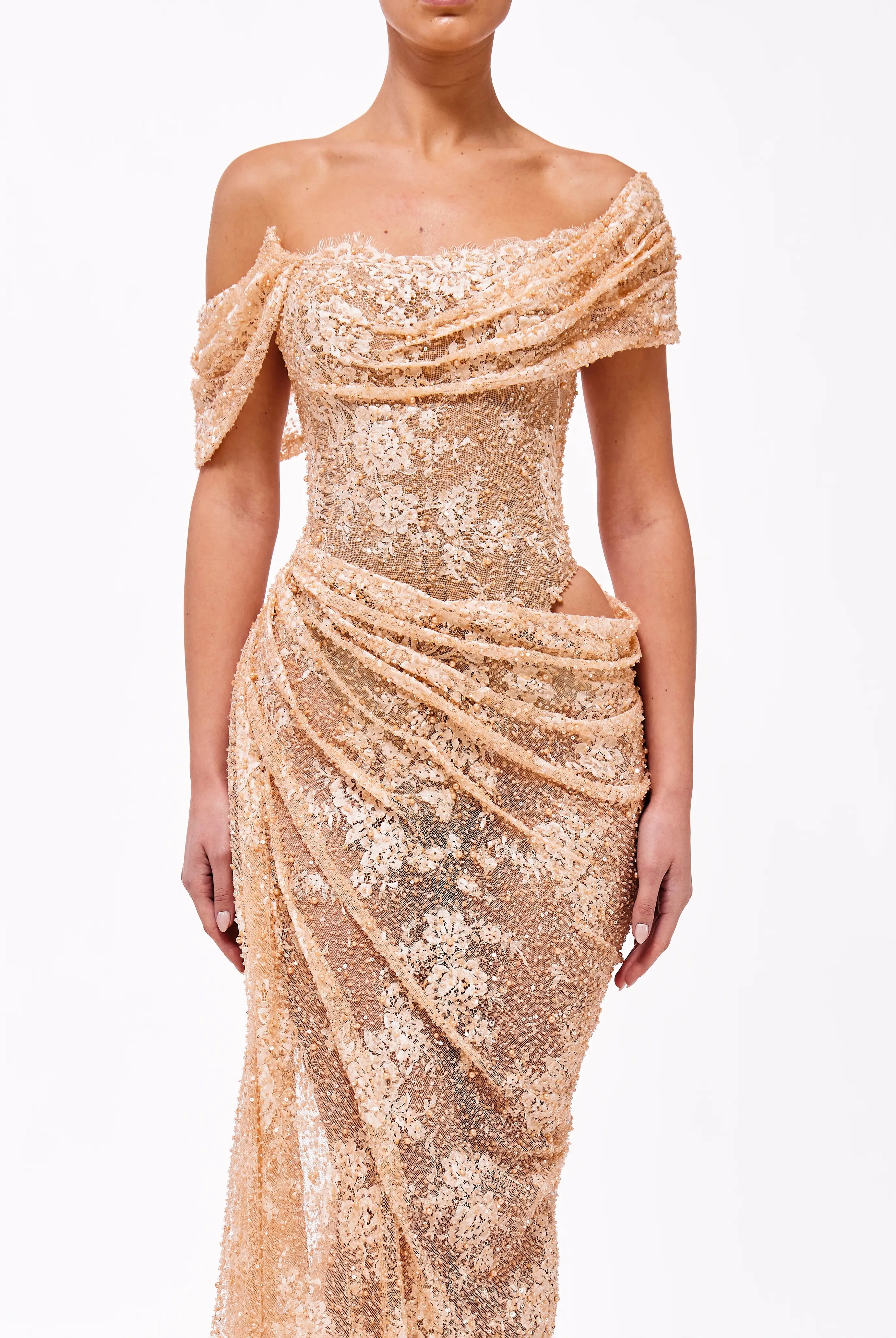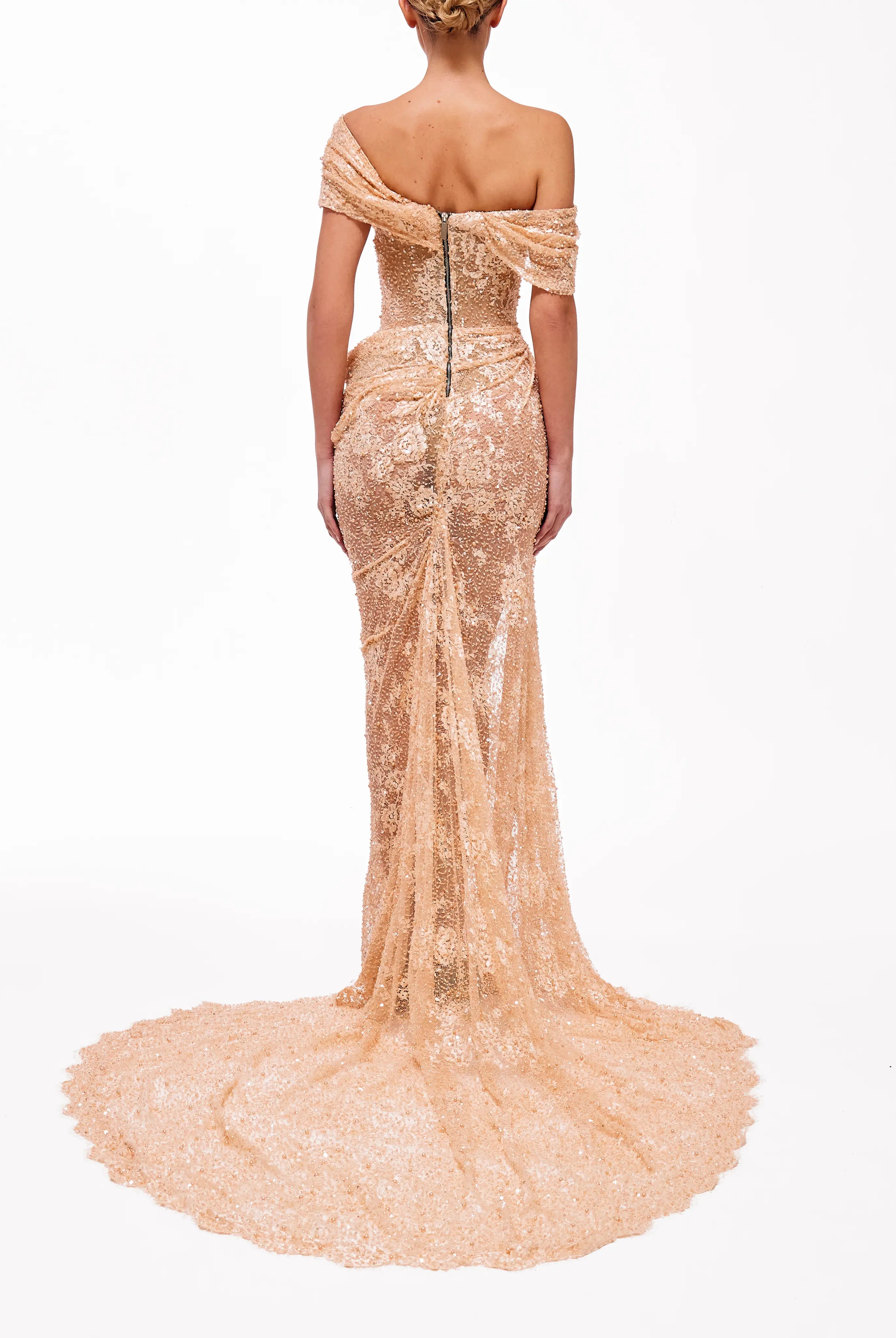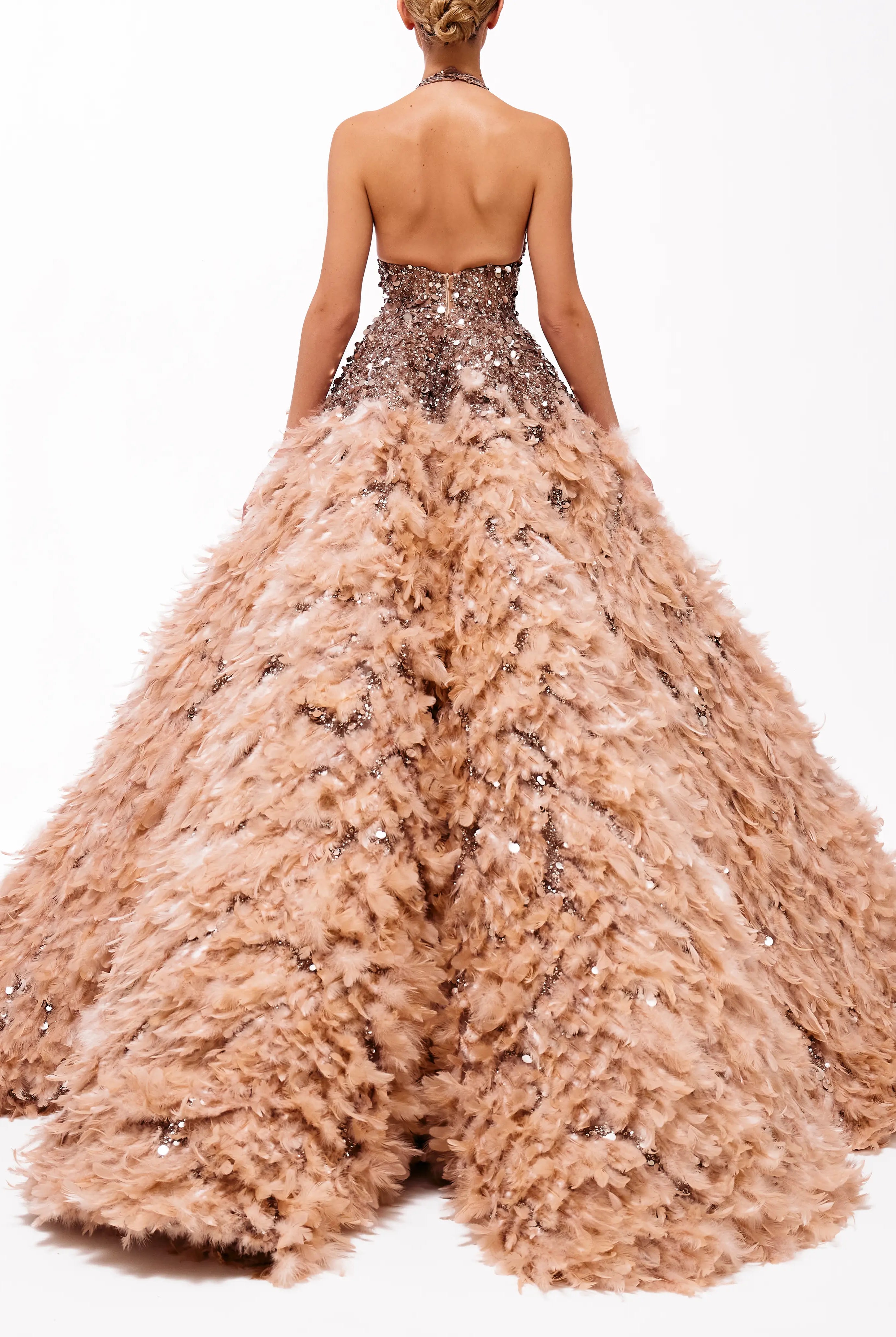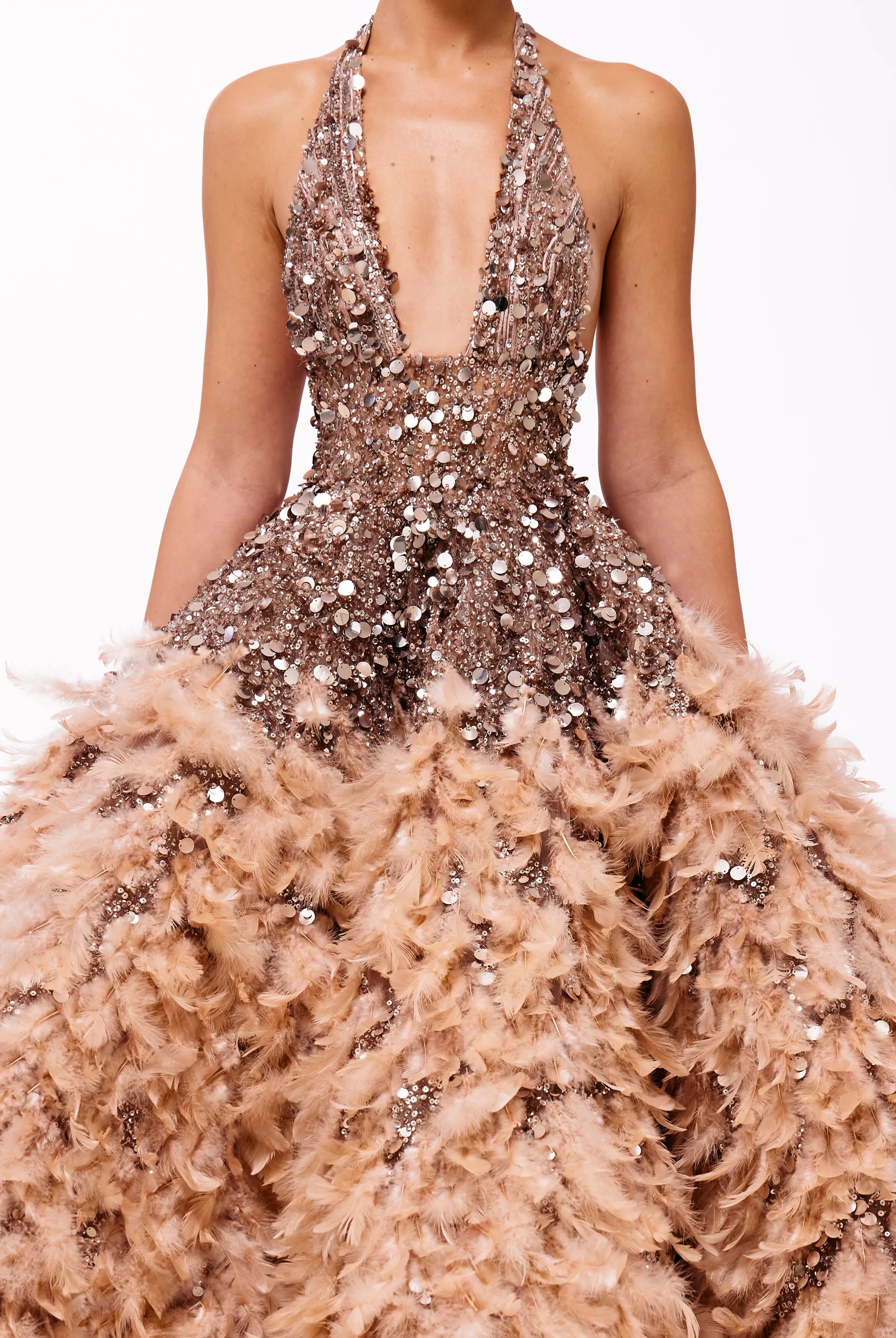 A collection full of life, Haute Allure brings your imagination to reality. With a vast selection in hues, these gowns provide ample options for extravagant events. This collection is elegantly maximalistic, with the floral lace material, cape aspect, and other unique features. Enter a world of colorful drama through Valdrin Sahiti.