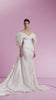 This elegant long bridal dress features an off-the-shoulder neckline that beautifully frames the décolletage. Its straight, fitted silhouette enhances the natural shape, while a long, flowy cape adds a dramatic and sophisticated touch, perfect for making a memorable entrance. Designed for timeless grace and modern refinement, this dress combines classic bridal elements with contemporary style.