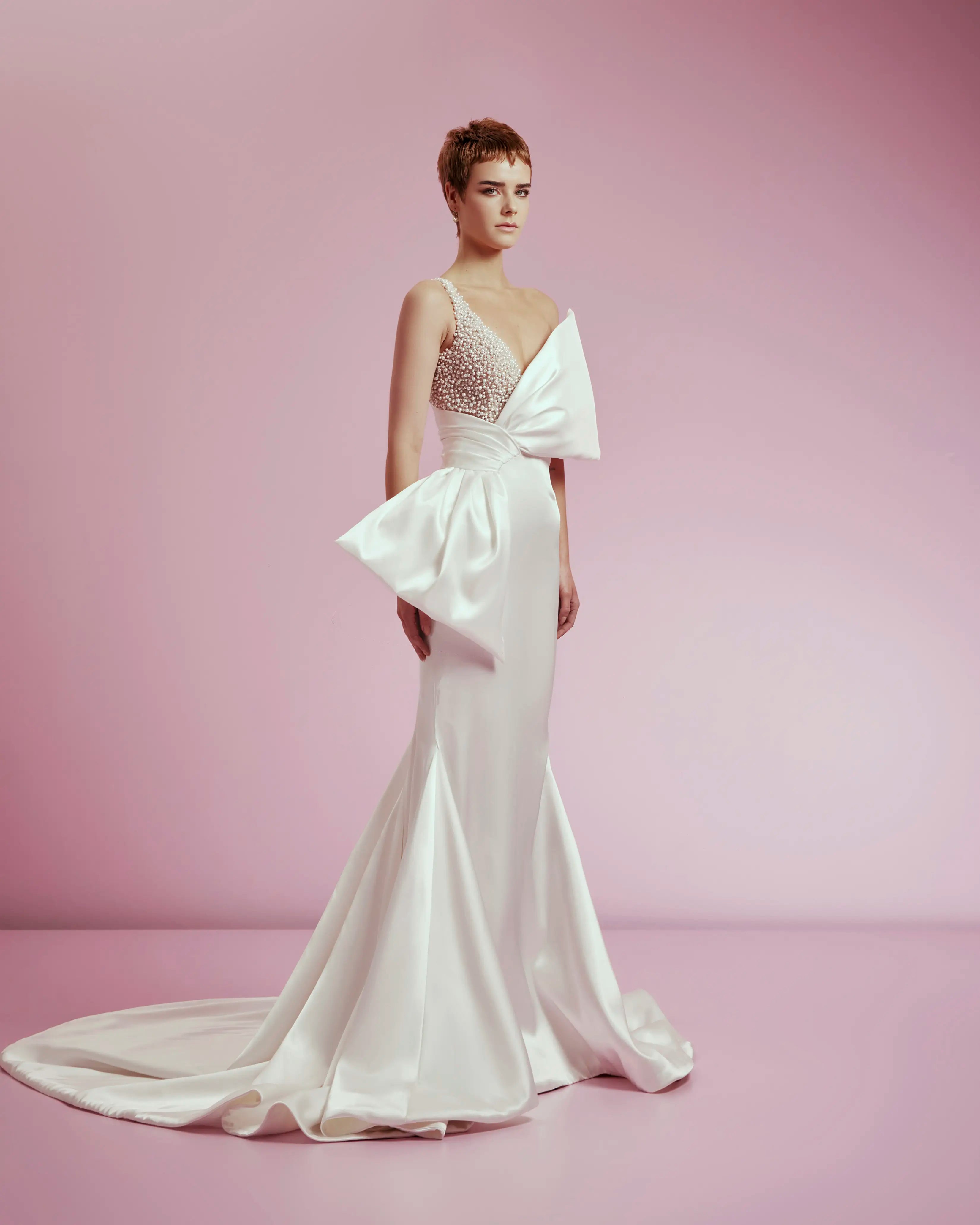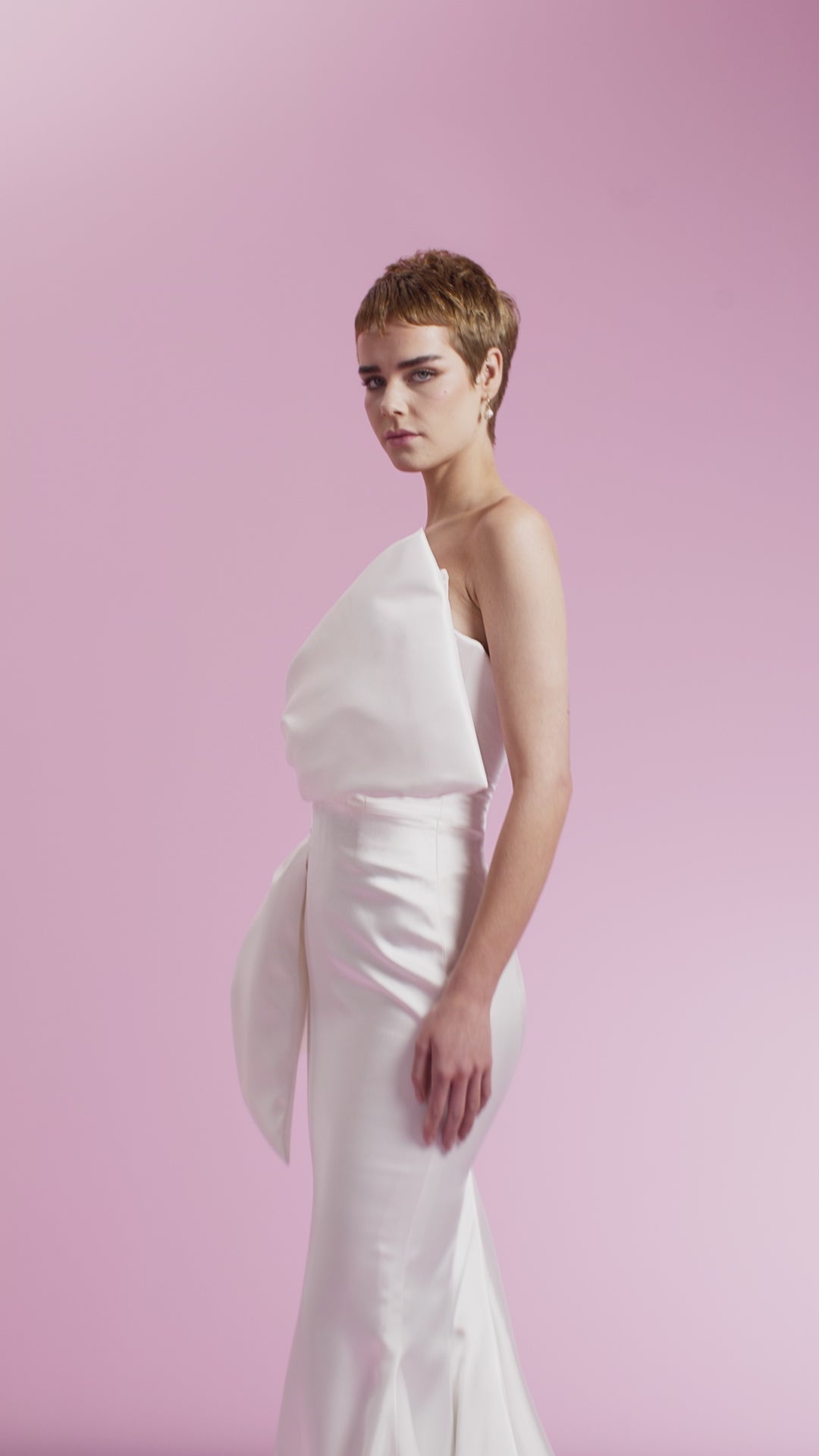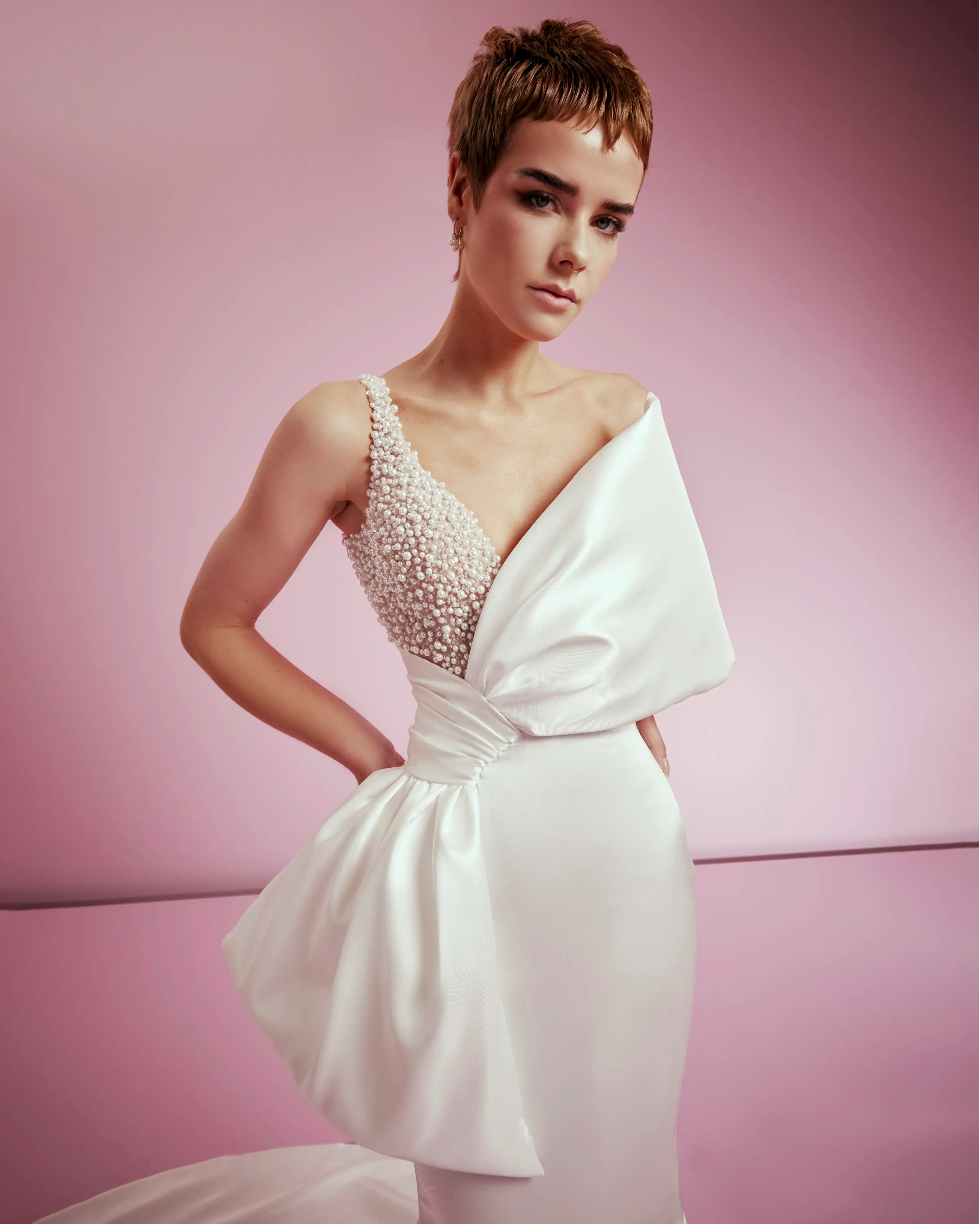 This elegant long bridal gown features an off-shoulder design that gracefully highlights the neckline. A unique bow-like detail adds a touch of sophistication, while the single beaded strap on one side introduces subtle sparkle. The fitted skirt enhances the silhouette, creating a timeless and refined look perfect for a modern bride.