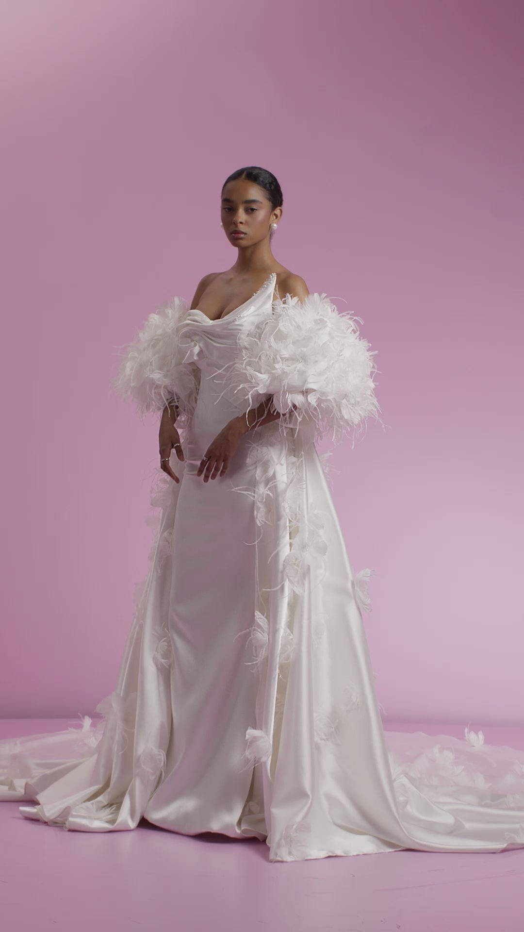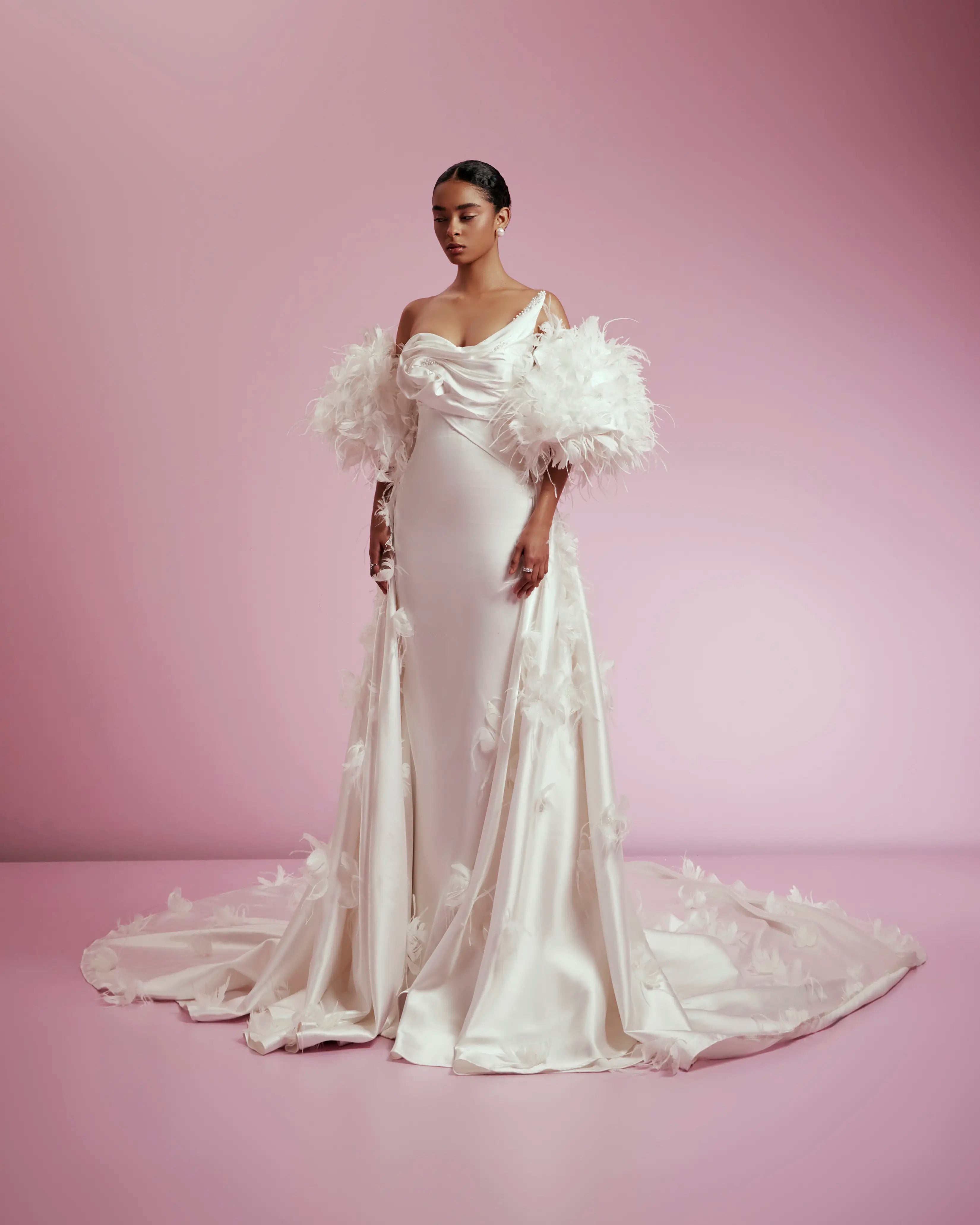 This Bridal RTW '24 - 027 gown features a sleek, modern silhouette crafted from luxurious fabric that drapes elegantly. The design emphasizes clean lines with a subtle yet sophisticated neckline, enhancing the bride’s natural grace. Complete with delicate detailing and a tailored fit, this gown offers refined elegance perfect for a timeless bridal look.