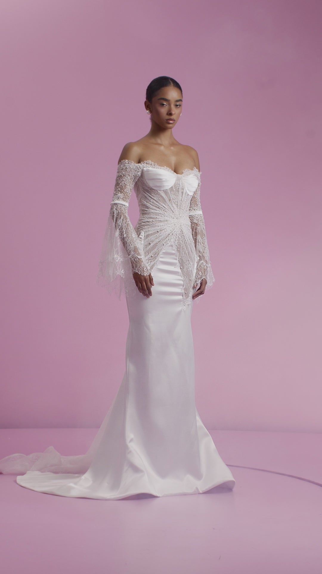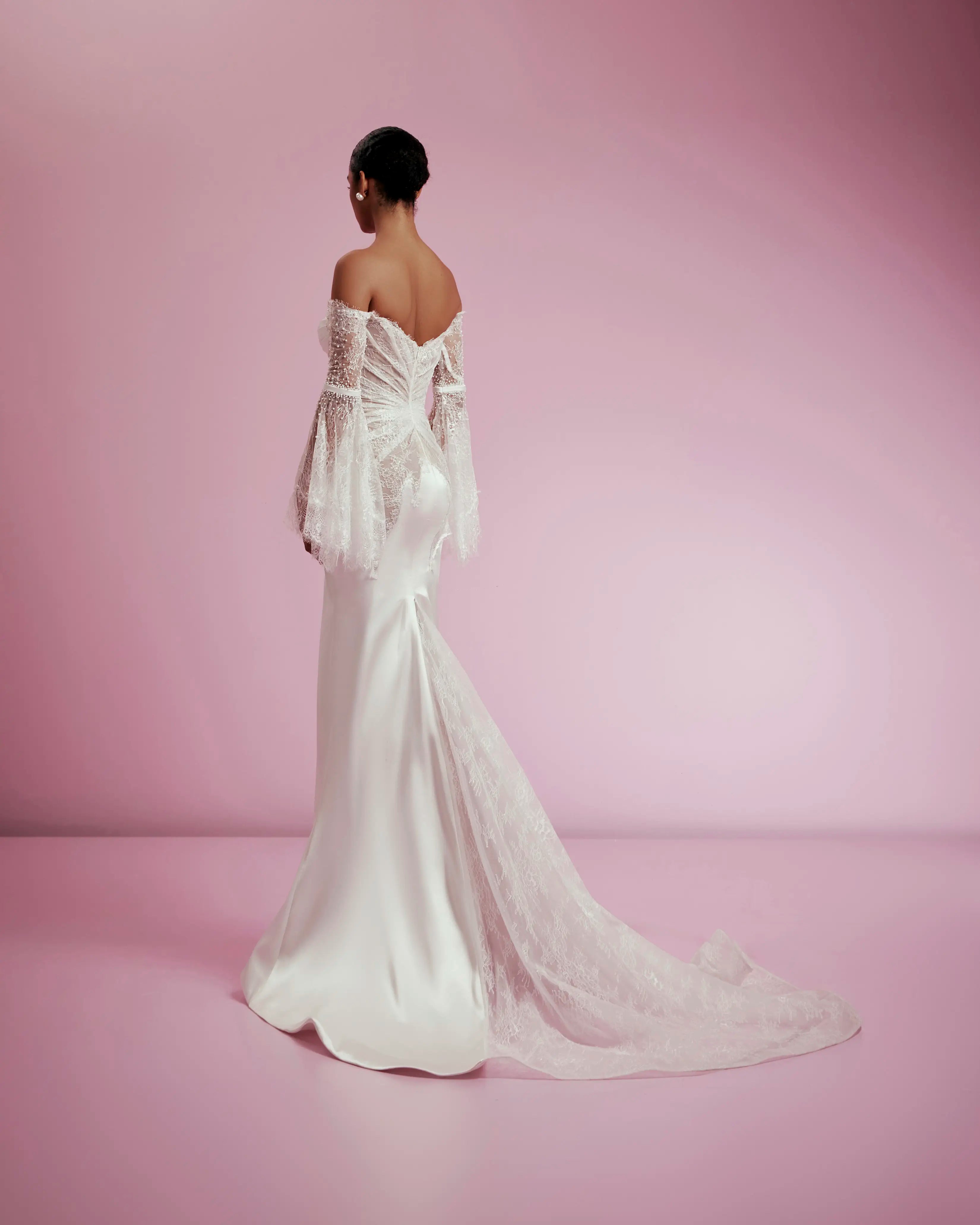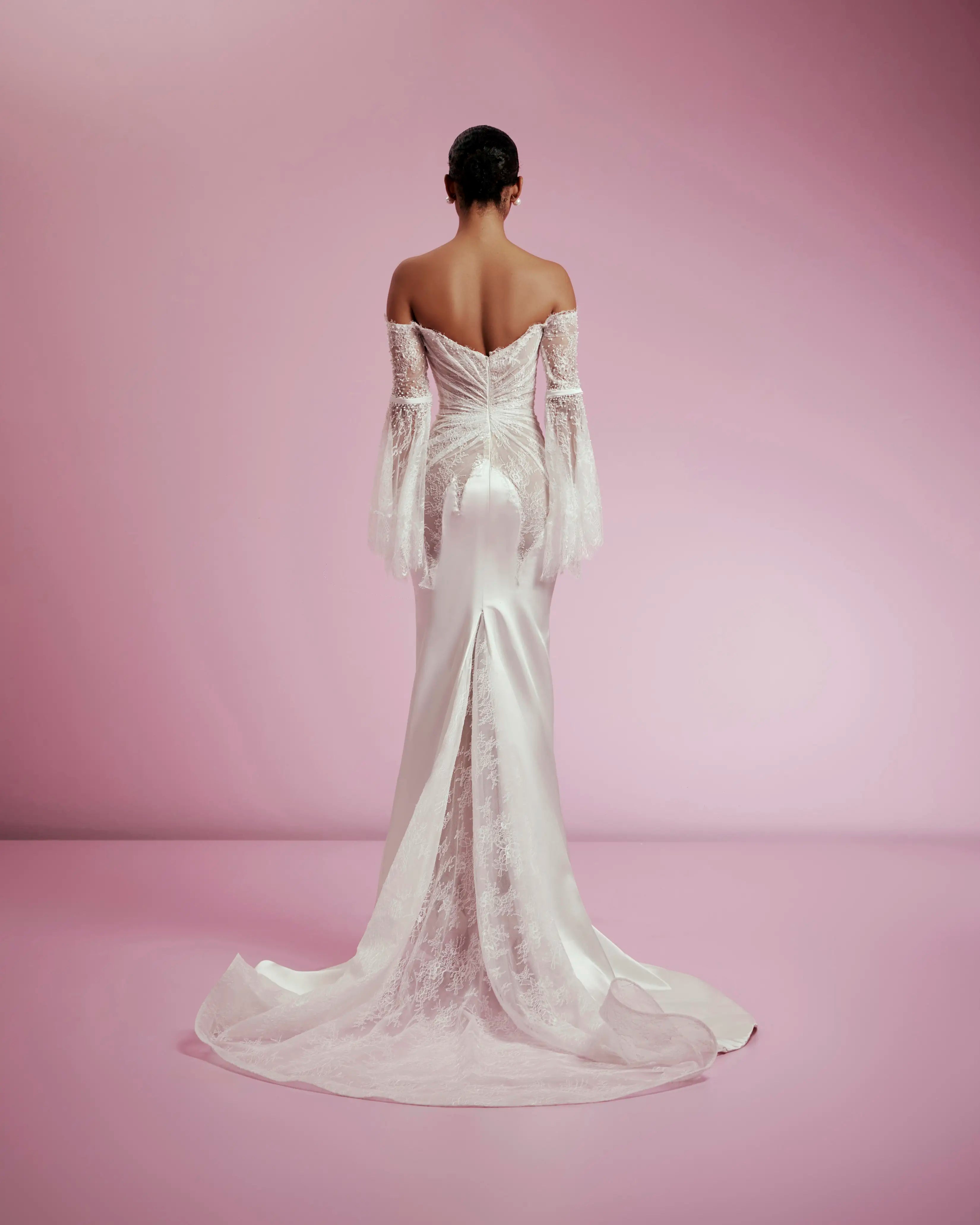 This Bridal RTW '24 - 032 dress showcases an elegant silhouette crafted from delicate lace fabric. It features a fitted bodice with intricate floral lace patterns and thin straps that add a refined, graceful touch. The dress flows smoothly into a subtle A-line skirt, offering both comfort and understated sophistication. Perfect for a modern bride seeking timeless elegance with expert tailoring and delicate craftsmanship.