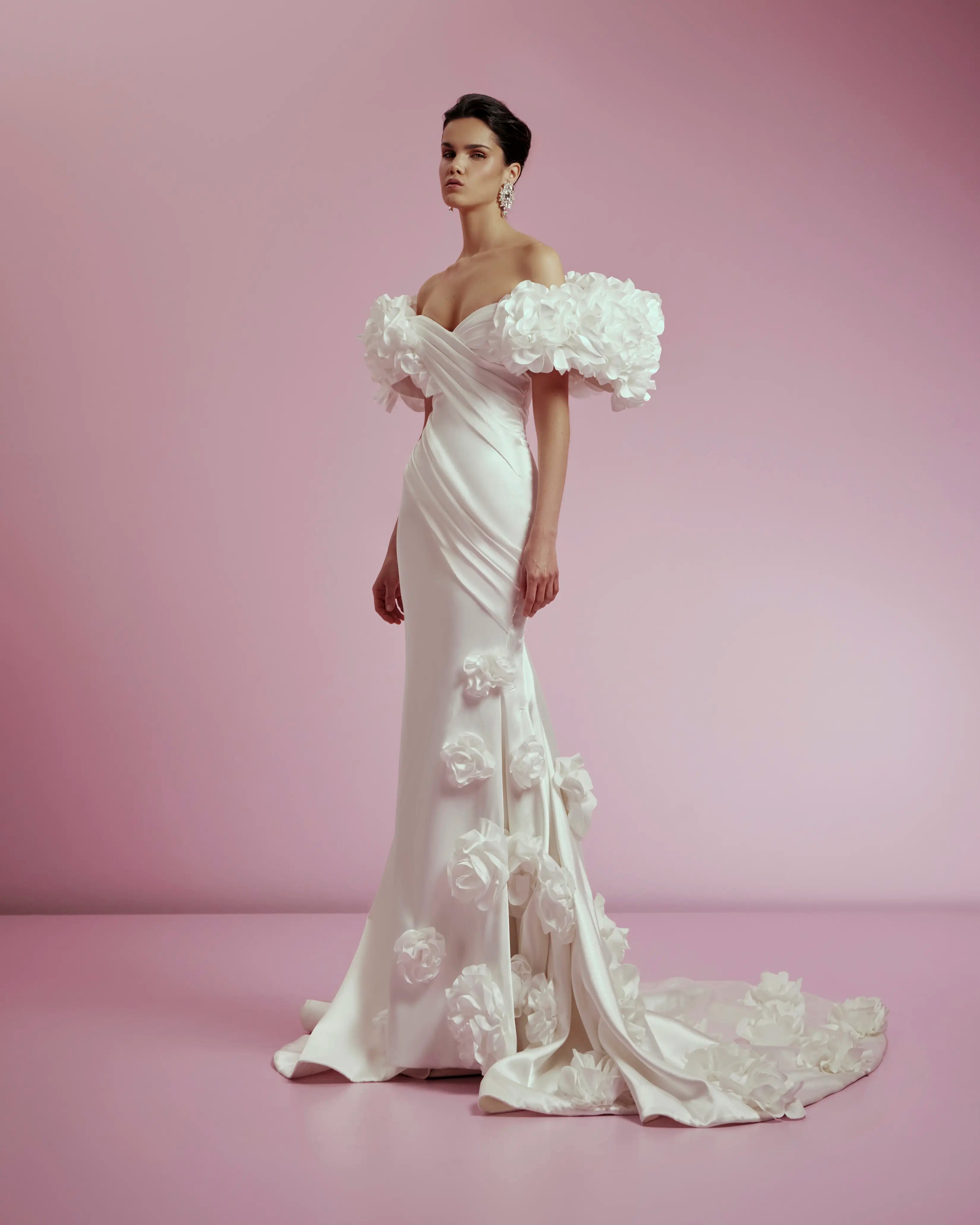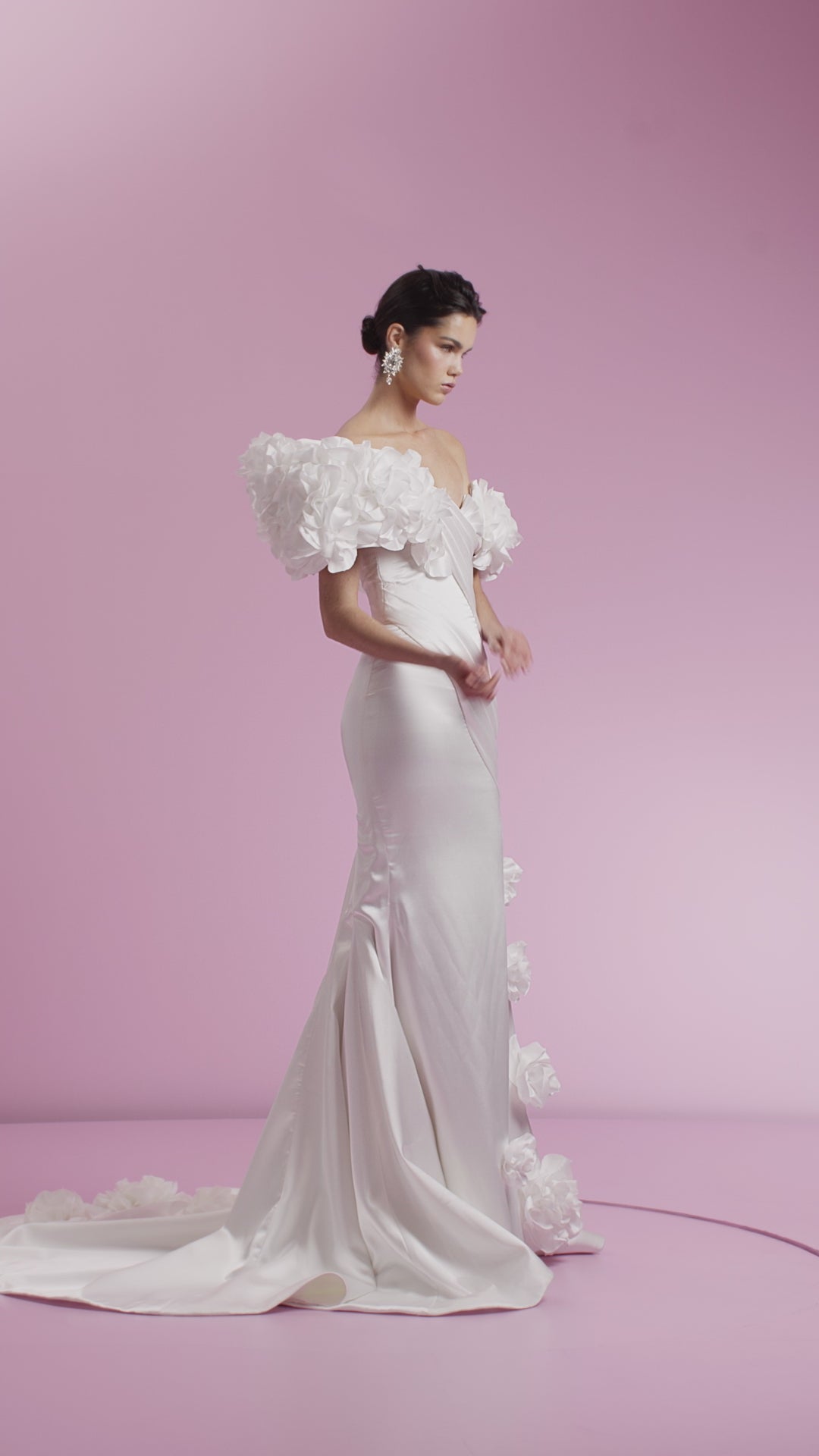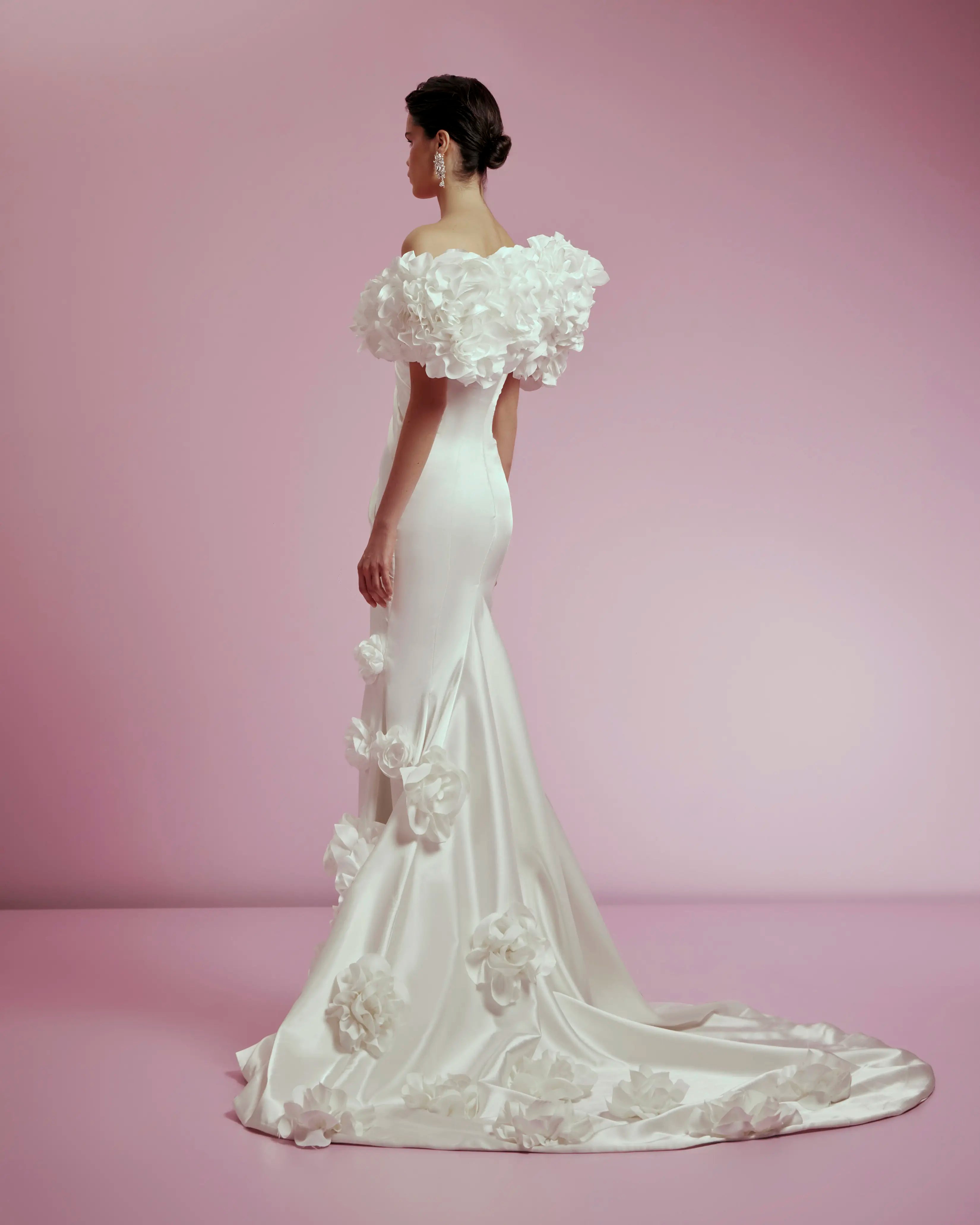 This exquisite bridal dress features a sleek, modern silhouette with a fitted bodice and a subtle flare towards the hem. Crafted from luxurious fabric, it combines elegance and understated sophistication. The delicate neckline and fine detailing enhance its timeless appeal, making it an ideal choice for a contemporary bride seeking refined style and comfort on her special day.