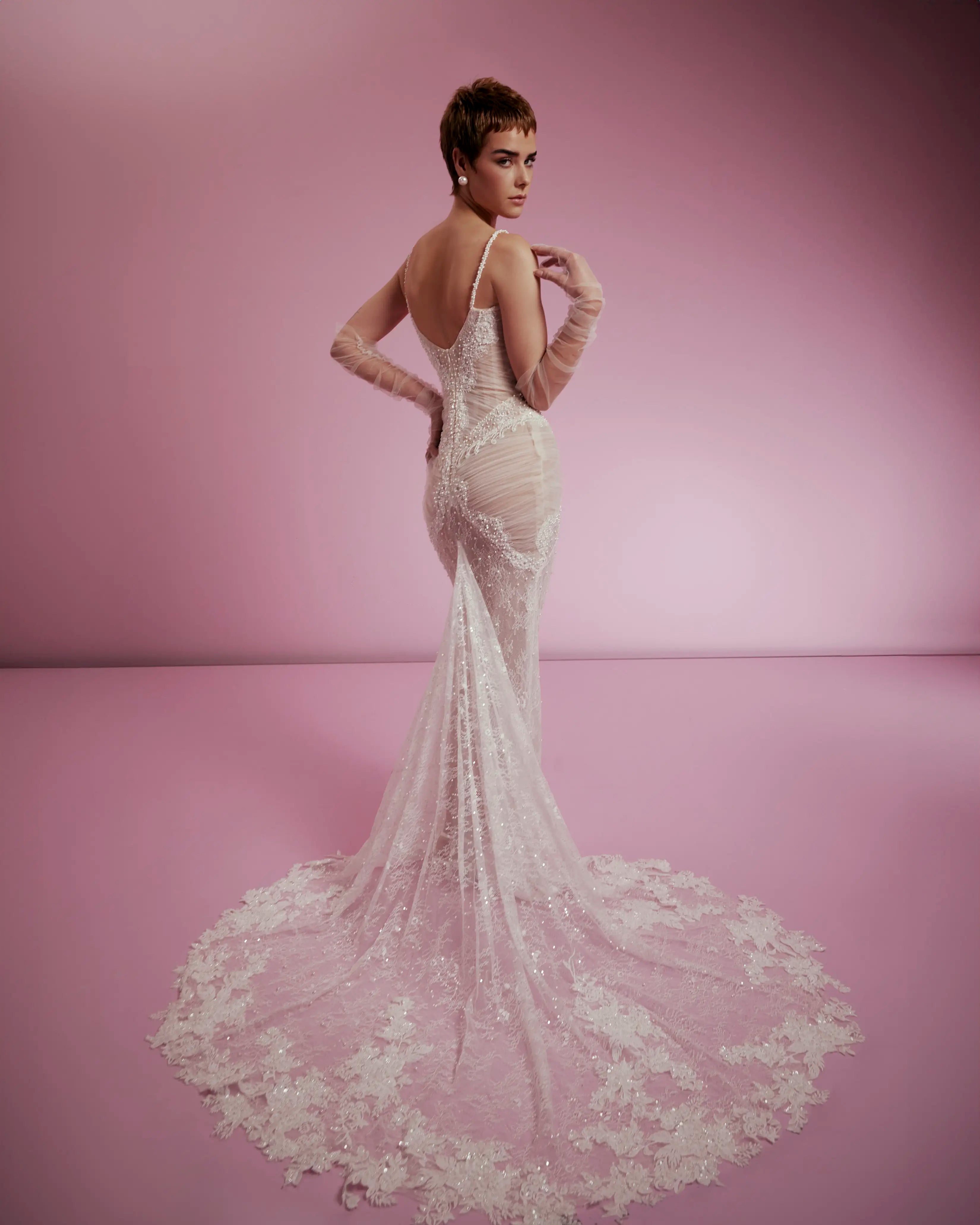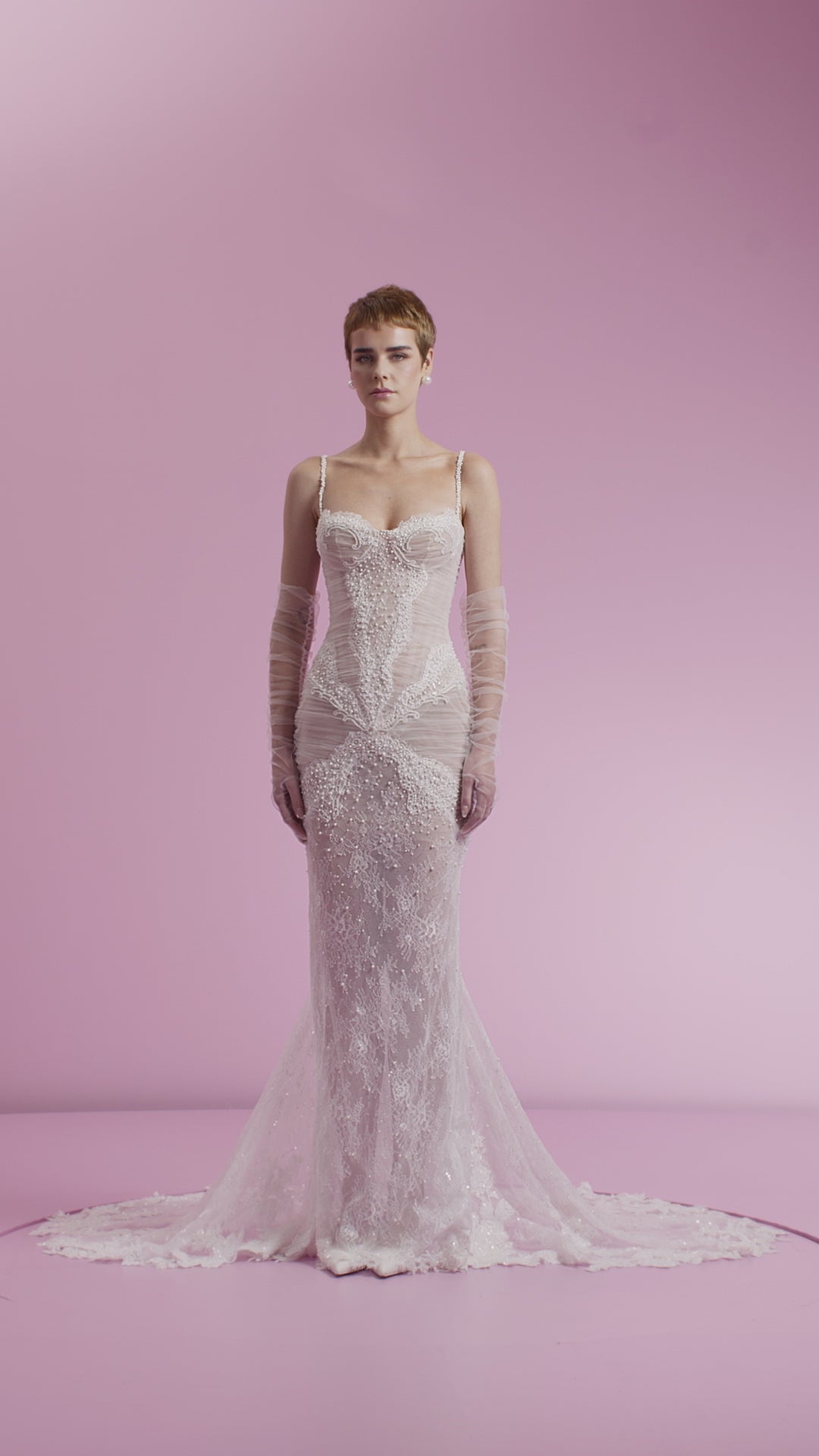 This Bridal RTW '24 - 037 dress features a sleek, modern silhouette with a minimalist design that emphasizes elegance and sophistication. The fabric appears smooth and structured, providing a flattering fit that contours the body gracefully. Its clean lines and subtle detailing make it an ideal choice for a contemporary bride seeking timeless refinement and understated luxury on her special day.