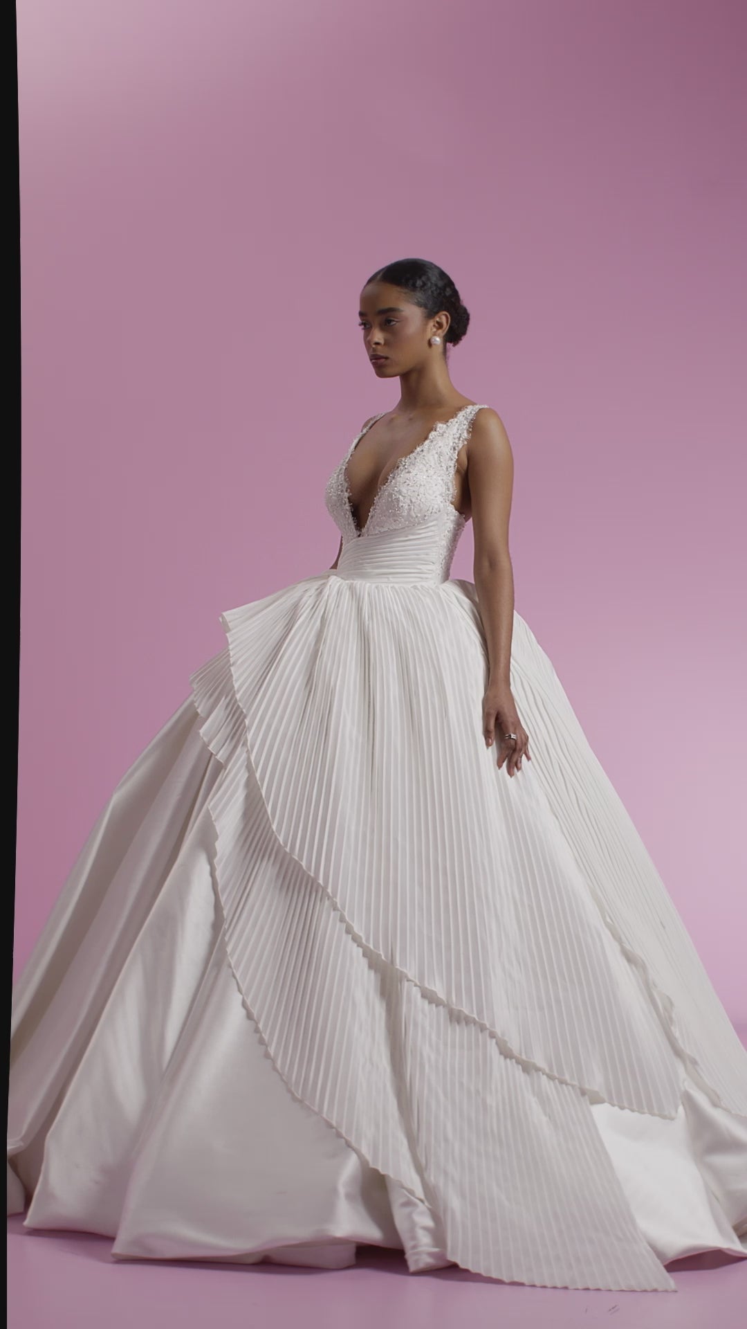This bridal dress from the RTW '24 collection features a sleek, floor-length silhouette crafted from delicate, sheer fabric adorned with intricate lace appliqués. The gown showcases a fitted bodice with a subtle sweetheart neckline beneath a soft illusion overlay, extending into long, sheer sleeves that add an ethereal elegance. Its flowing skirt enhances movement while maintaining a refined, graceful presence, making it a perfect choice for a modern bride seeking timeless sophistication and delicate detailing.