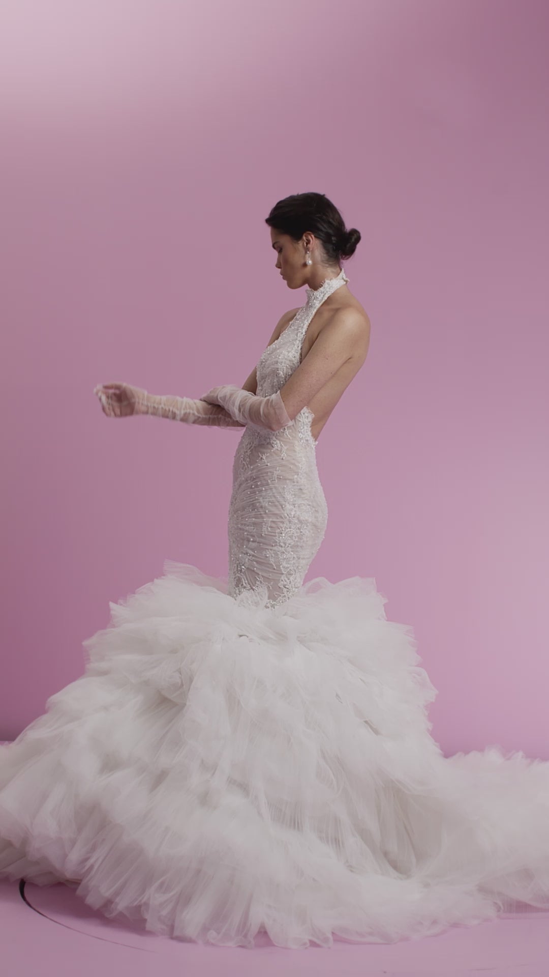 High-Neck White Lace Dress with Tulle Voluminous Skirt and Gloves
