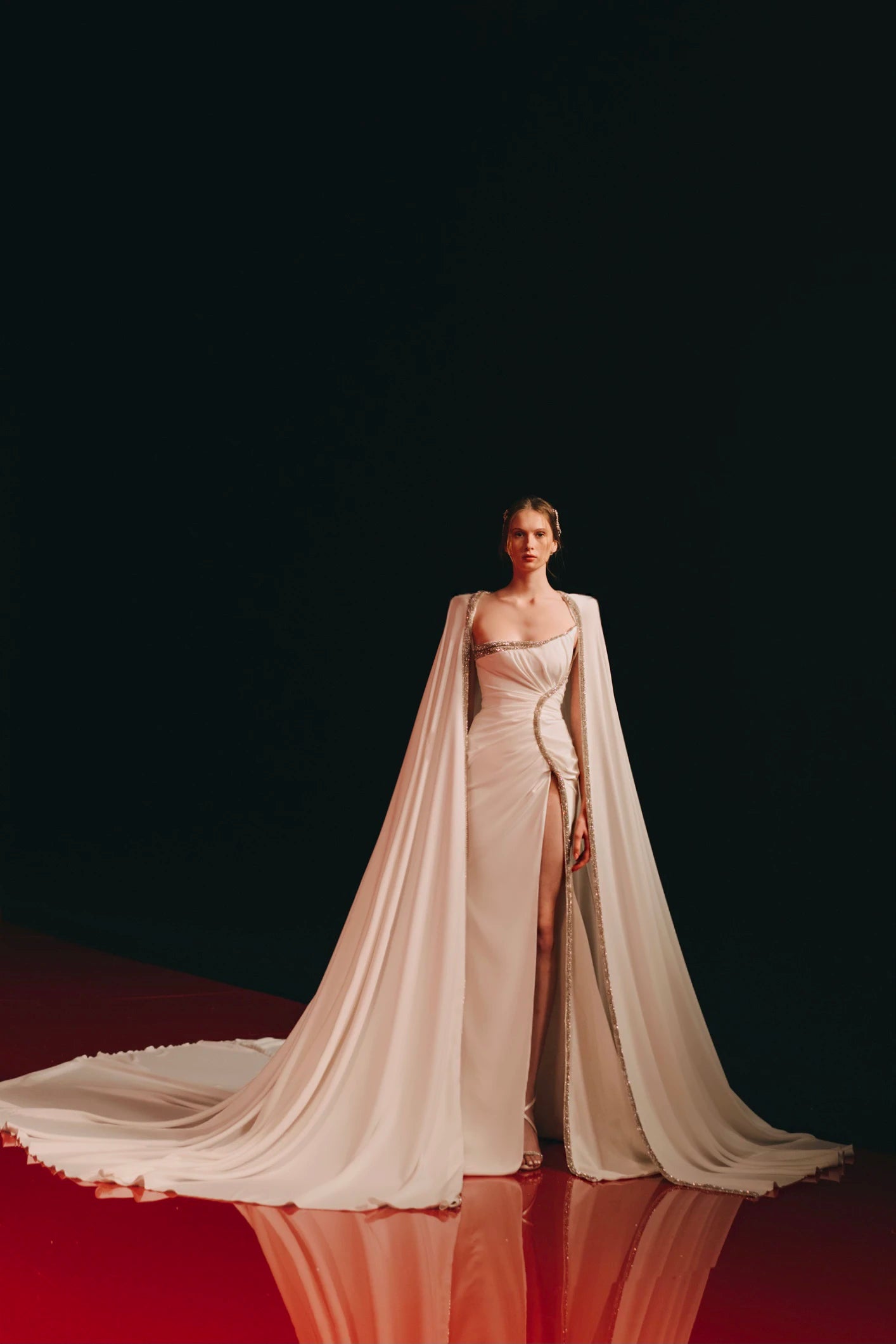 CREPE CAPE WITH SILVER BEADS AND CRYSTAL DETAILS, DRAPED BODICE WITH A HIGH-THIGH SLIT.