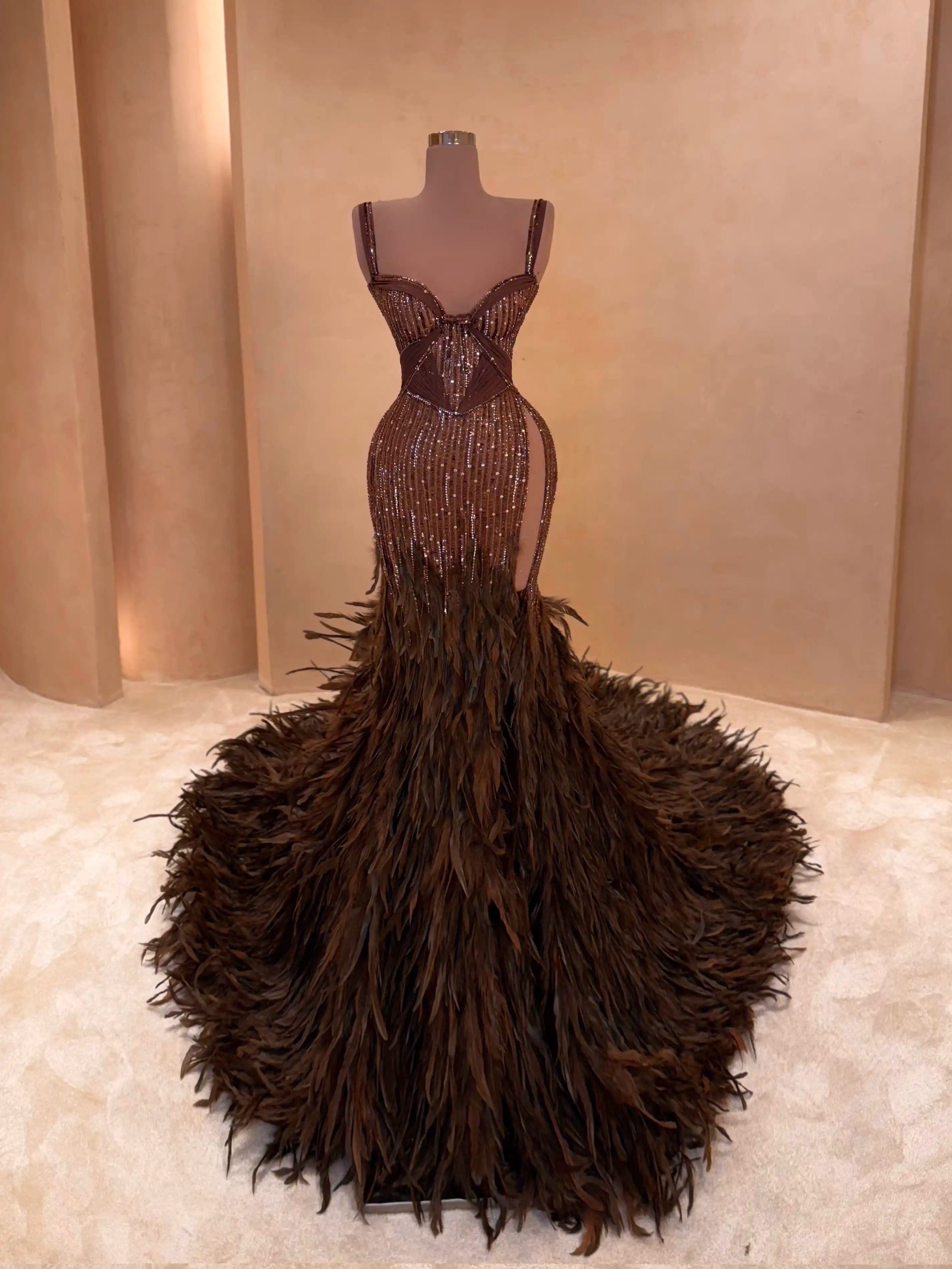 Make a bold statement in this sultry cut-out gown, crafted from shimmering bronze mesh and rich brown feathers. The sculpted silhouette and open back add drama, while long cape-like sleeves bring movement and glamour to every step.
