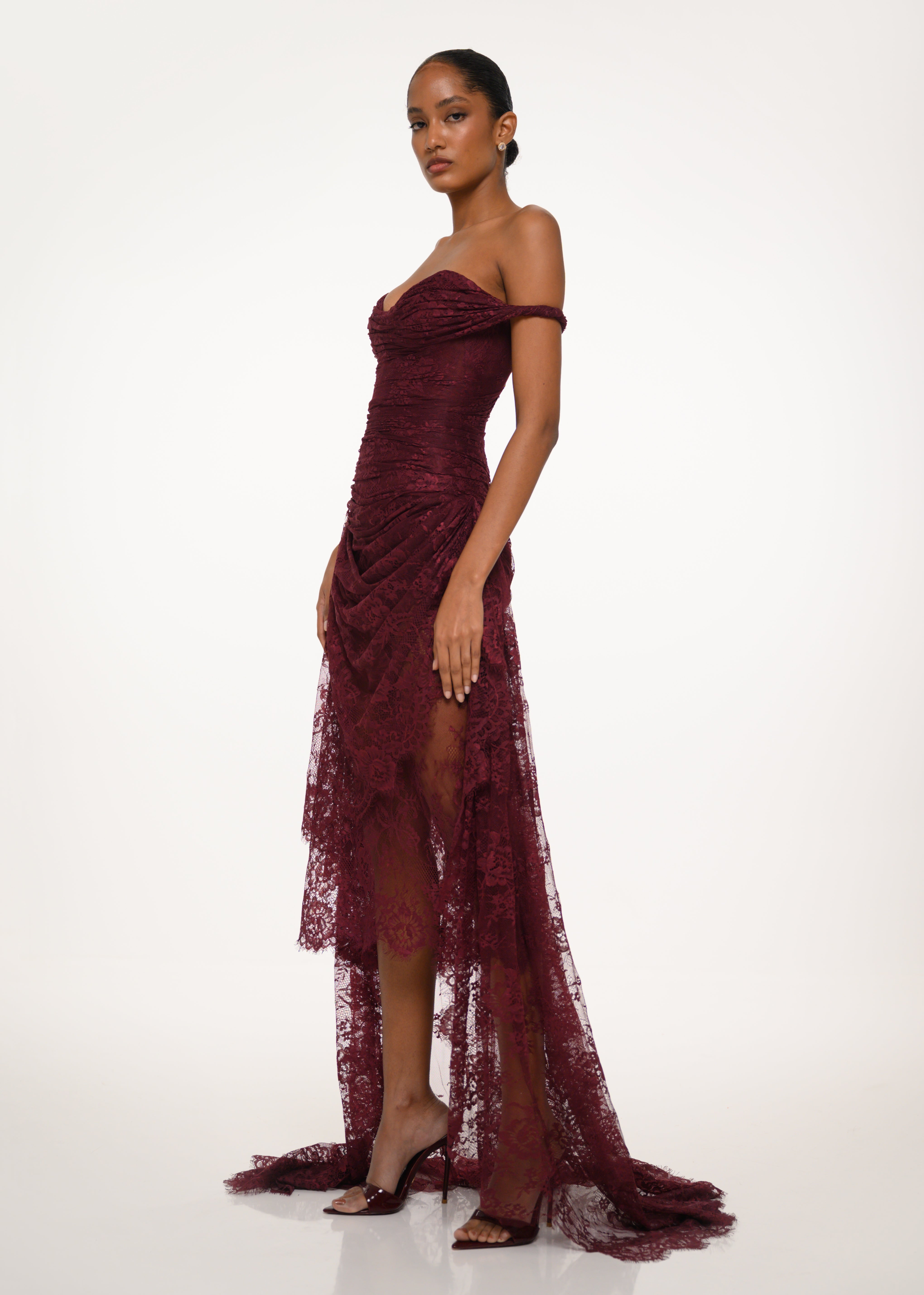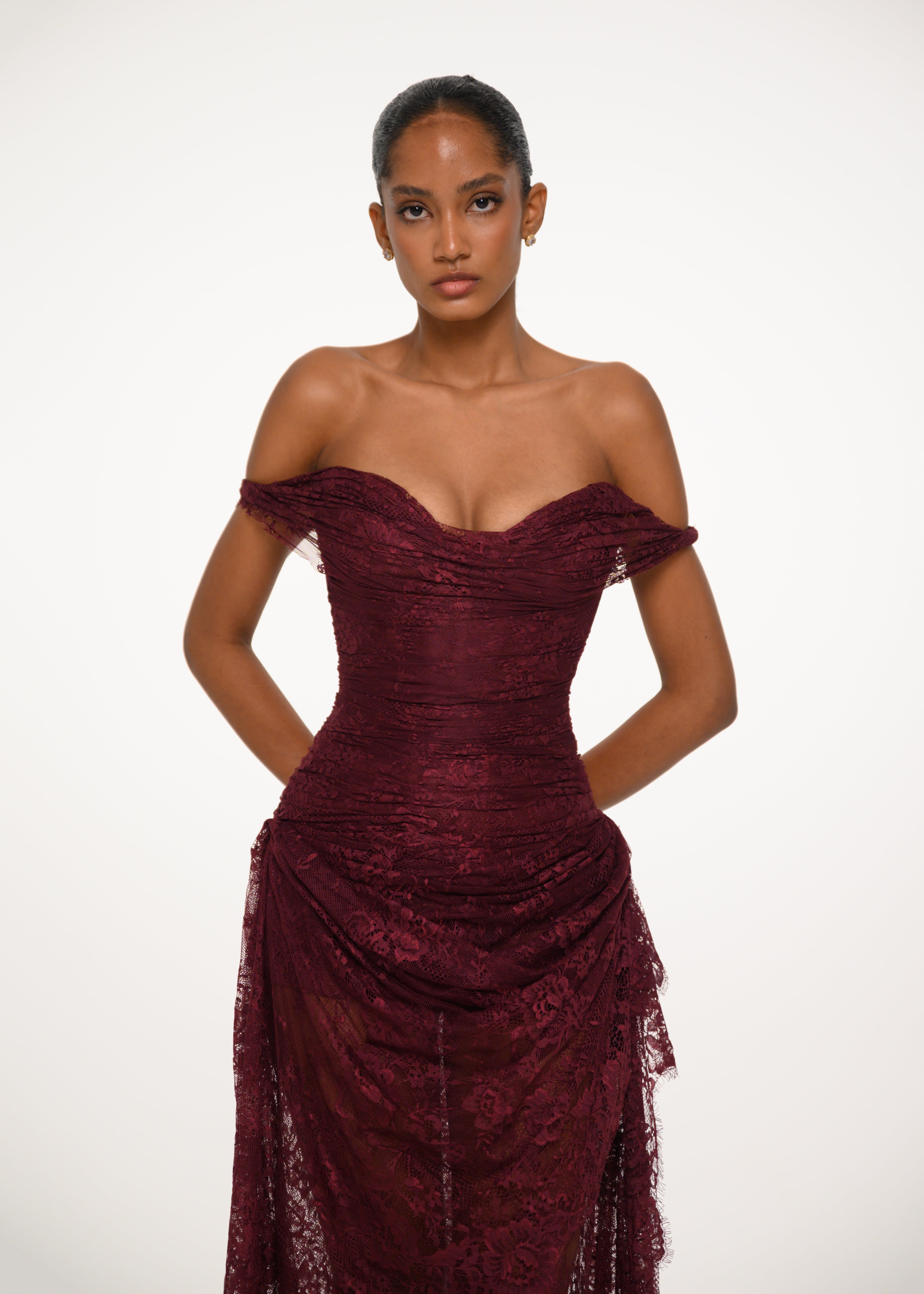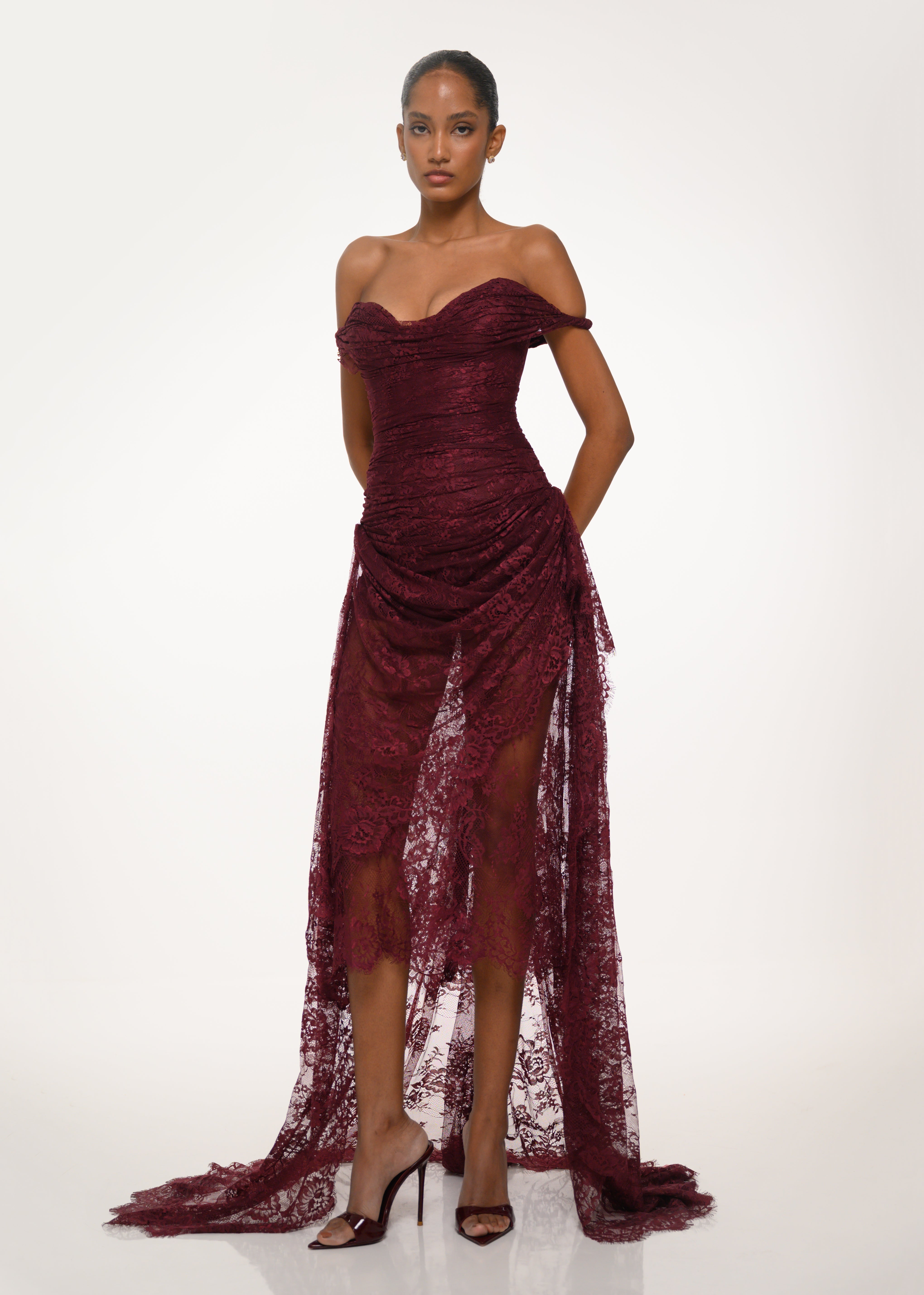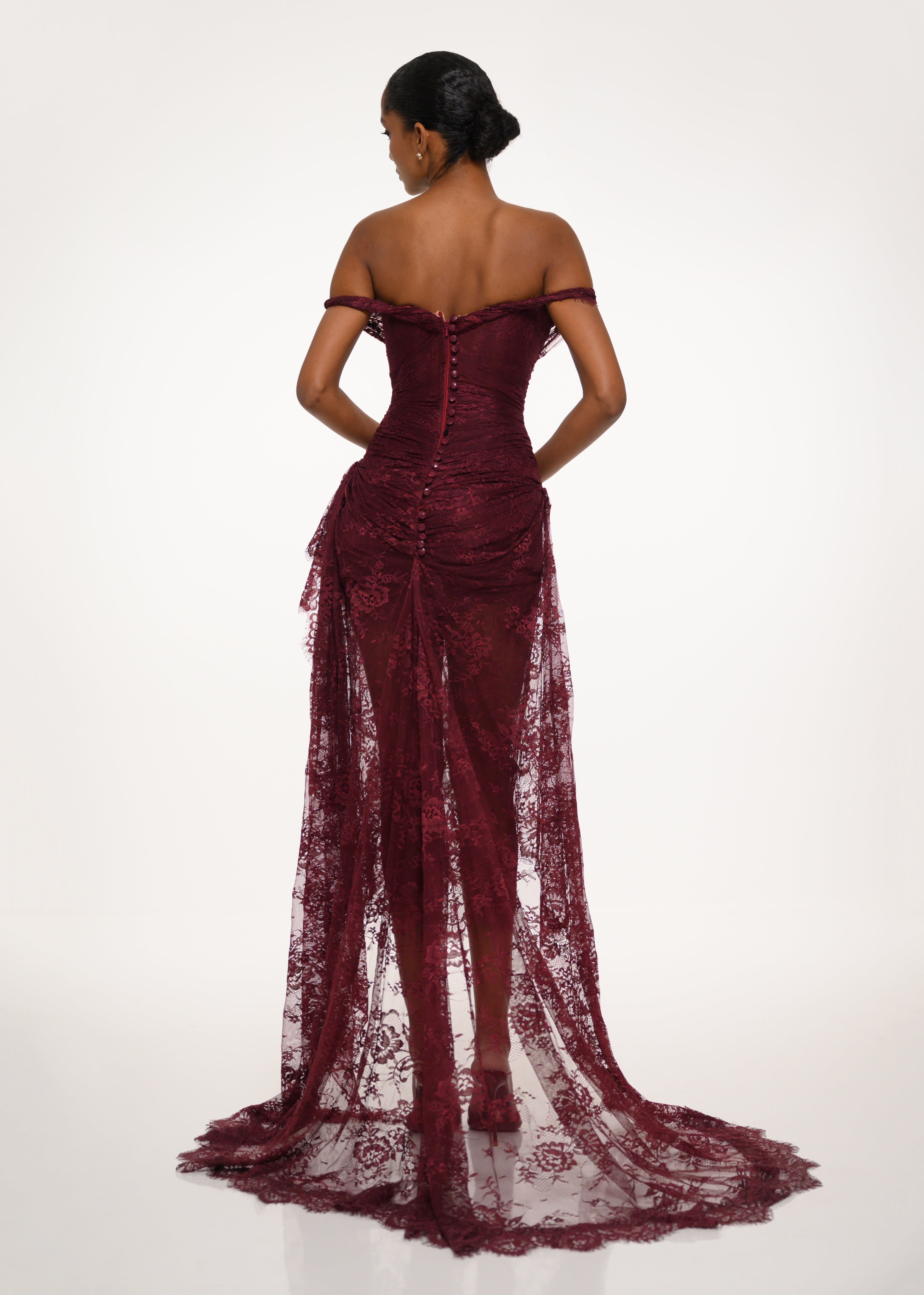 A romantic burgundy lace dress with an off-shoulder neckline and draped detailing — blending vintage charm with modern sensuality.