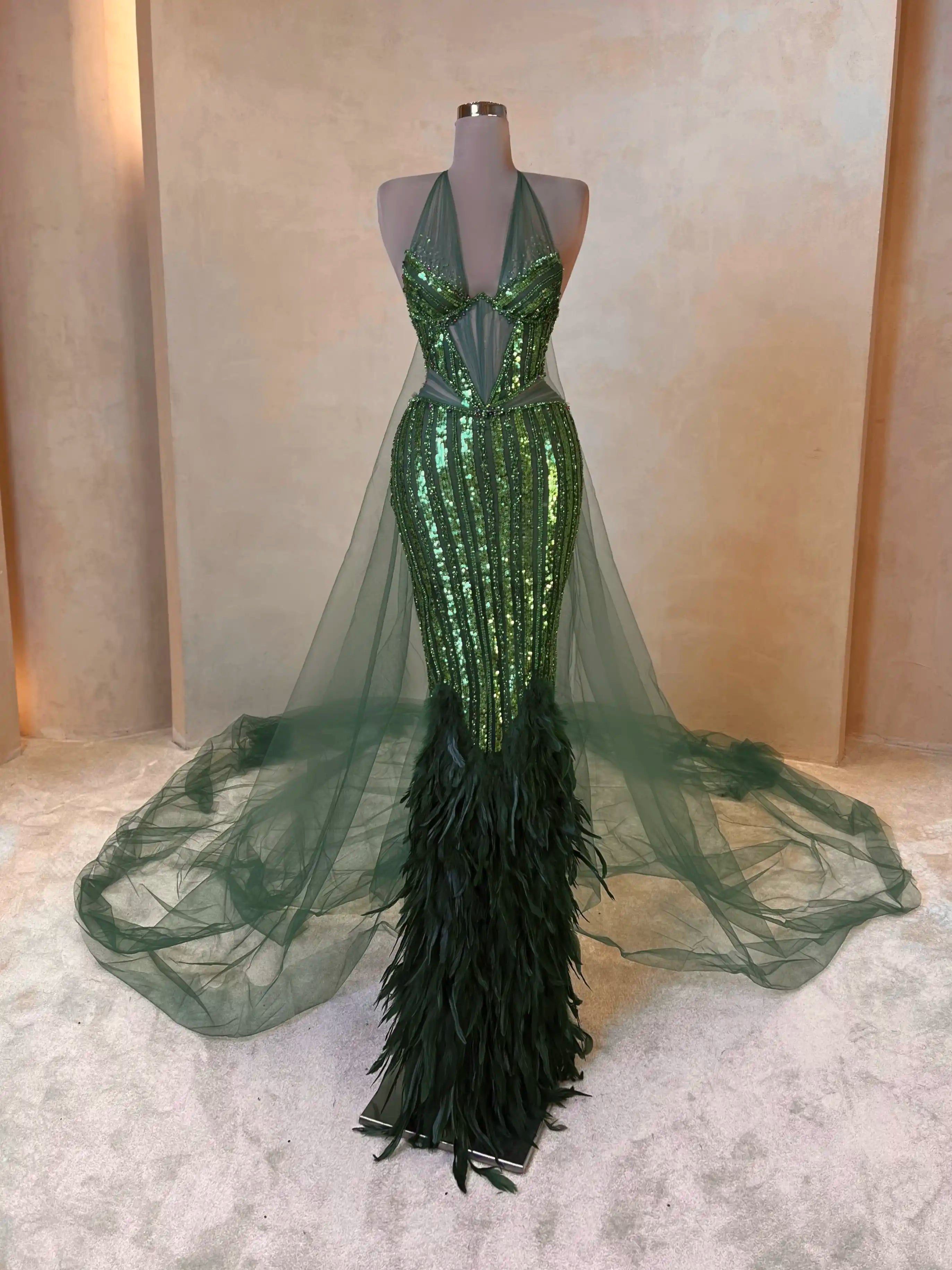 A vibrant emerald gown that blends bold glamour with elegance. Featuring a sculpted bodice, sheer paneling, and sparkling embellishments throughout, it’s finished with dramatic cape sleeves and a voluminous feathered train for a look that’s unapologetically powerful.