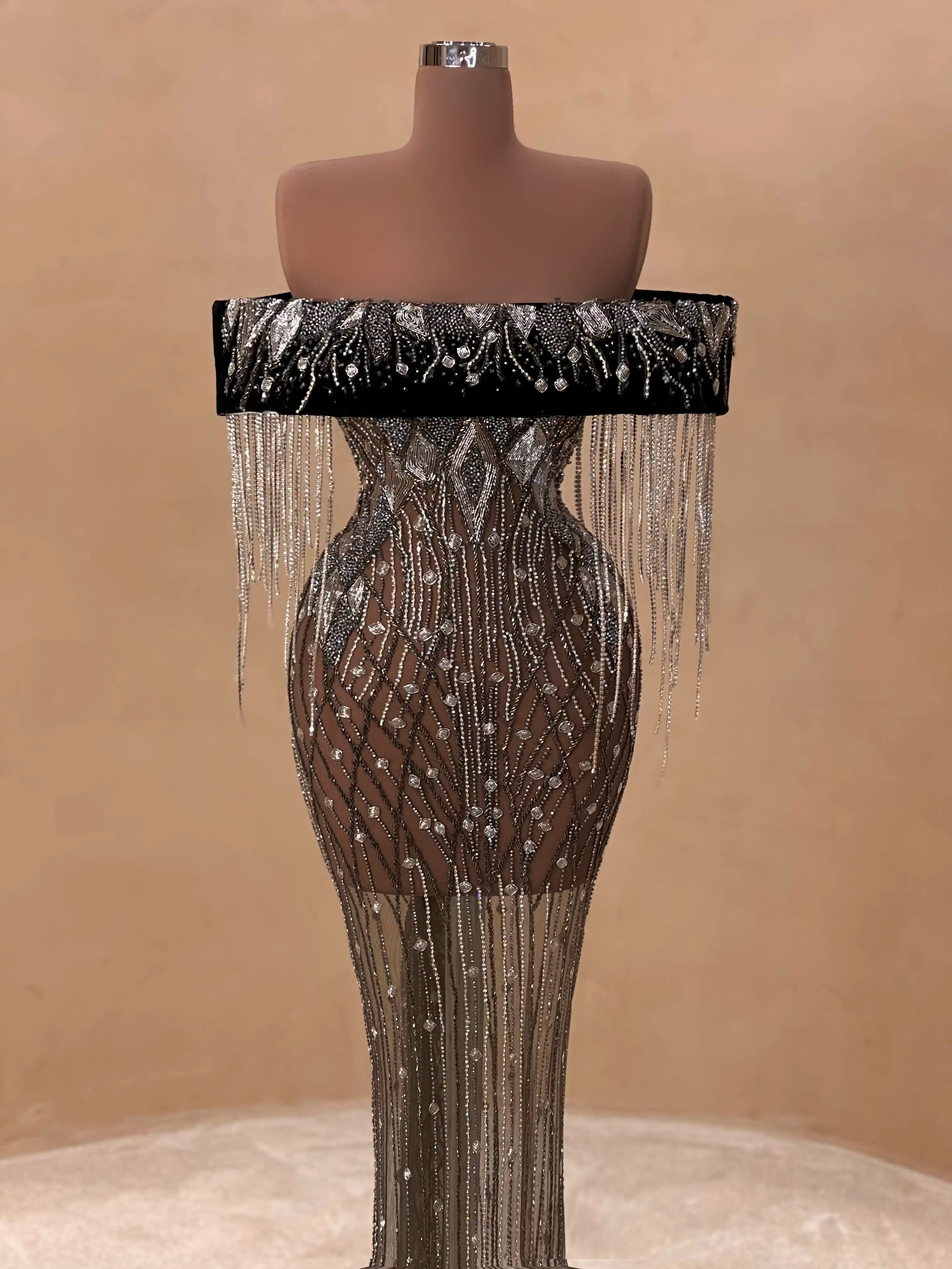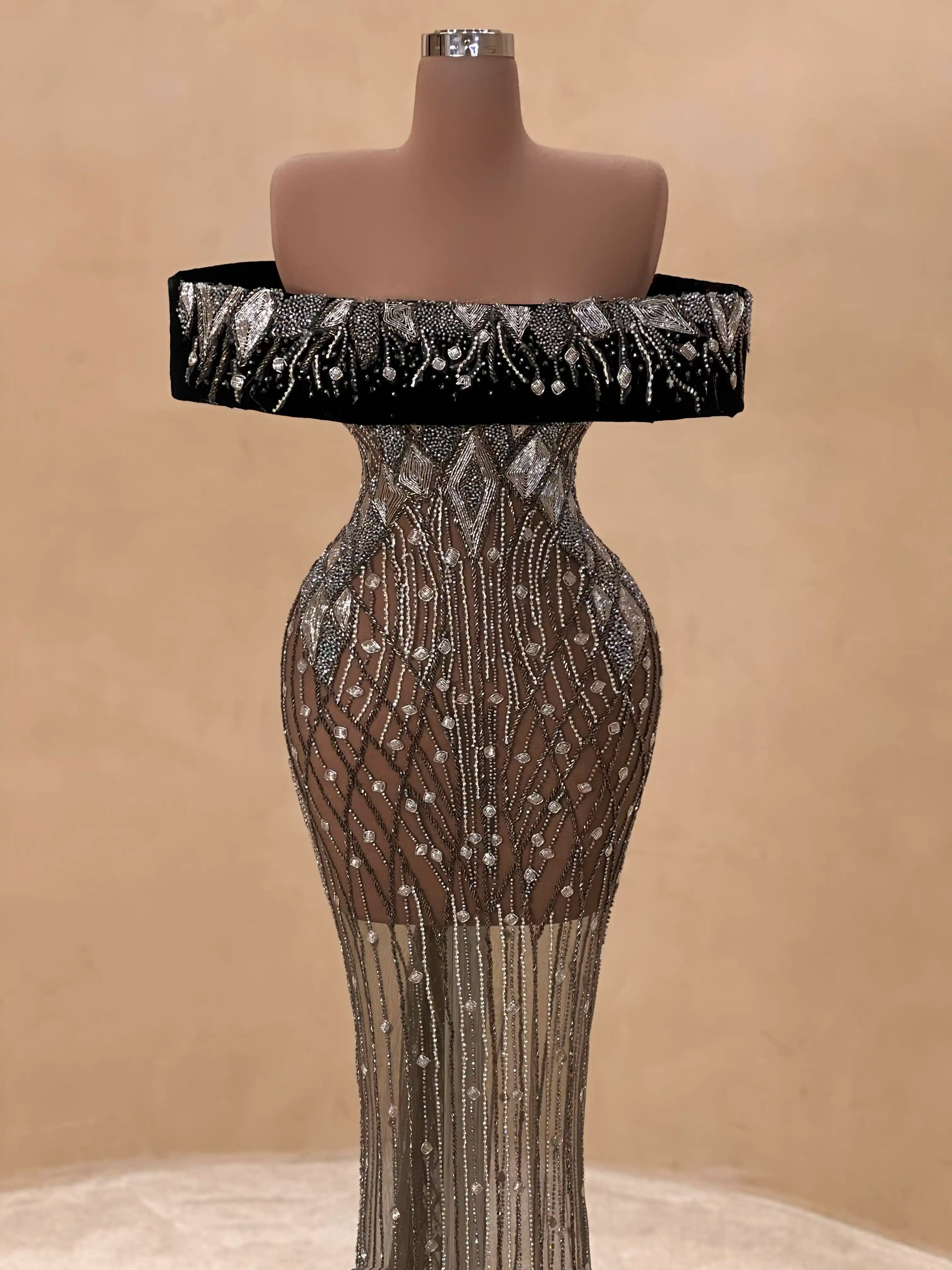 Futuristic meets elegance in this asymmetric beaded gown, featuring architectural shoulder detailing and a curve-hugging silhouette. Covered in shimmering embellishments, this dress redefines couture with a bold modern twist.