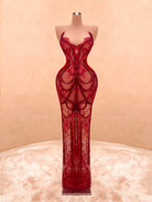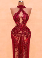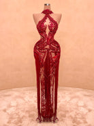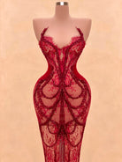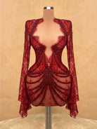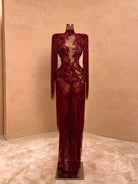Command the room in this striking red lace gown, featuring intricate dragon embroidery, daring cutouts, and cascading fringe sleeves. A fierce statement for the fearless.