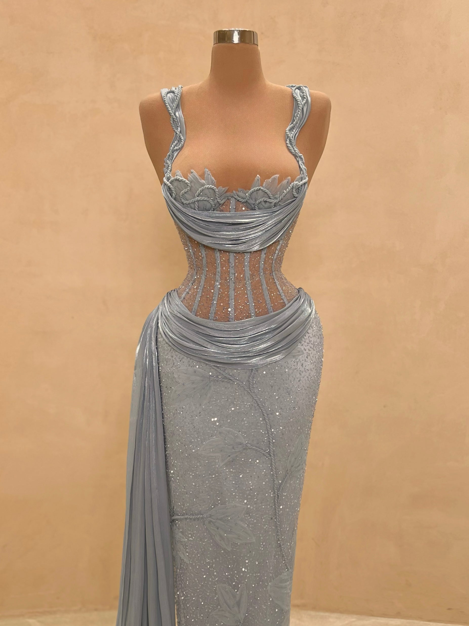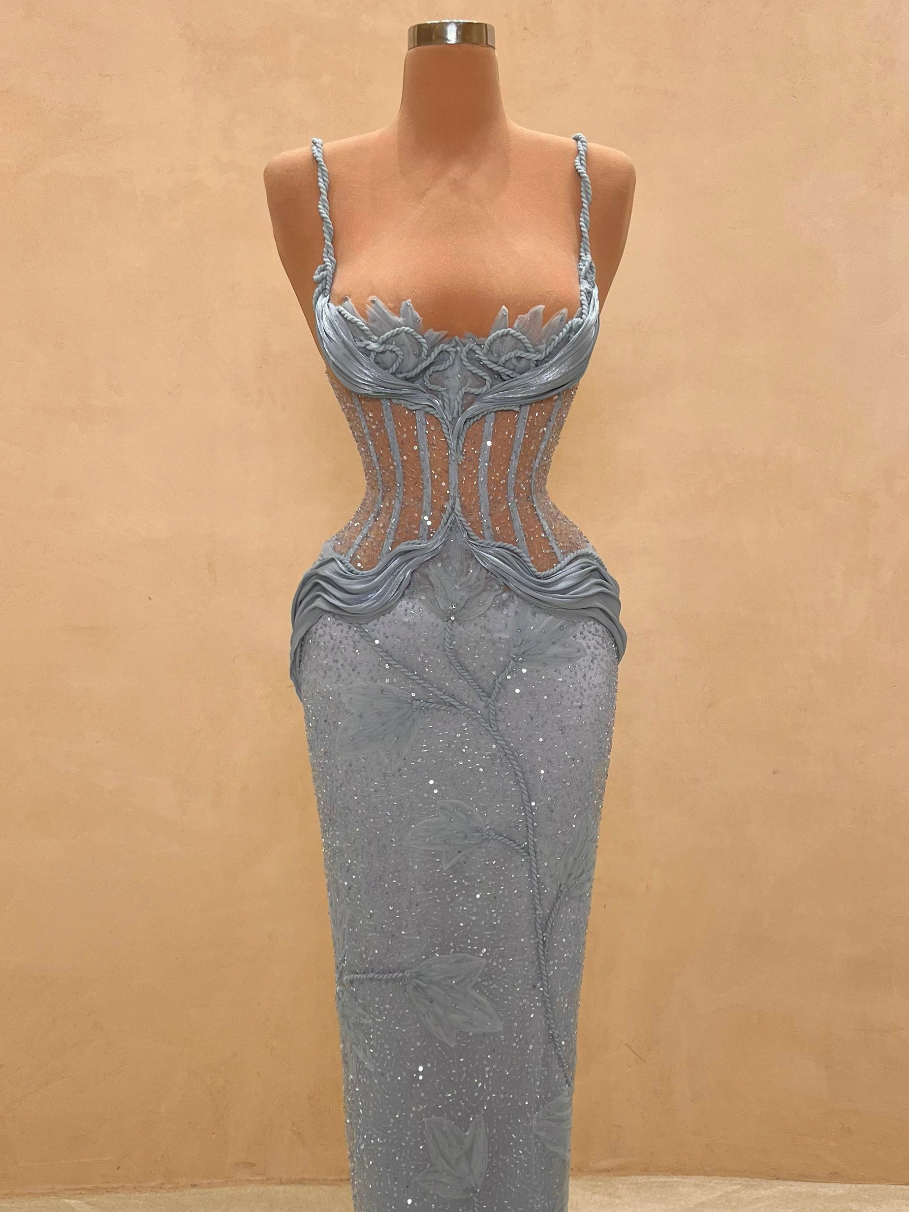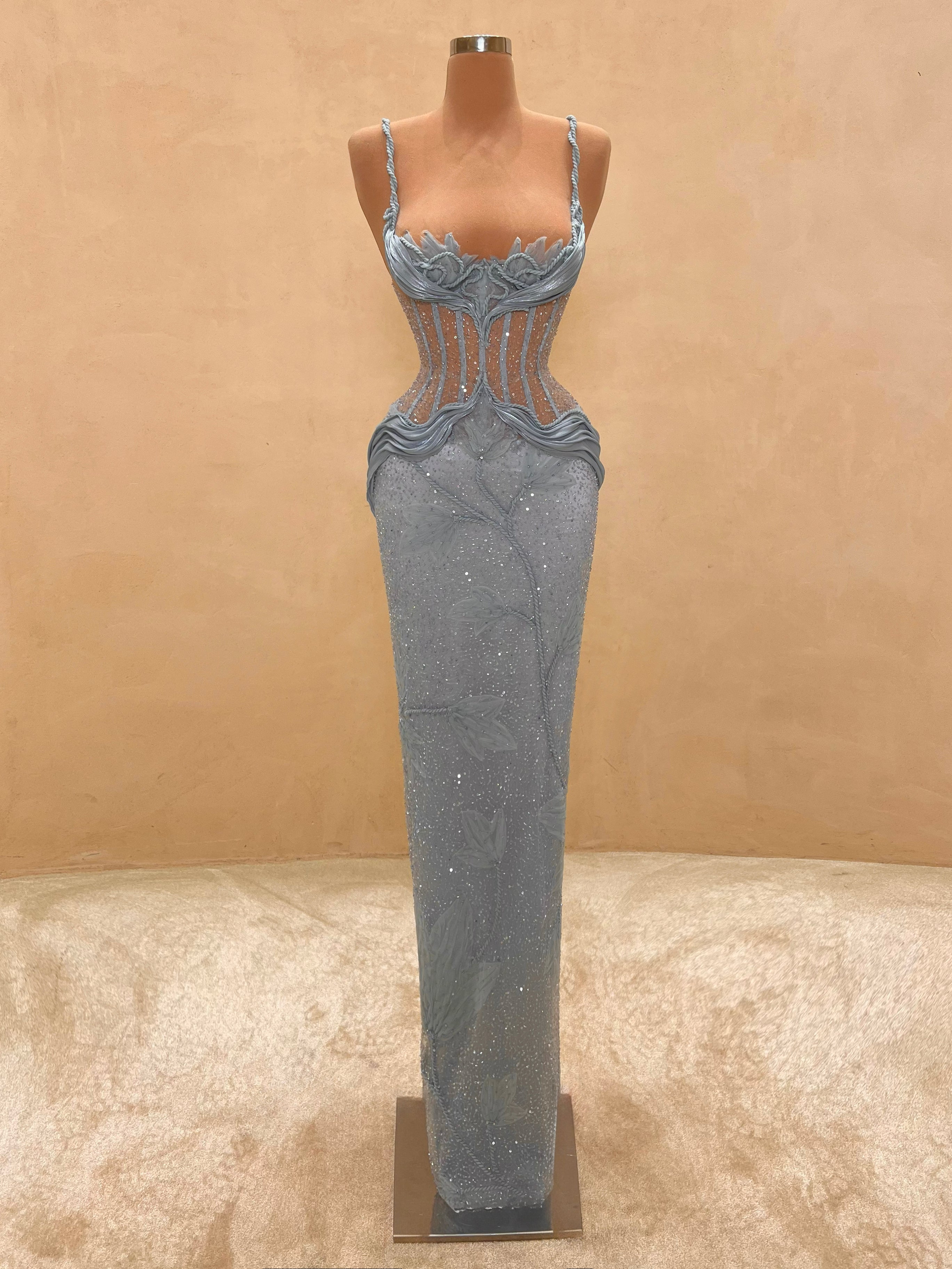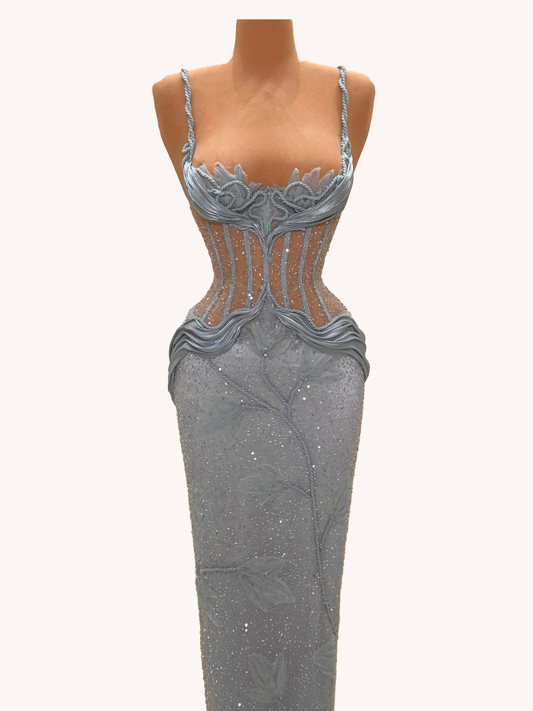 - Long fitted glitter-embellished skirt with embroidered botanical motifs