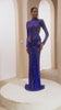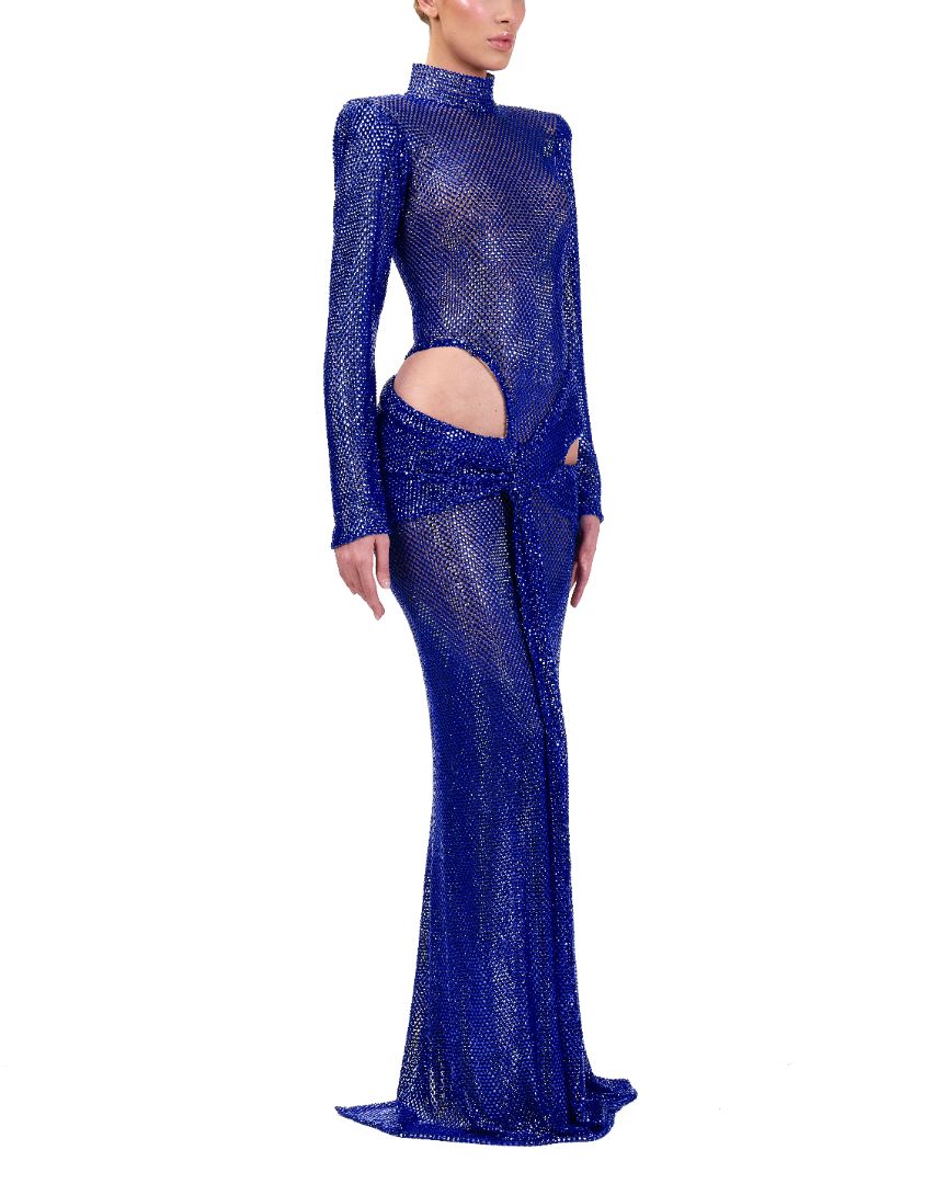This elegant blue dress features a high neck and long sleeves, offering a sophisticated silhouette. Its floor-length design adds a touch of grandeur, while daring side cutouts introduce a modern edge. Perfect for formal occasions, this dress balances refinement with contemporary style.