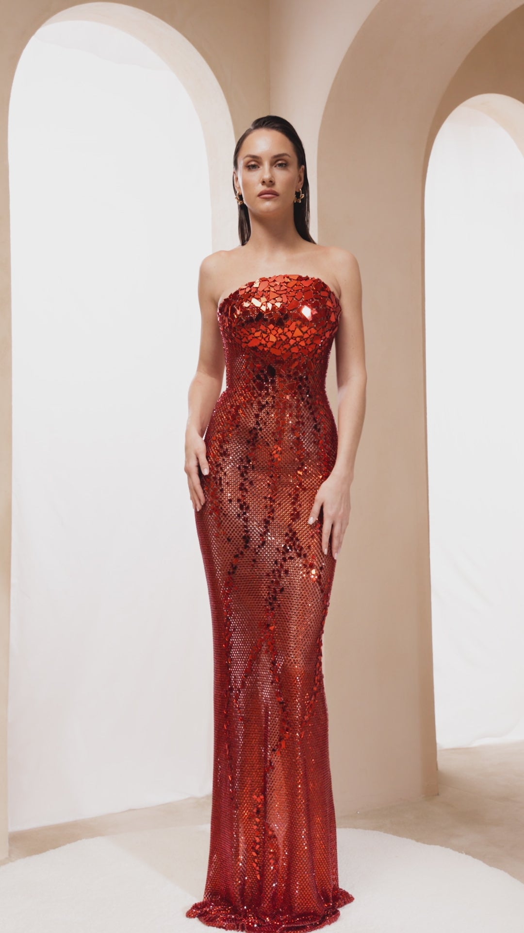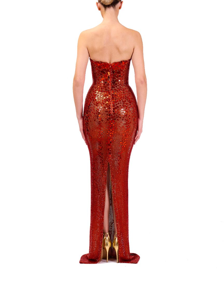 This strapless dress features a metallic corset bodice that provides structured support and a sophisticated shine. Its fitted waist accentuates the silhouette, flowing into a straight, tailored skirt for a sleek and elegant look. Perfect for formal occasions, its design combines modern glamour with precise tailoring to enhance confidence and style.