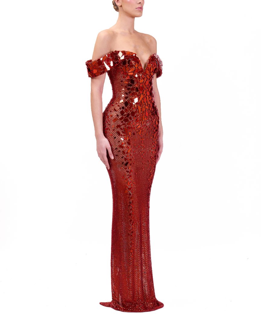 Elevate your evening look with the GLAMJAM - 12, featuring a striking red dress paired with a metallic corset bodice that sculpts and defines the silhouette. The off-shoulder design adds a touch of elegance while highlighting the neckline and shoulders, making it perfect for formal events or special occasions. Crafted for a confident fit, this dress combines bold metallic accents with classic sophistication.