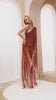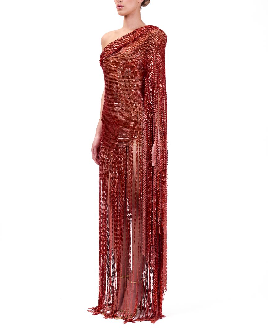 This striking red dress features an asymmetrical neckline that adds modern elegance, while the fringed skirt creates dynamic movement and visual interest. Designed to combine sophistication with playful flair, it is ideal for those who want to make a confident statement at any event. The carefully crafted silhouette enhances your shape, making it a perfect choice for formal occasions or stylish evenings out.