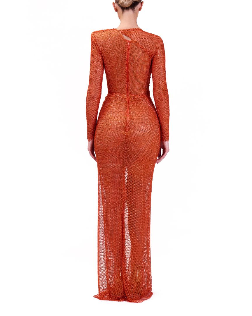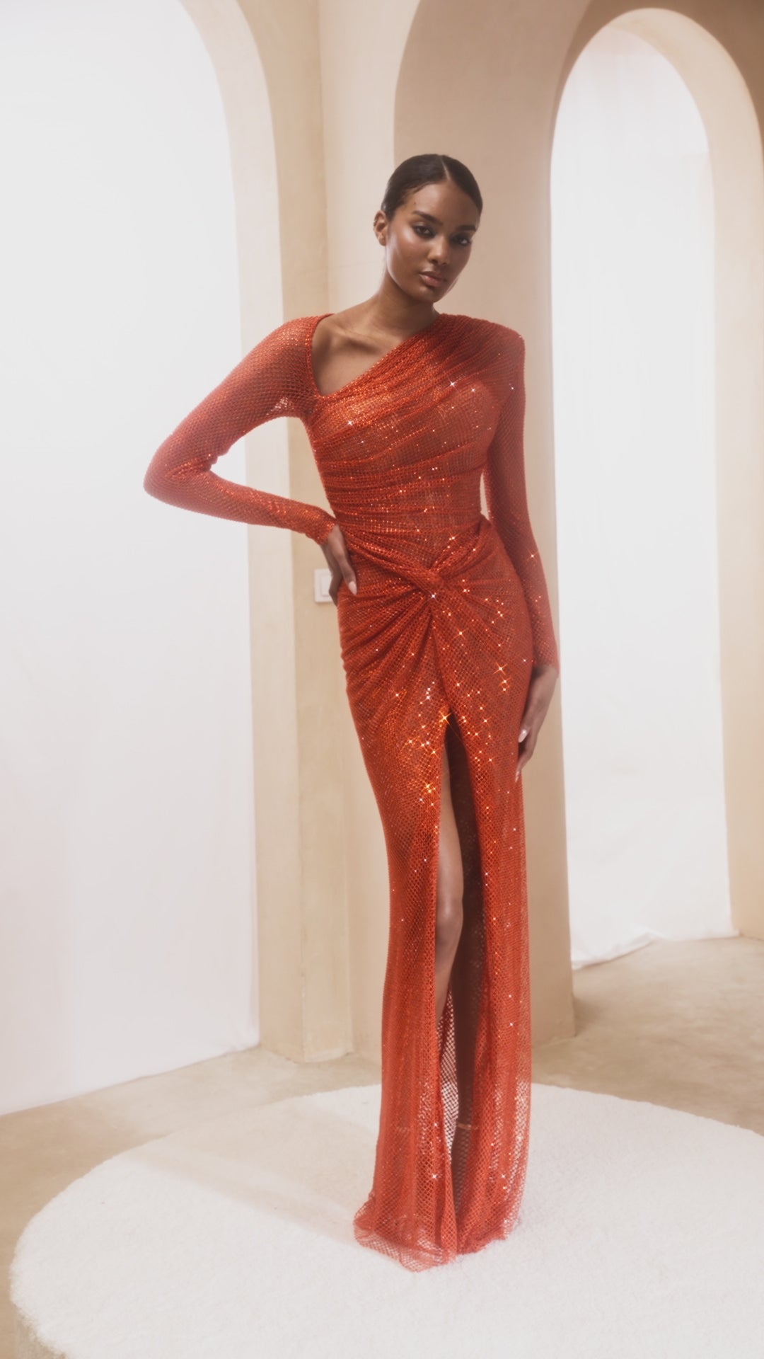 Long orange dress with a one-shoulder neckline and long sleeves.