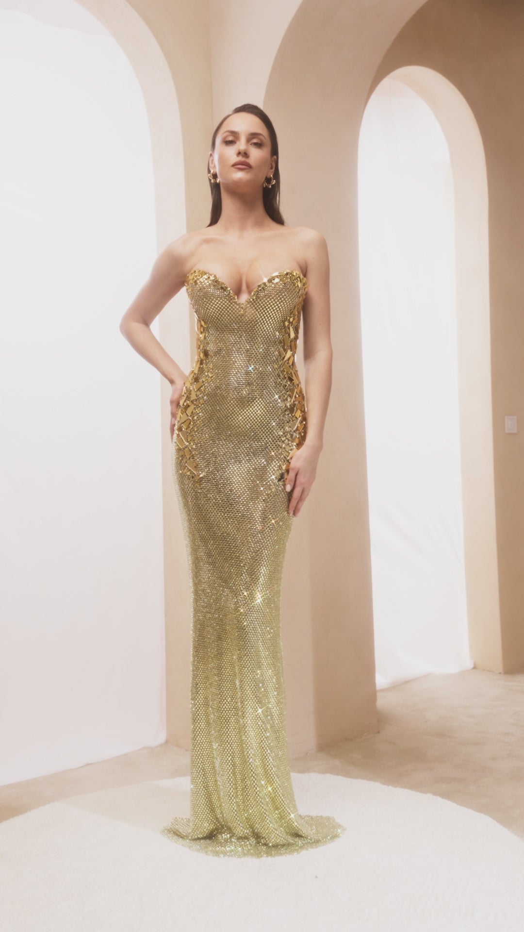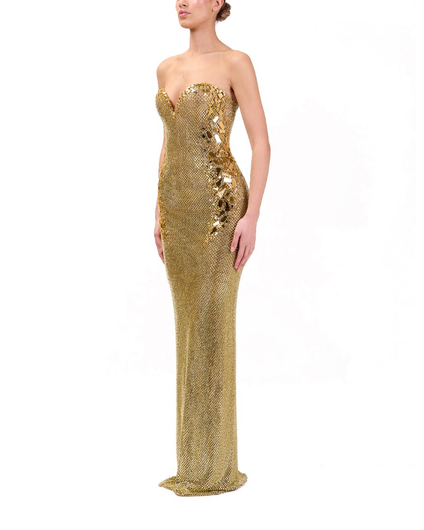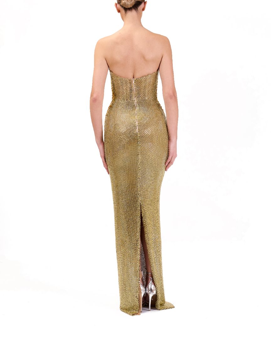 strapless, form-fitting, gold maxi dress with sequin embellishments.
