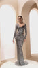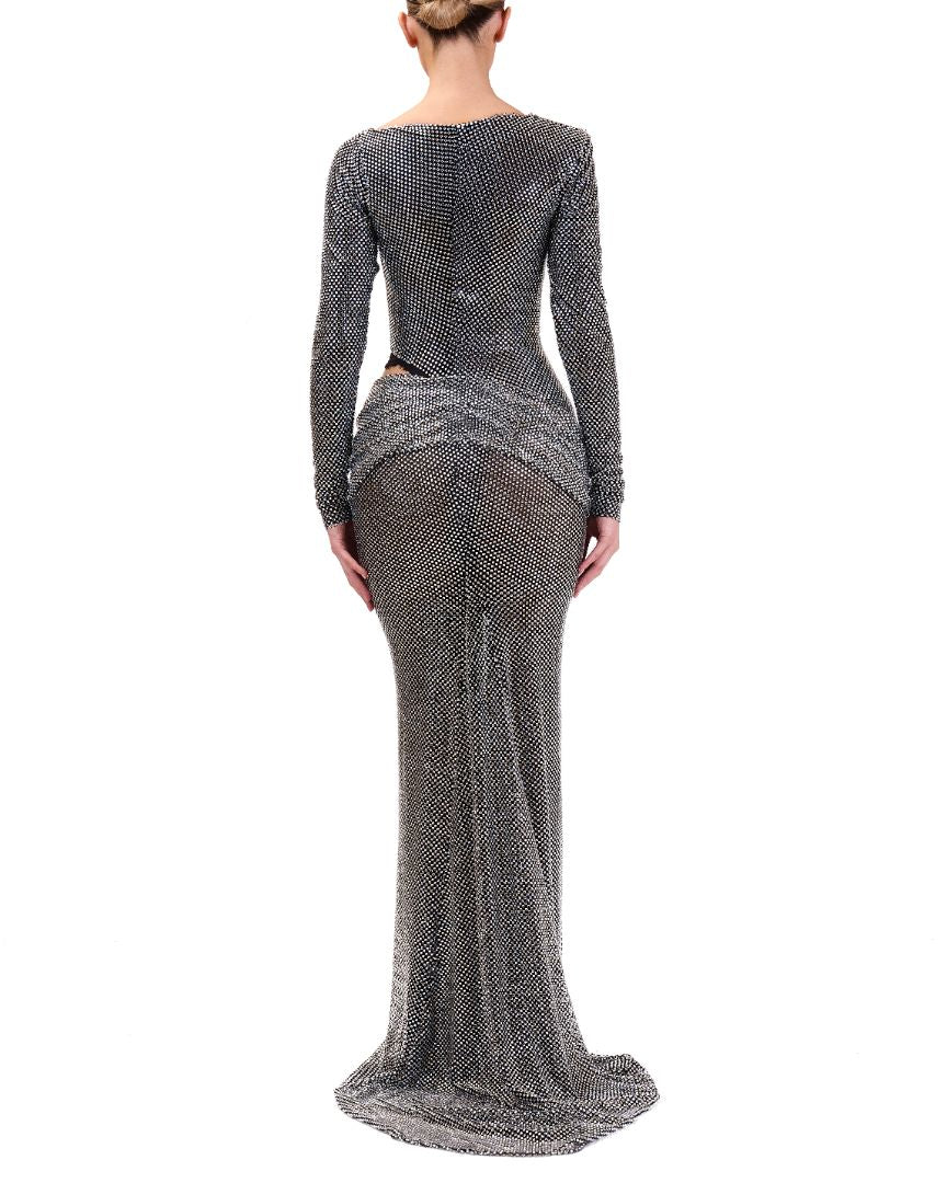 The gown is designed with a sleek, form-fitting silhouette that extends into a sweeping train, emphasizing both sophistication and grace.