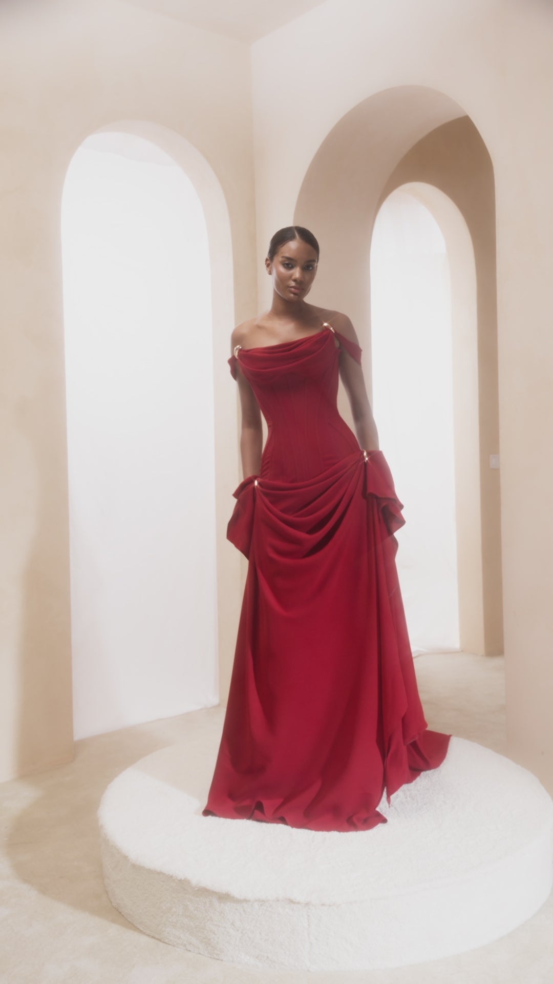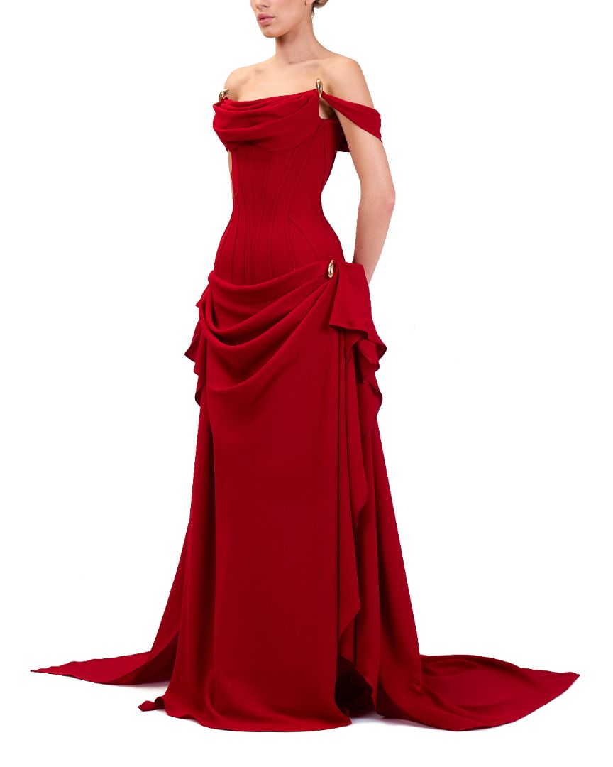 red, off-the-shoulder, floor-length dress with a train and bow details.