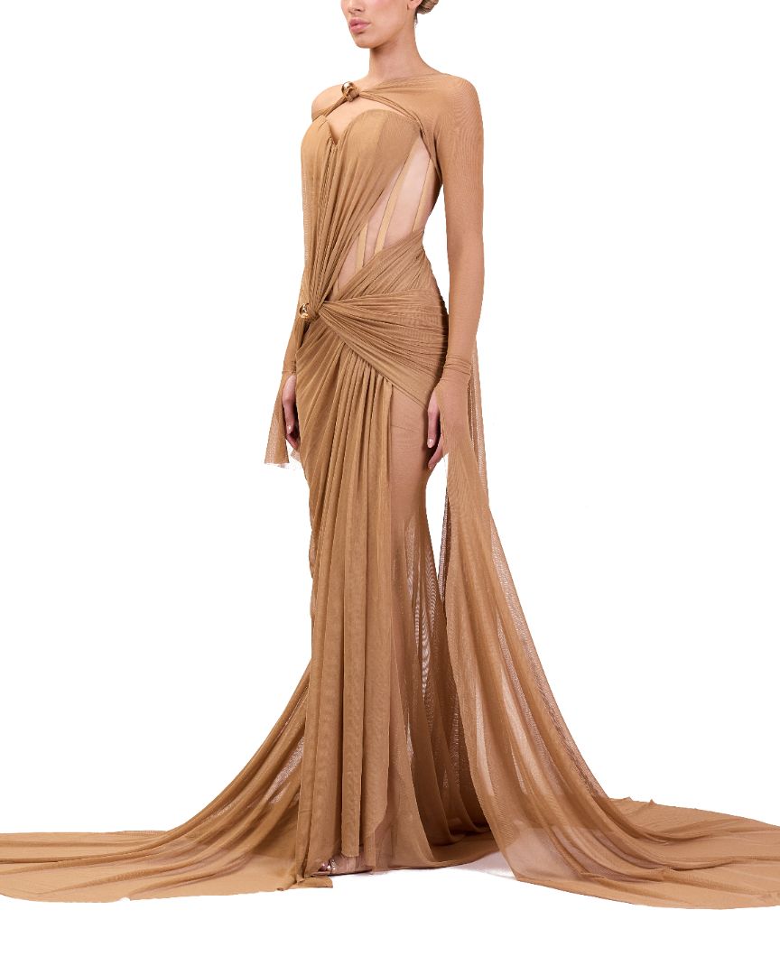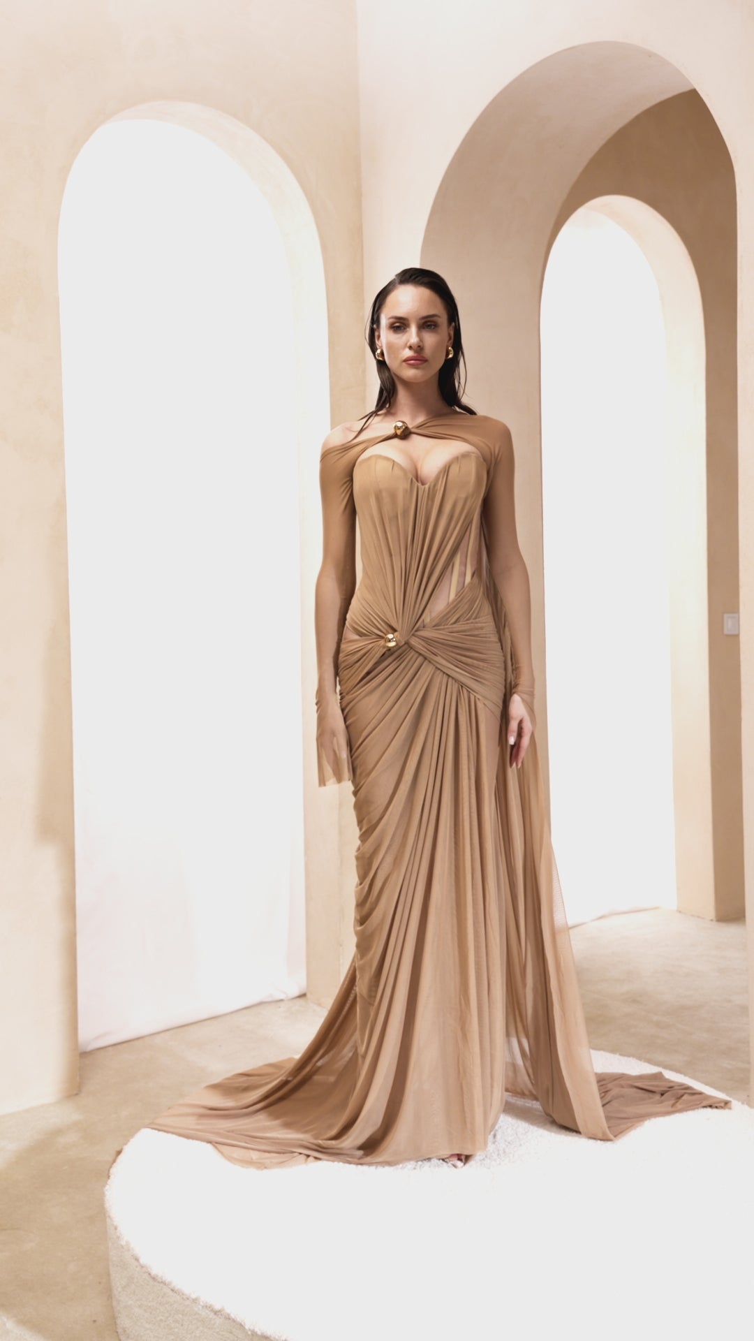 beige, sleeveless, maxi dress with a v-neck and a long train behind.
