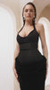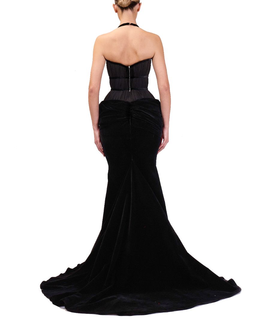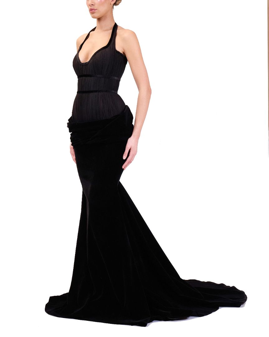Black evening gown, presented in a style suitable for red carpet events or formal gatherings. The gown is designed with a sleek, form-fitting bodice that includes a deep V-neckline, accentuating a graceful and refined appearance.
