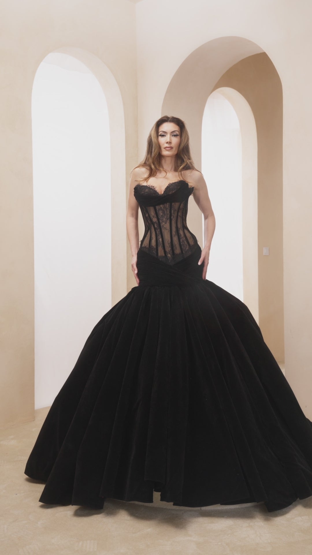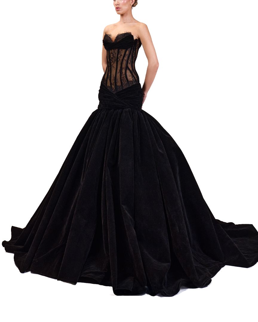 Black strapless, floor-length gown with a sweetheart neckline and a train.