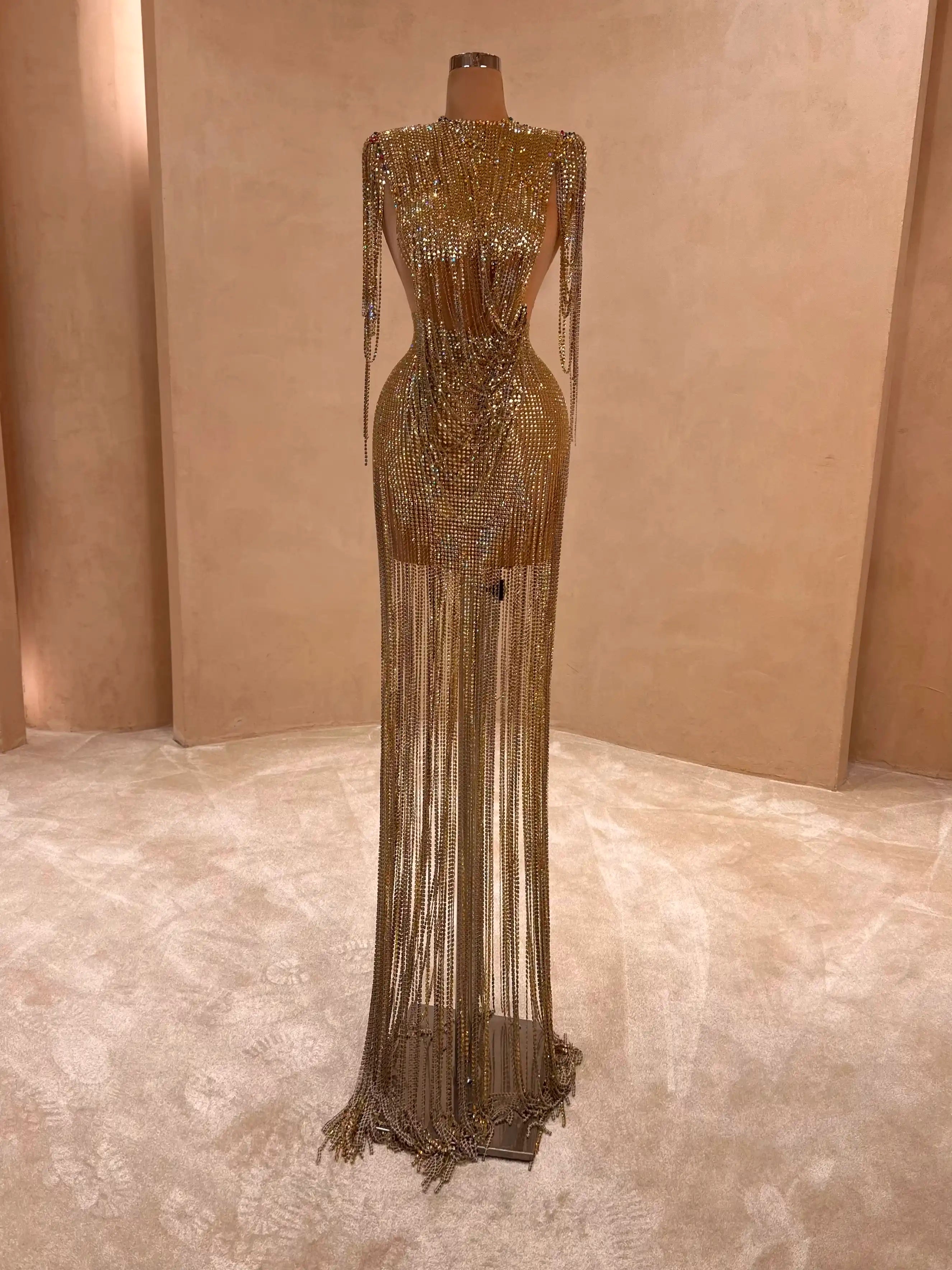 This golden fringed masterpiece hugs your curves with precision. Featuring a structured strapless silhouette with glittering beadwork and layers of gold fringe that sway as you walk, this gown is a true showstopper.