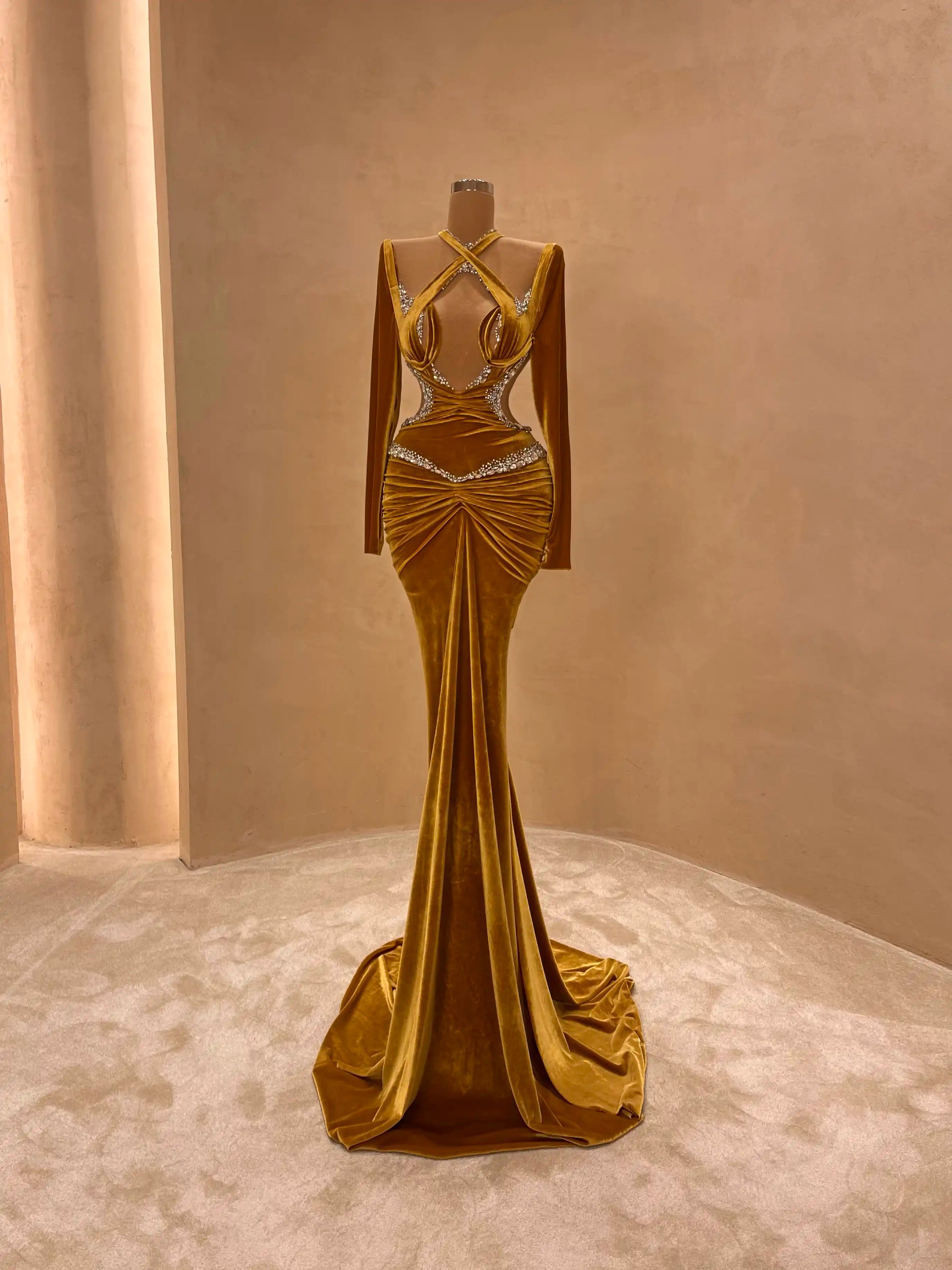 This golden velvet gown is a masterpiece of sculpted draping and sparkle. With one-shoulder styling and a crystal-detailed bust, it combines rich texture with red carpet-worthy glamour for a statement look that’s both modern and regal.