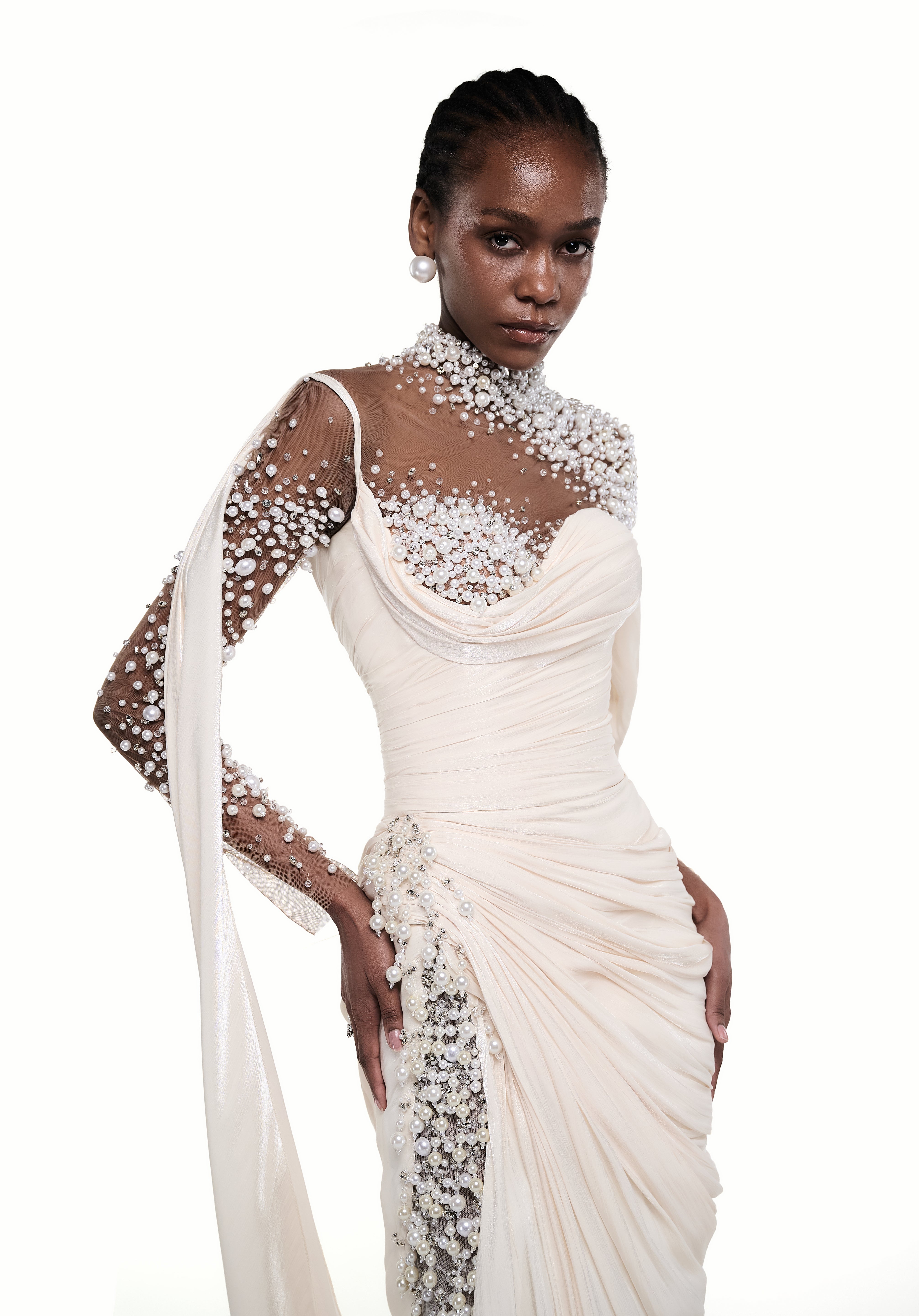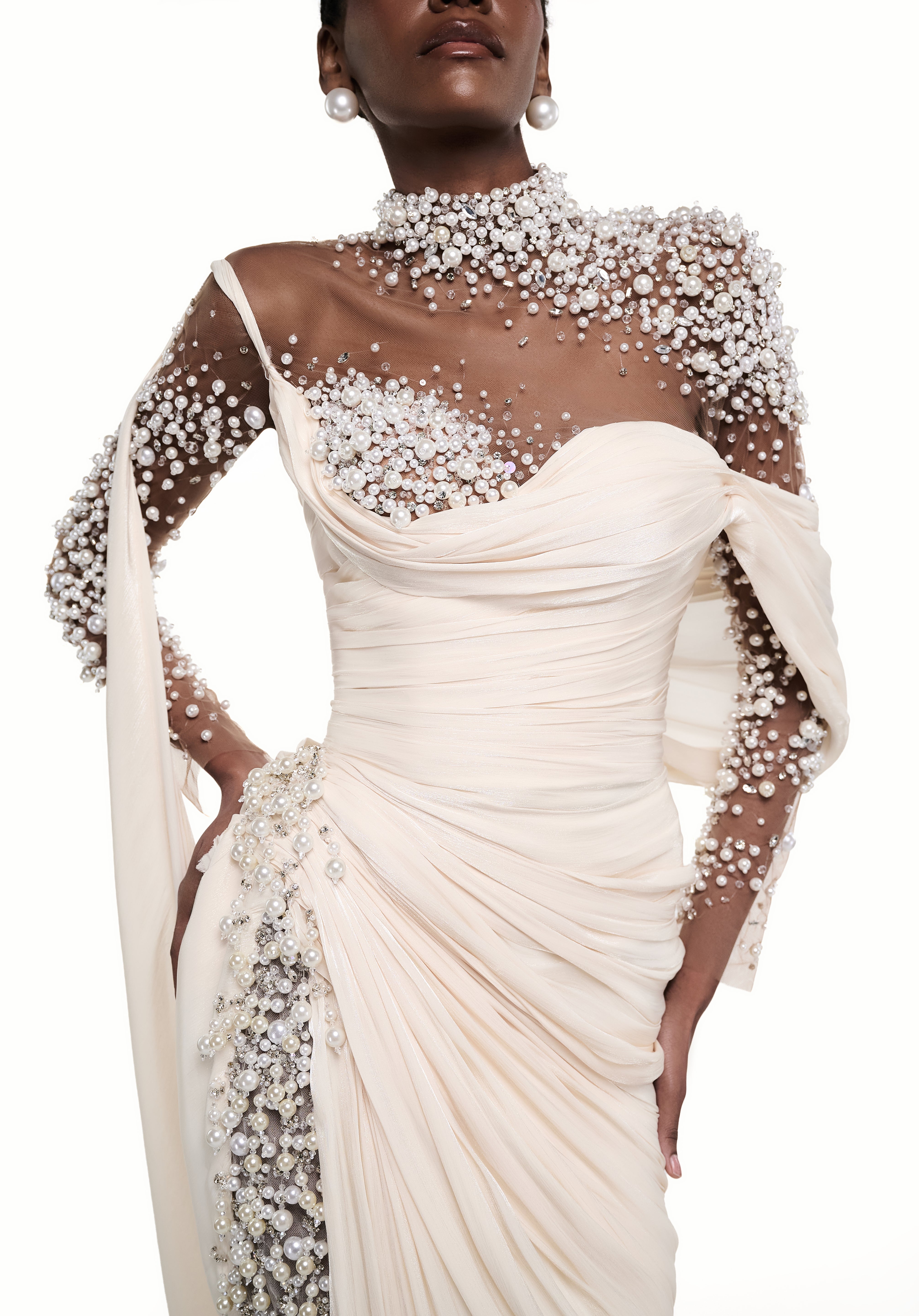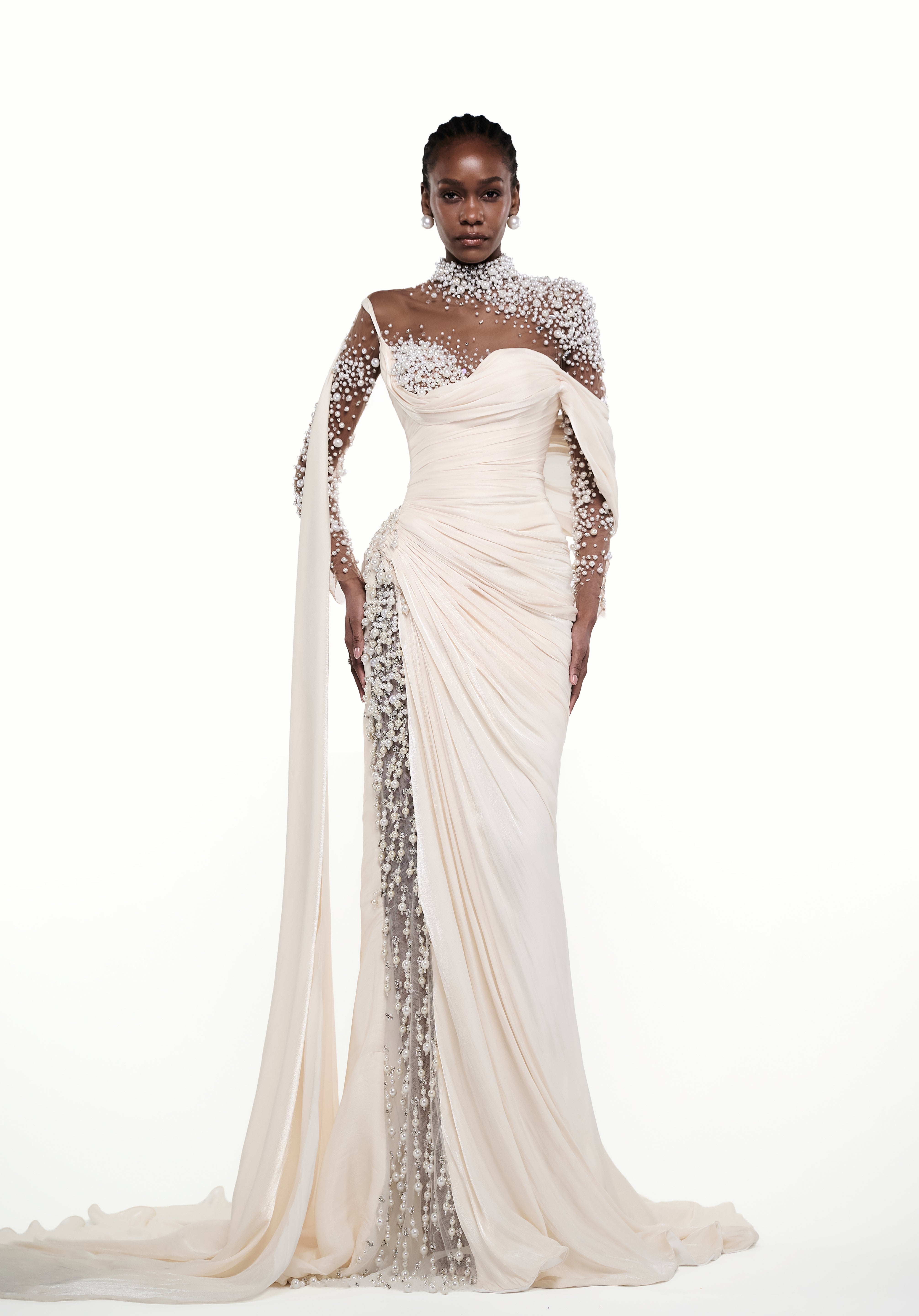 - High slit with fully embellished illusion panel in beadwork and pearls