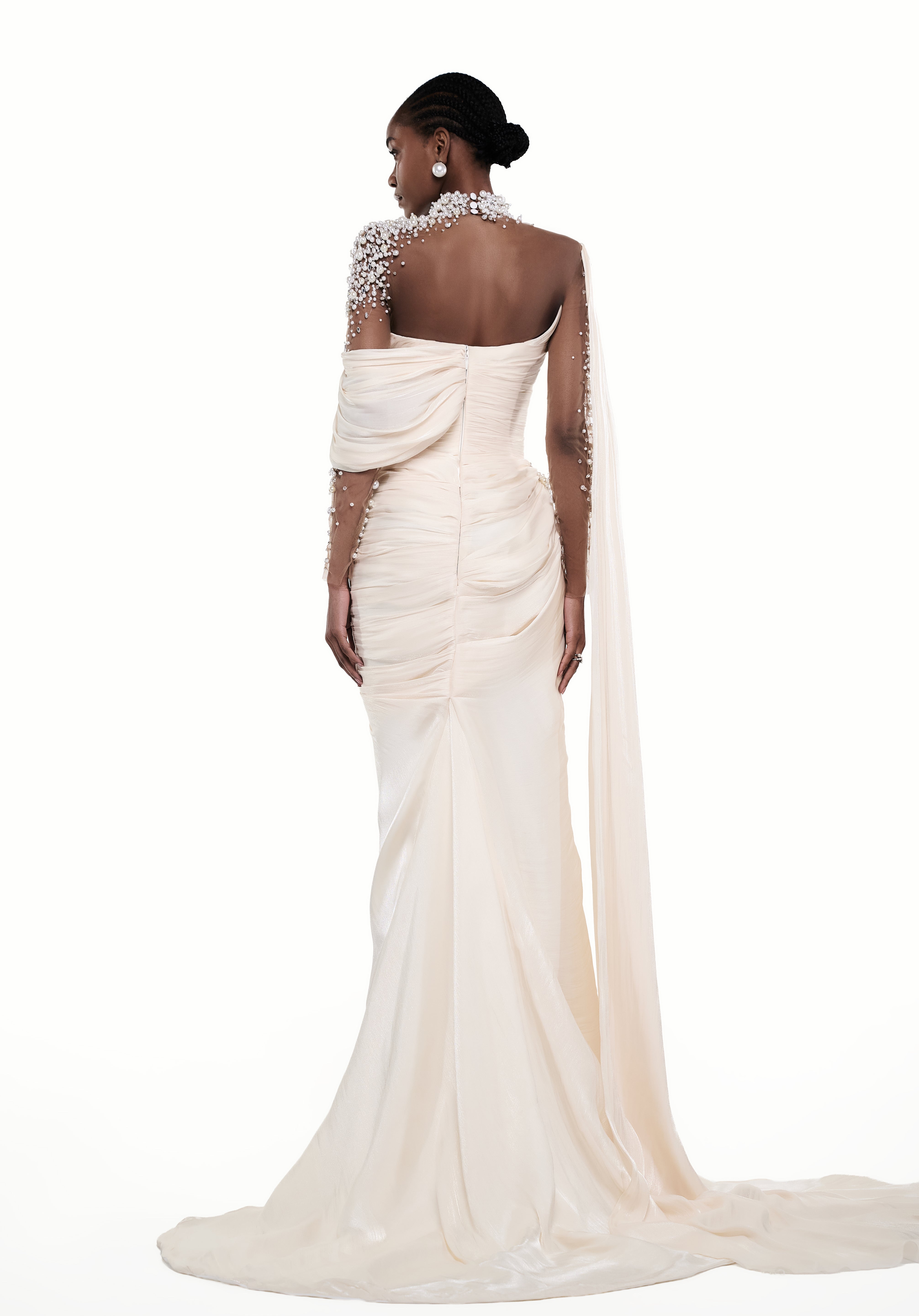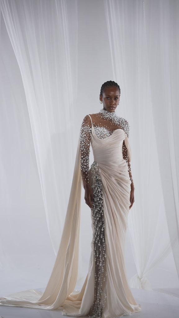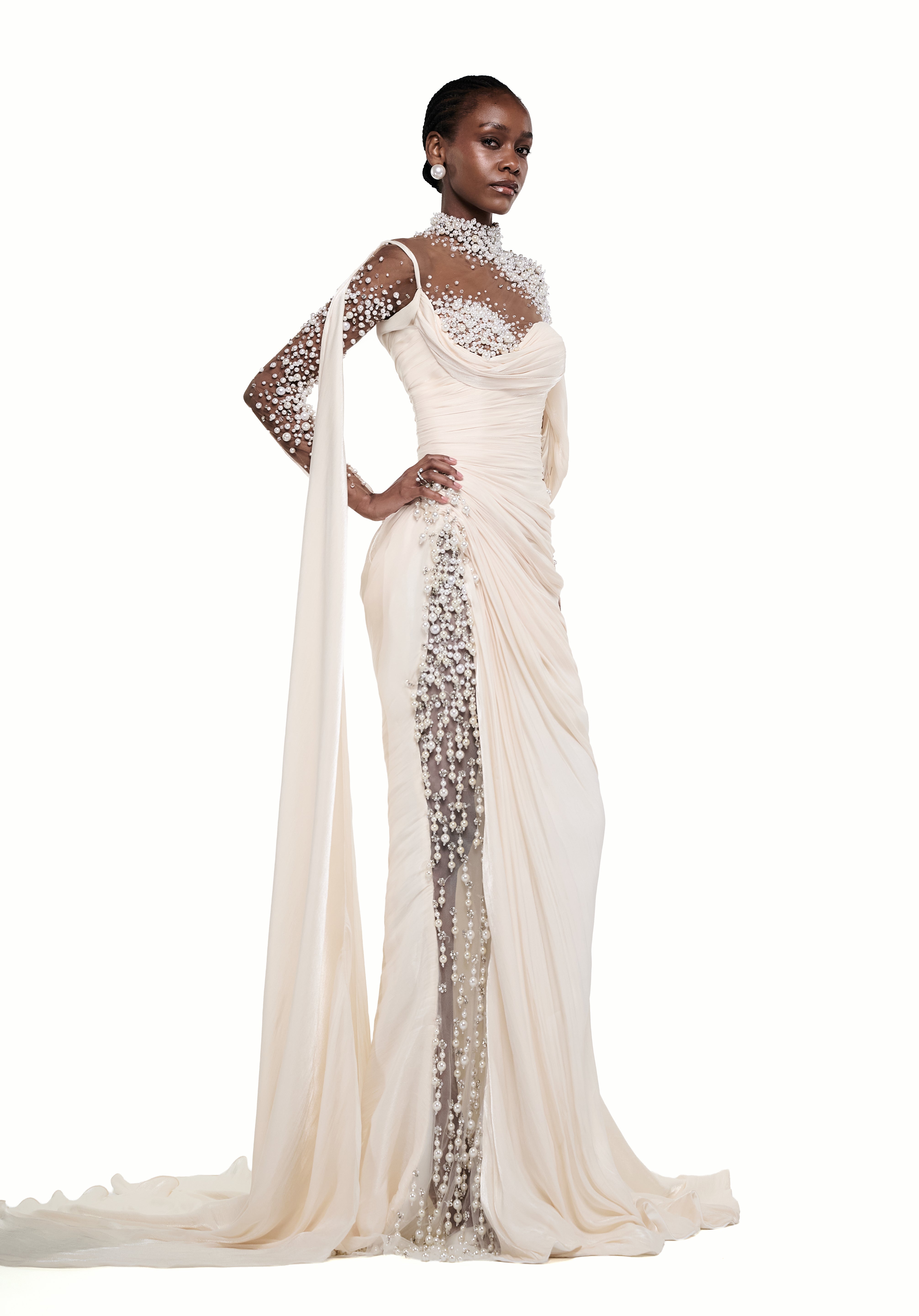- High slit with fully embellished illusion panel in beadwork and pearls