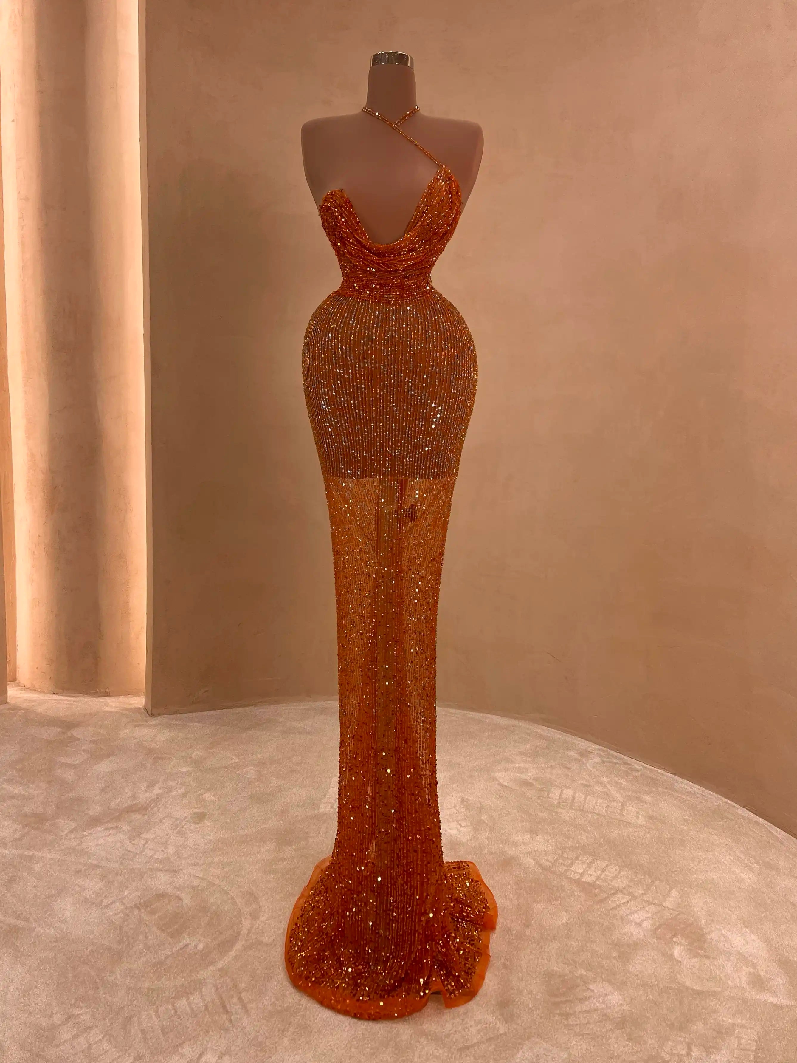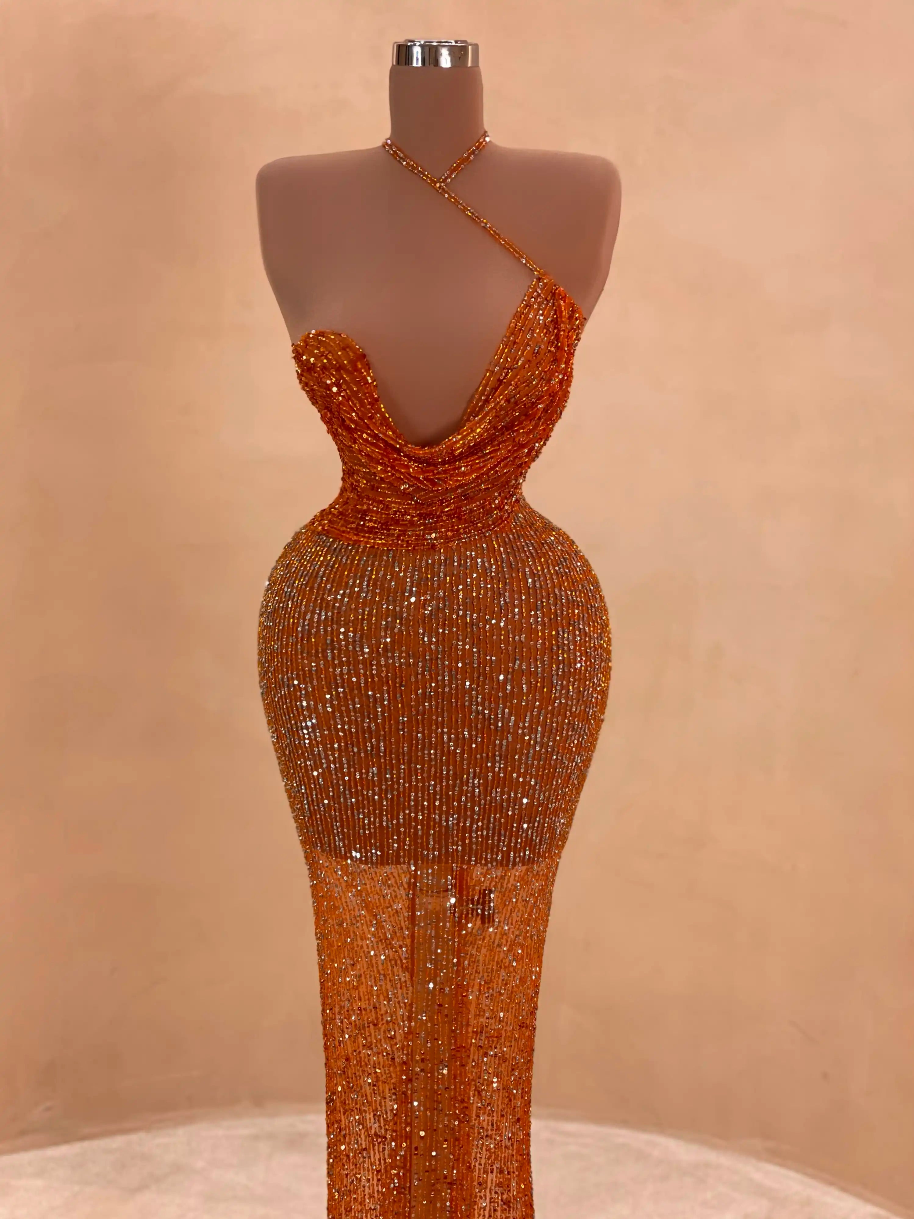 Bring the fire in this glowing orange sequin gown featuring a halter neckline and body-hugging silhouette. Perfect for sunset galas and statement red carpet moments.