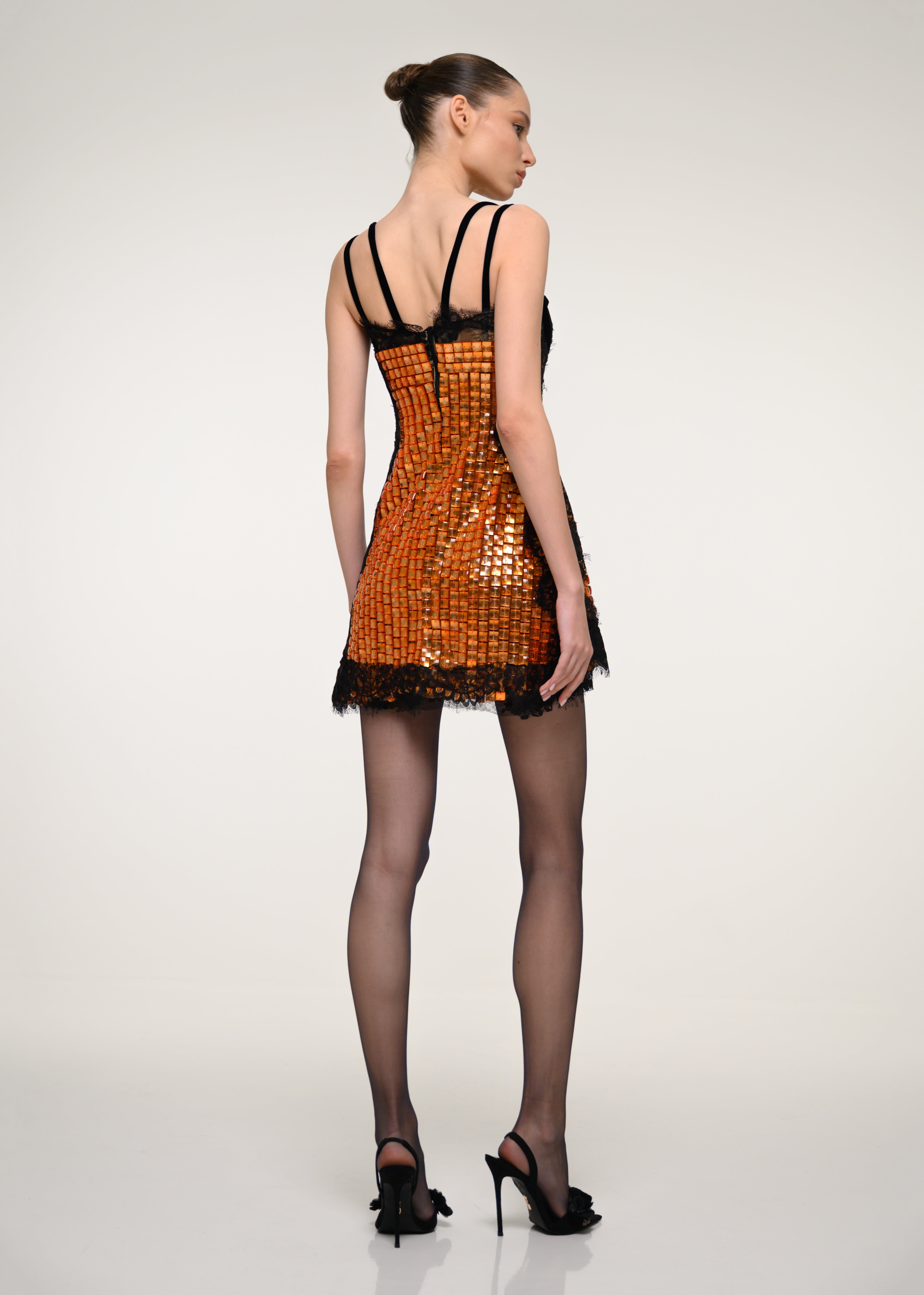 A daring mini dress adorned with orange sequins and framed by black lace - playful elegance crafted for confidence.