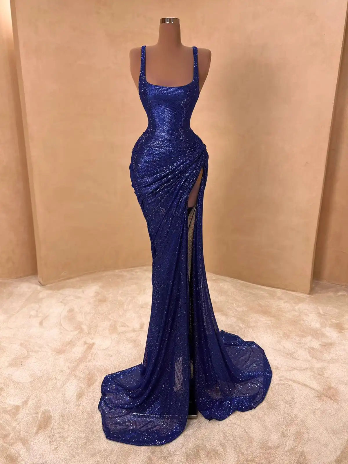 Sculptural and bold, this figure-hugging blue dress features a structured one-shoulder neckline, side cutout, and hand-beaded detailing. A couture piece made for dramatic entrances.