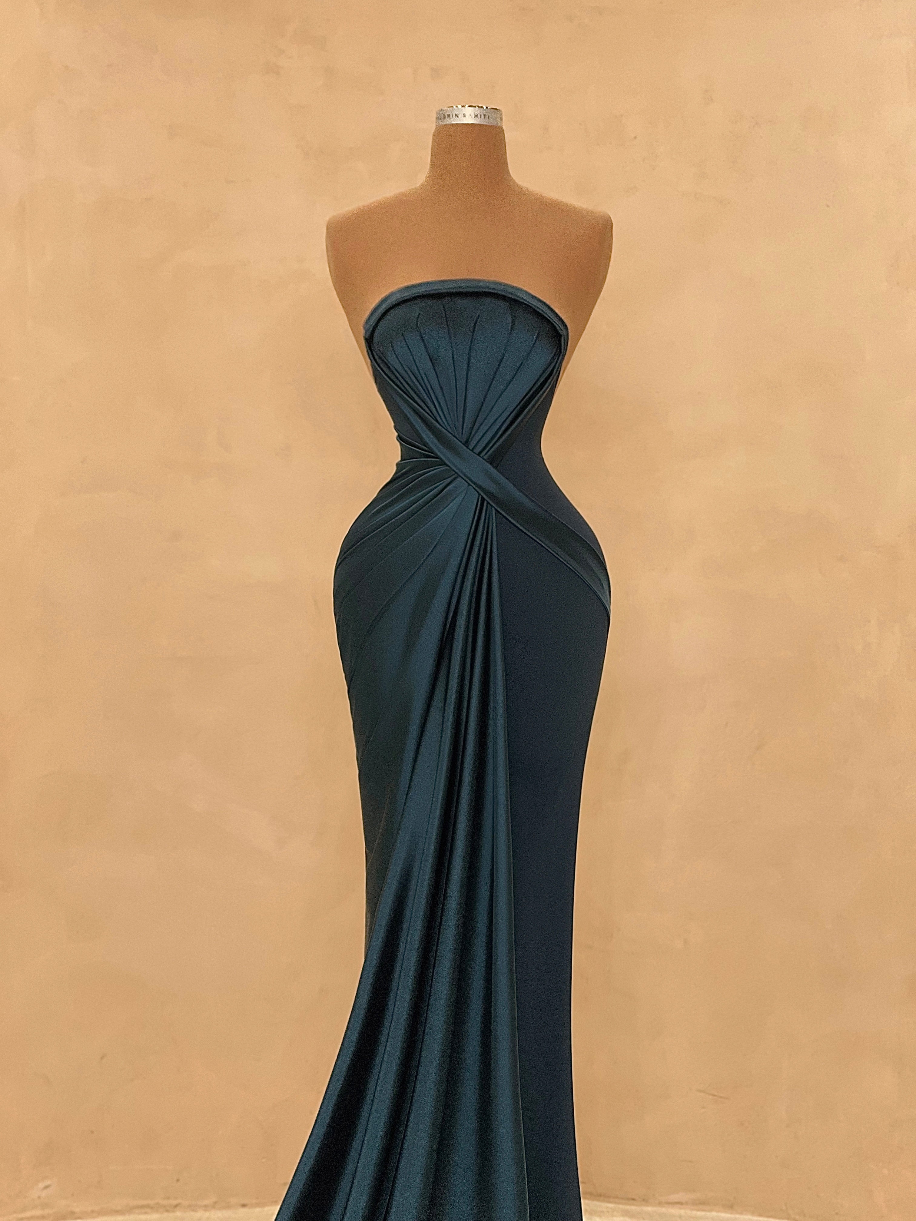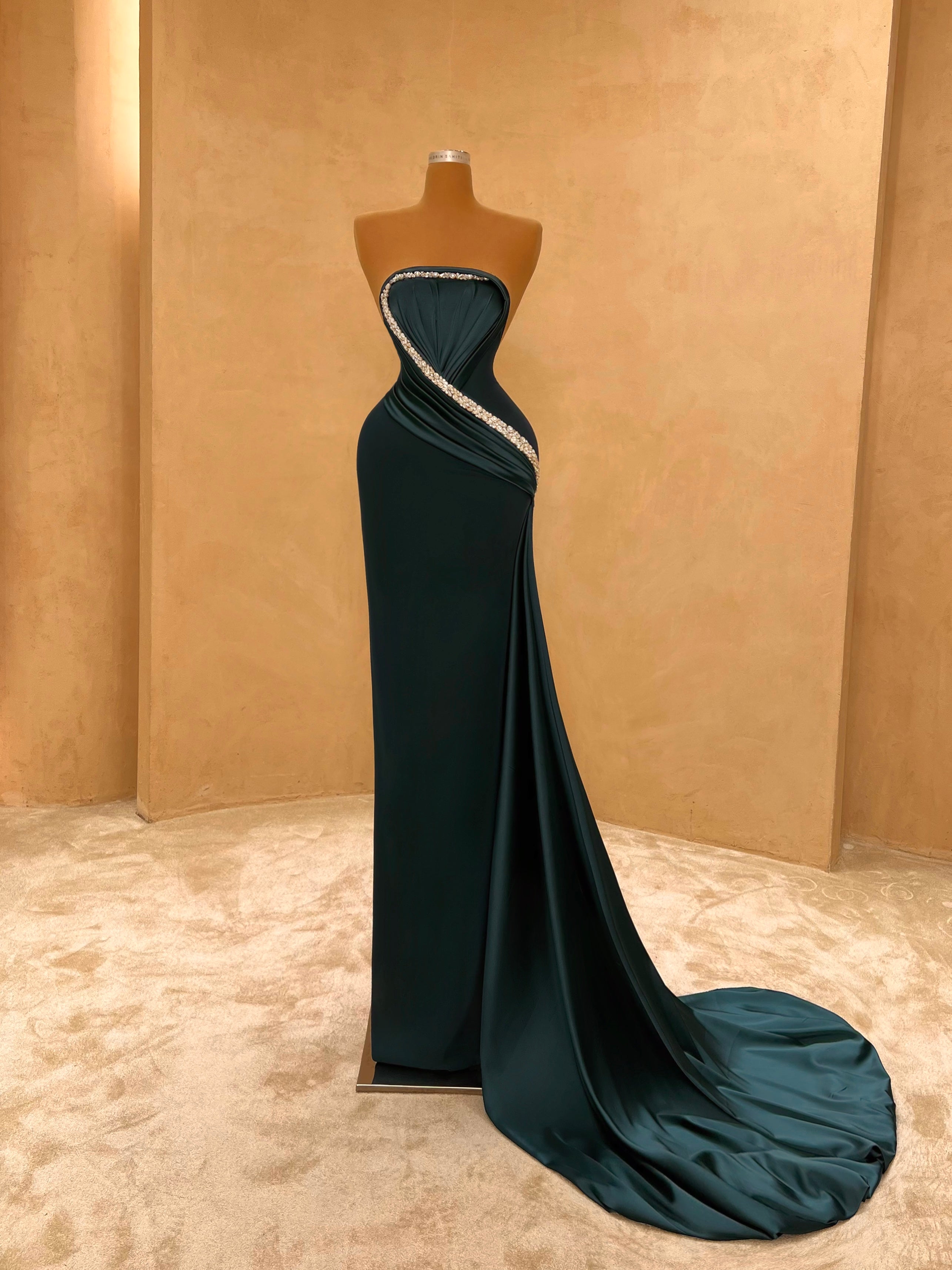 Sleek and refined, this emerald green gown boasts a strapless neckline and crystal-lined asymmetric fold detailing. The soft, flowing fabric and thigh slit bring grace and movement, perfect for luxury weddings, evening galas, or high-end receptions.