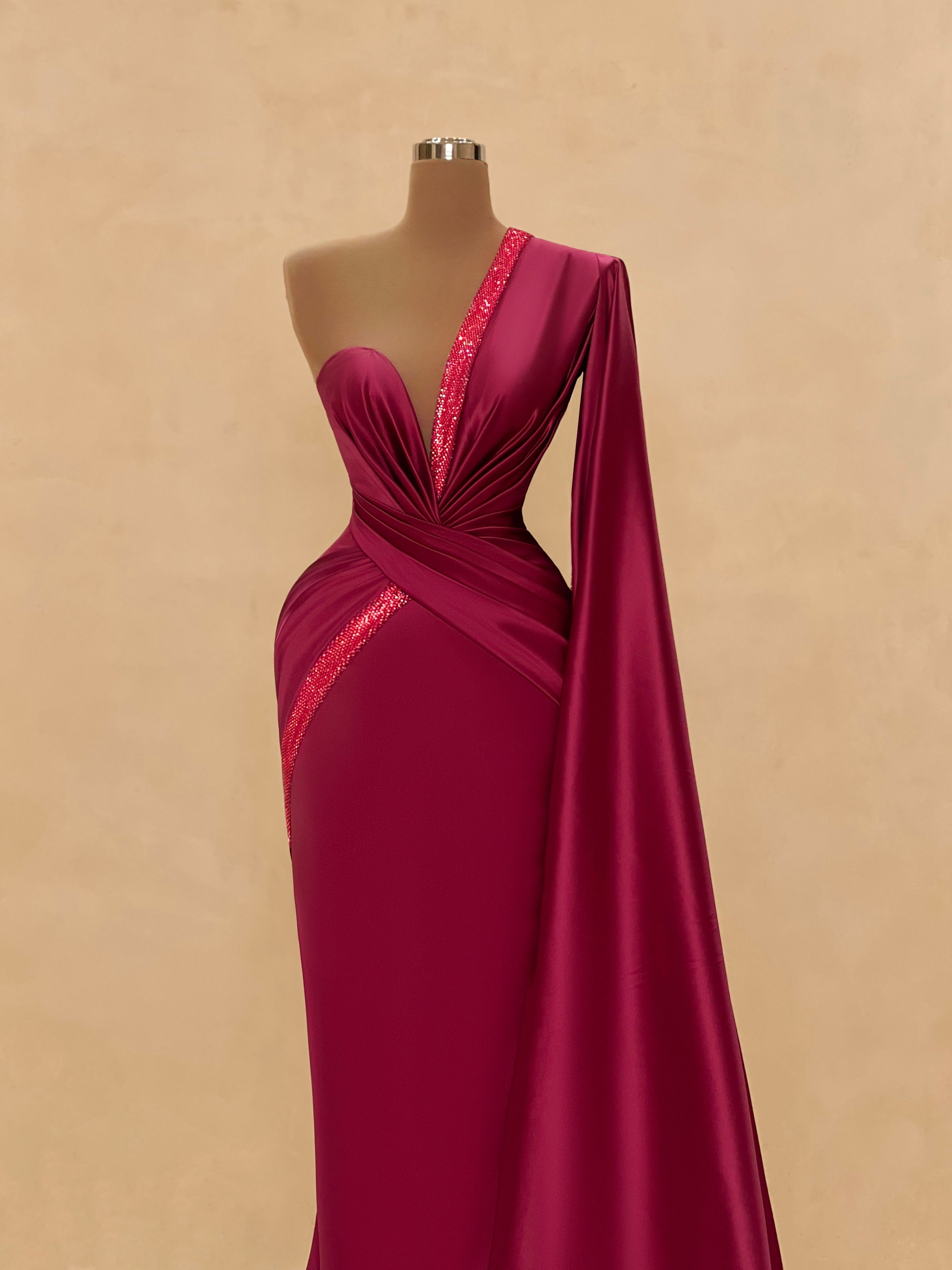 Chic and vibrant, this raspberry pink gown features one-shoulder draping, a ruched bodice, and sculpting pleats across the waist. The asymmetric neckline and side slit give it a modern edge, making it a standout look for weddings or cocktail receptions.