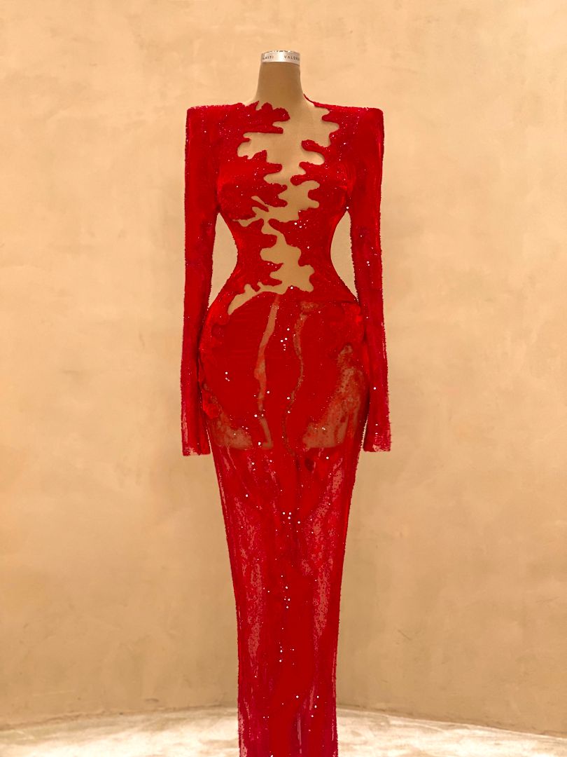 Fierce and unforgettable, this one-shoulder red gown dazzles with sequin and crystal embroidery. Featuring a structured neckline and extended train, it combines confidence and class. Best worn for special red carpet events, fashion galas, or high-end parties.