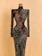This breathtaking long-sleeve dress is covered in intricate black and silver sequin embellishments, sculpting the body in a mesmerizing hourglass silhouette. Featuring a high neckline and sheer panels, this dress is designed to turn heads. Ideal for black-tie events, red carpet appearances, or upscale parties.