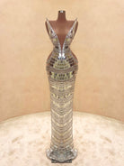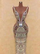 A true work of art, this mirror-embellished dress reflects glamour from every angle. Designed in a structured silhouette with a strapless neckline, the dress sculpts the body with carefully arranged metallic panels. The mosaic-like finish catches the light dramatically, making it ideal for galas, stage appearances, or luxury photo shoots.