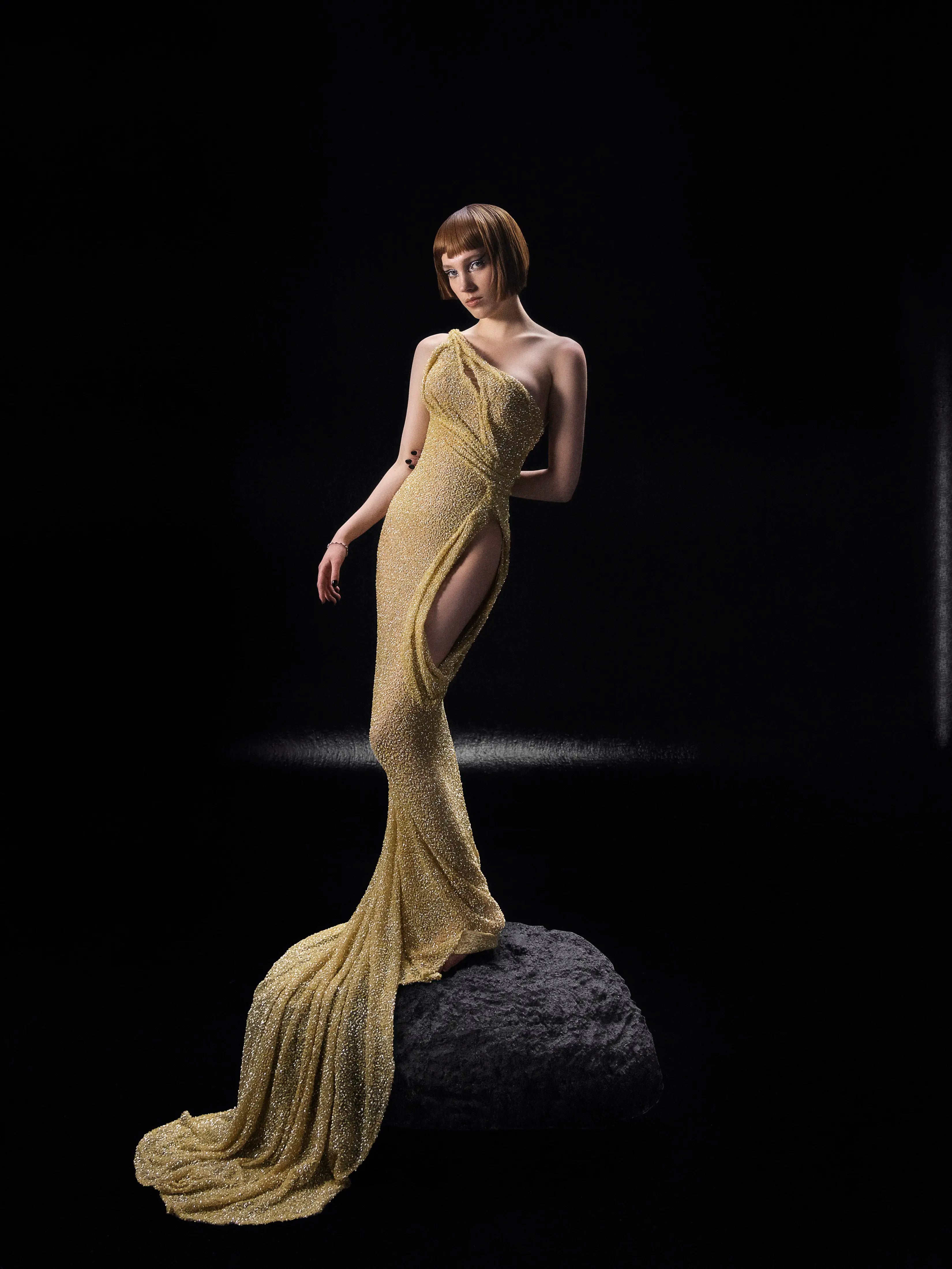 - Fitted silhouette in shimmering gold textured fabric