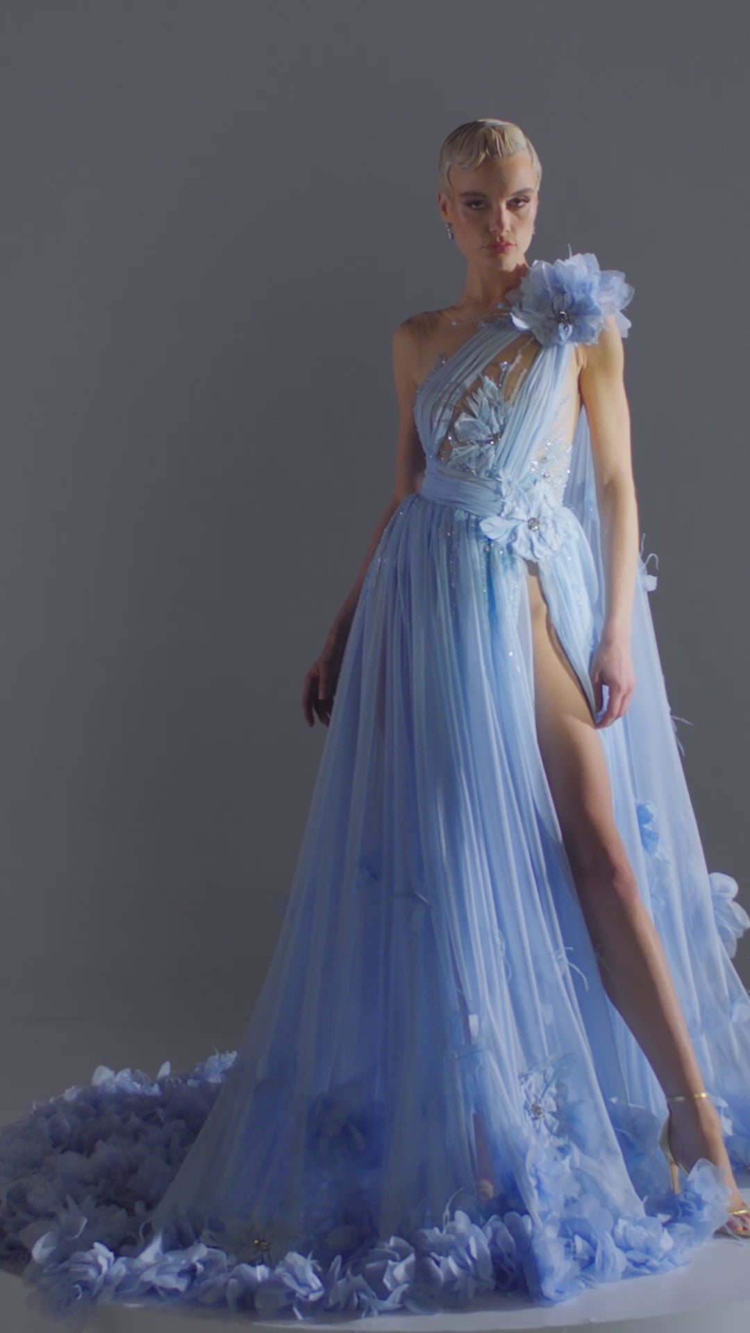 - Soft sky-blue tulle base with 3D floral appliqués