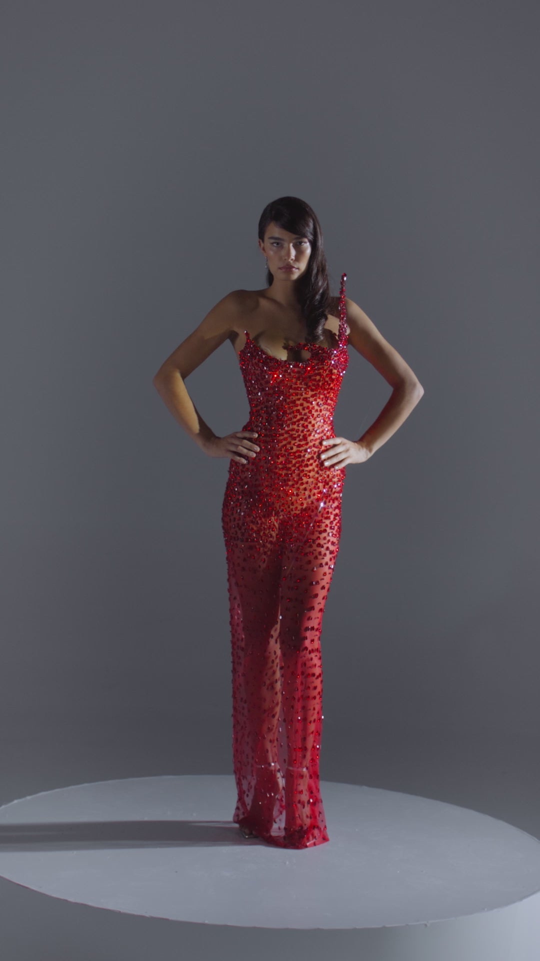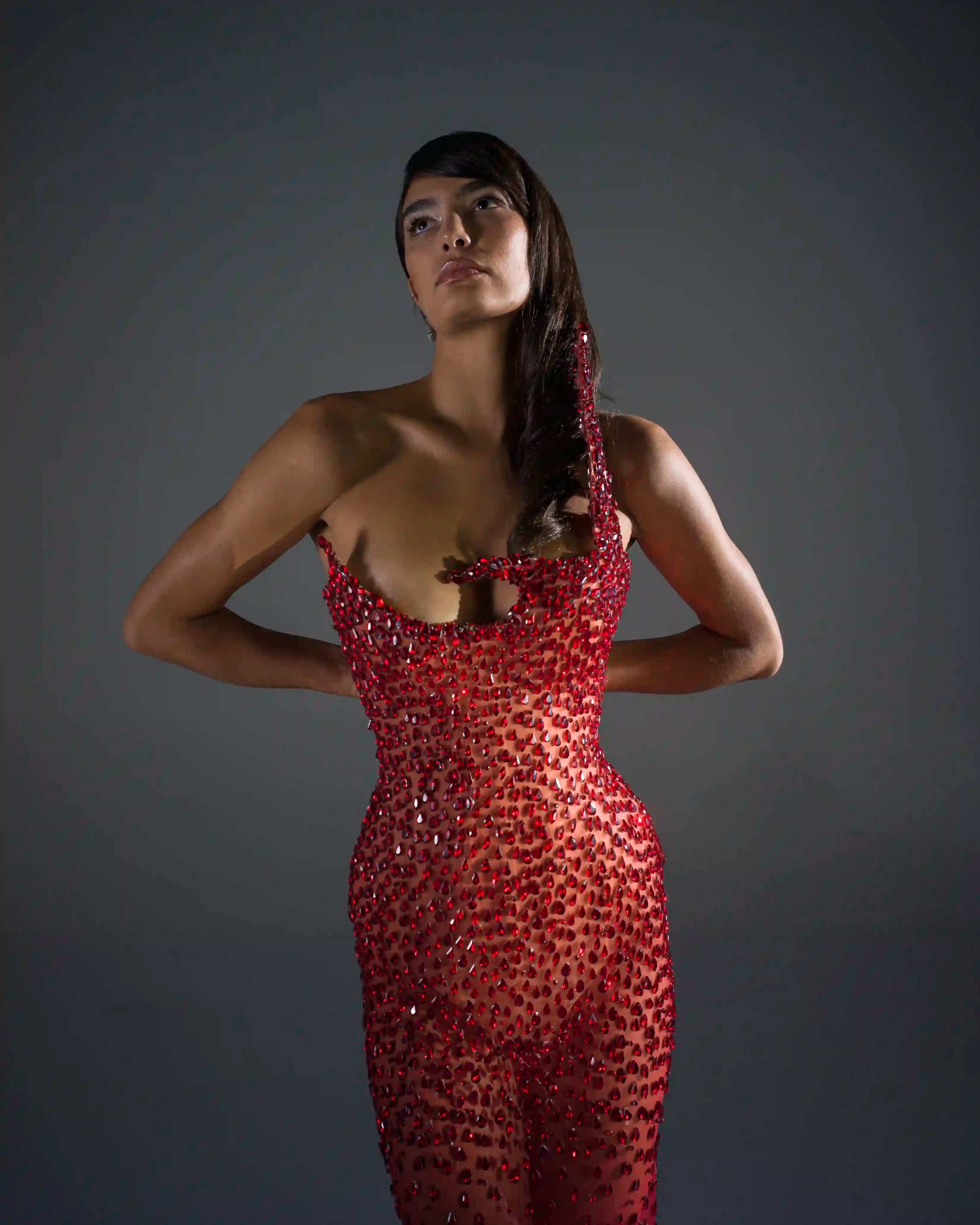 - Sheer red mesh gown with full crystal embellishment