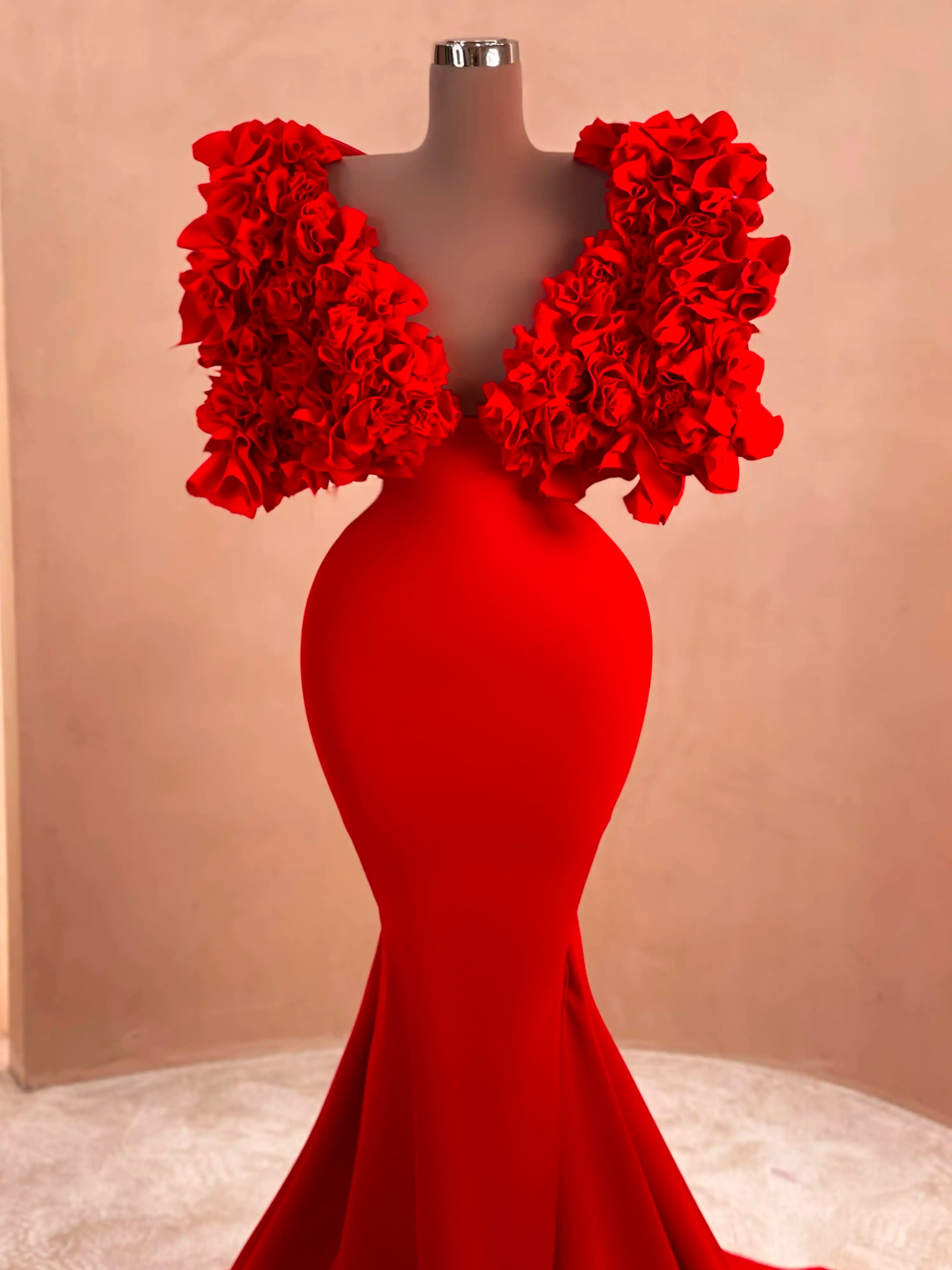 Power and elegance unite in this striking red gown with a high neckline, structured cutout waist, and sleek long sleeves. The rich silhouette is perfect for commanding presence at high-fashion events.