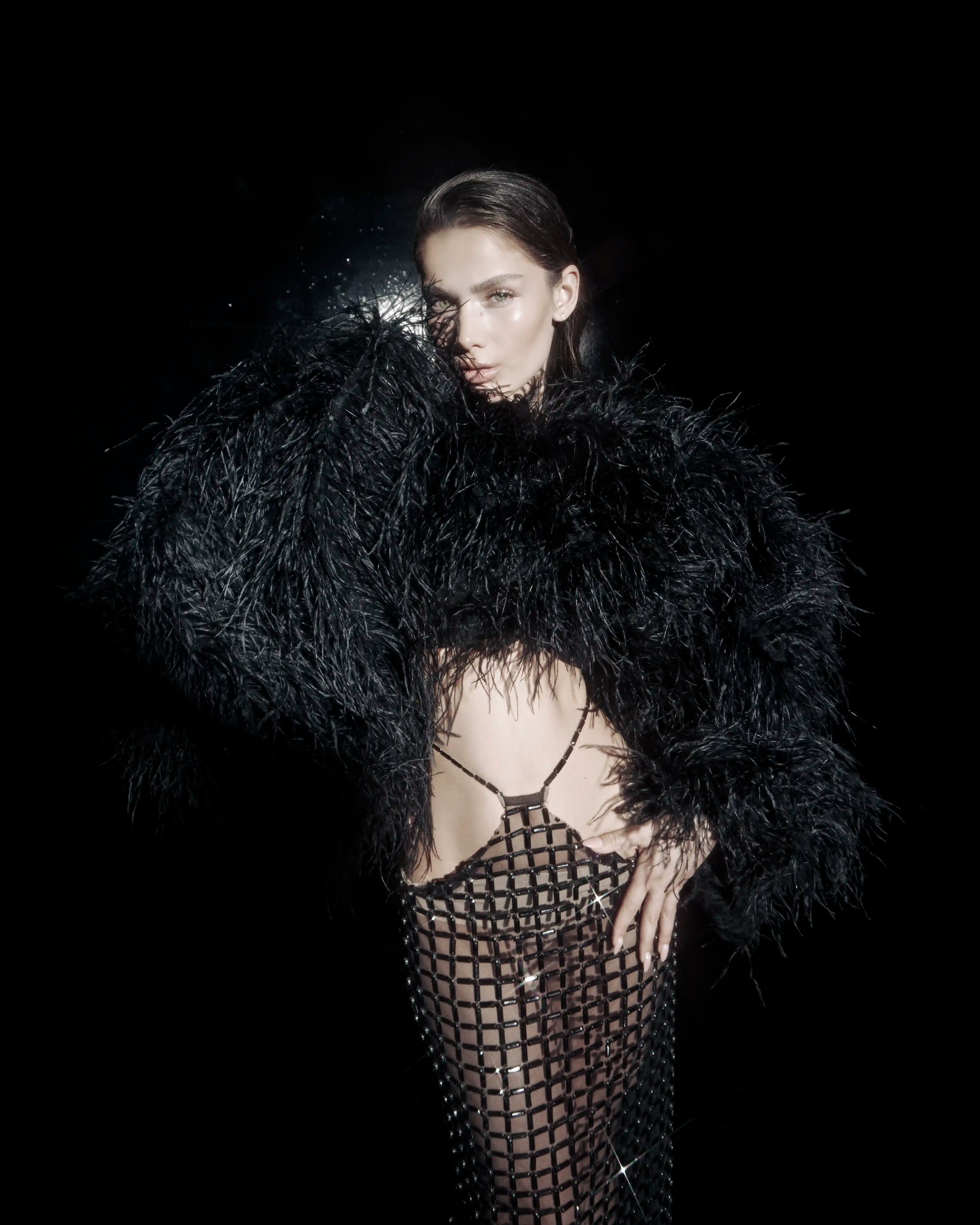 Long-Sleeve Black Feathered Top Dress with Midriff Cut-Out and Semi-Transparent Squared Sequin Skirt