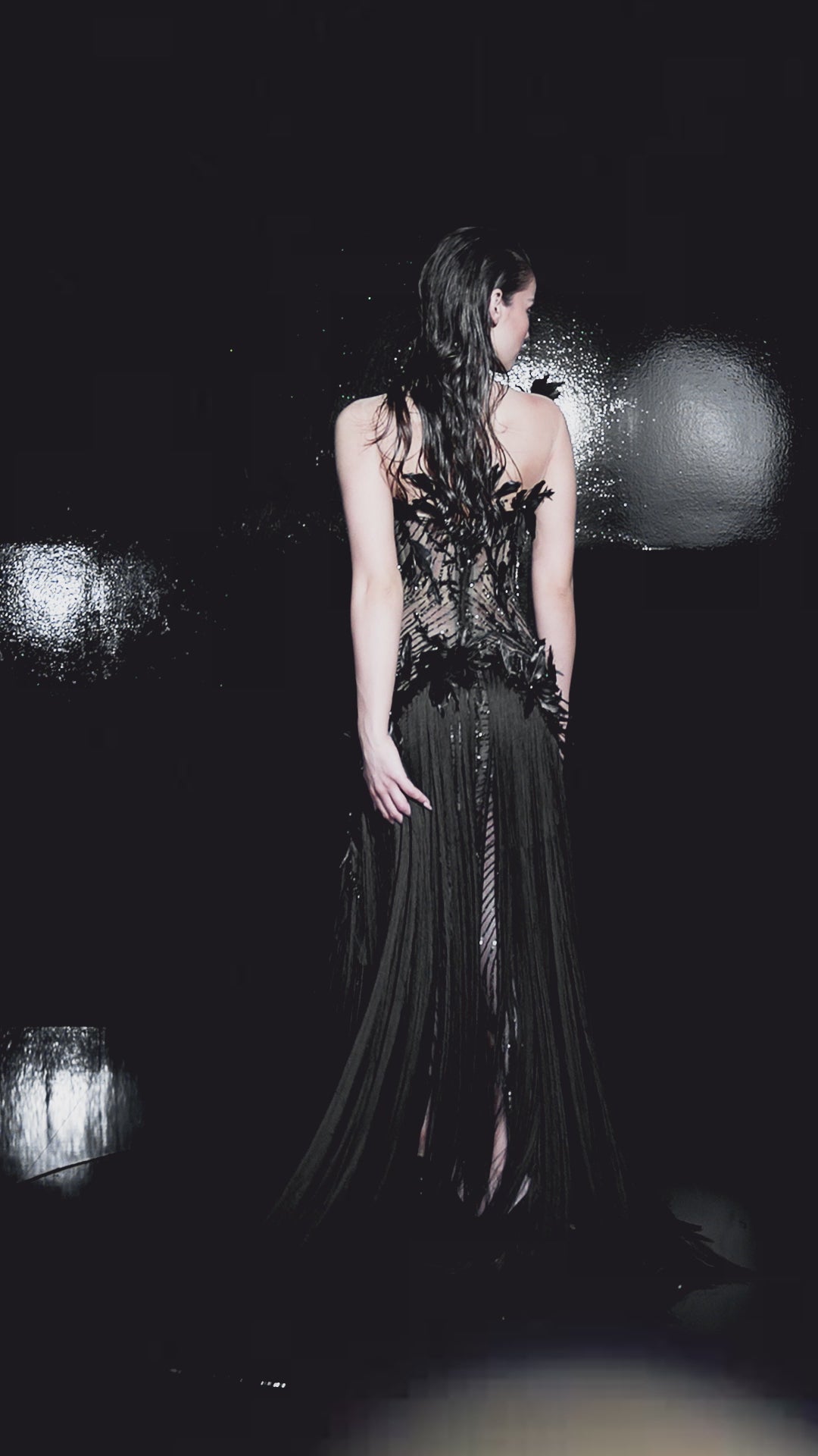 Long Strapless Dress with Black Fabric, Feathered Top, and Fringe Skirt